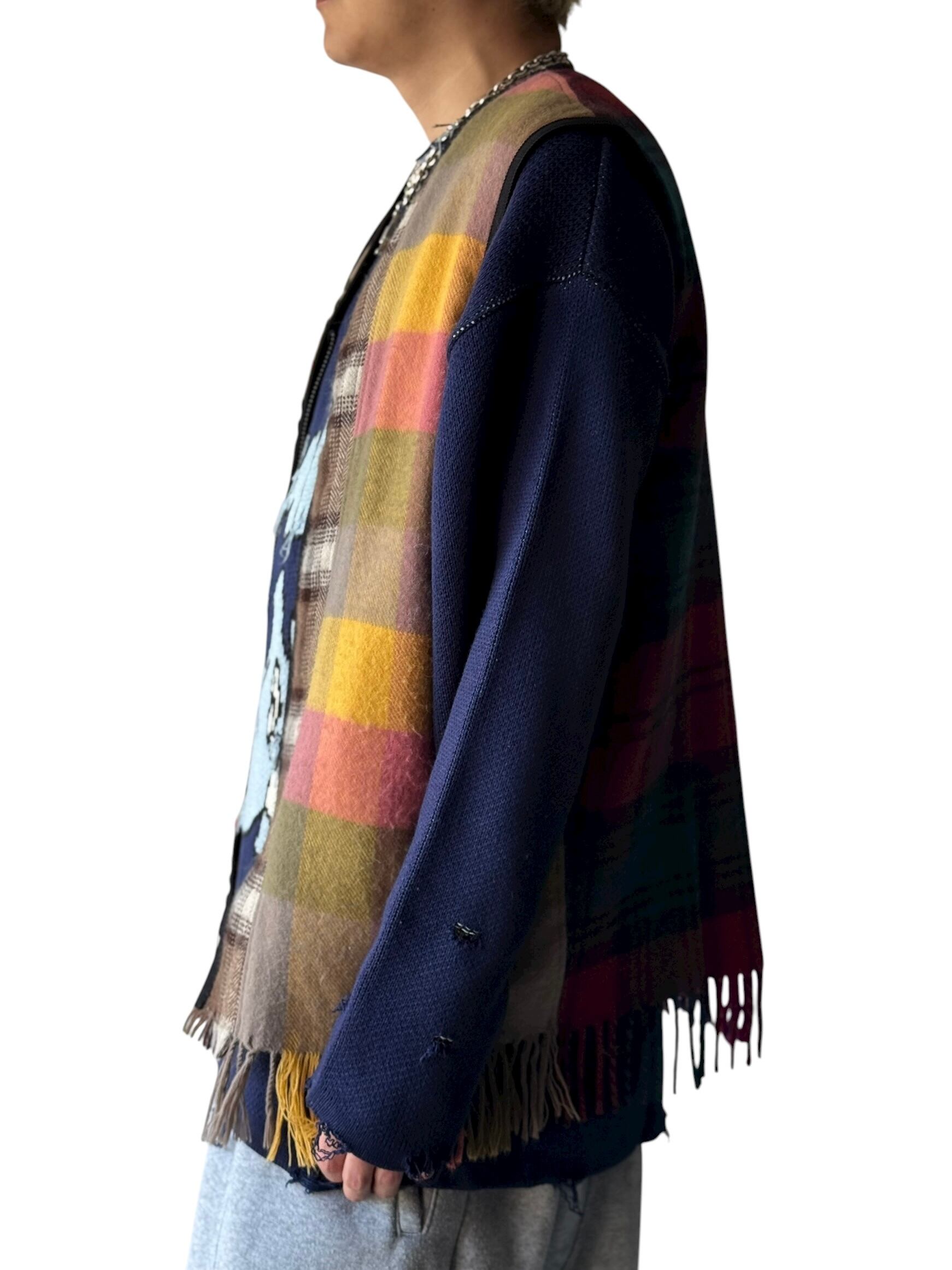 マフラーをもとに使ったかのようなフリンジと、パッチワークのバランスが凄まじく良い☺️❤️ ウール生地の厚みもあるのでレイヤードでしっかり暖かく防寒性も✨