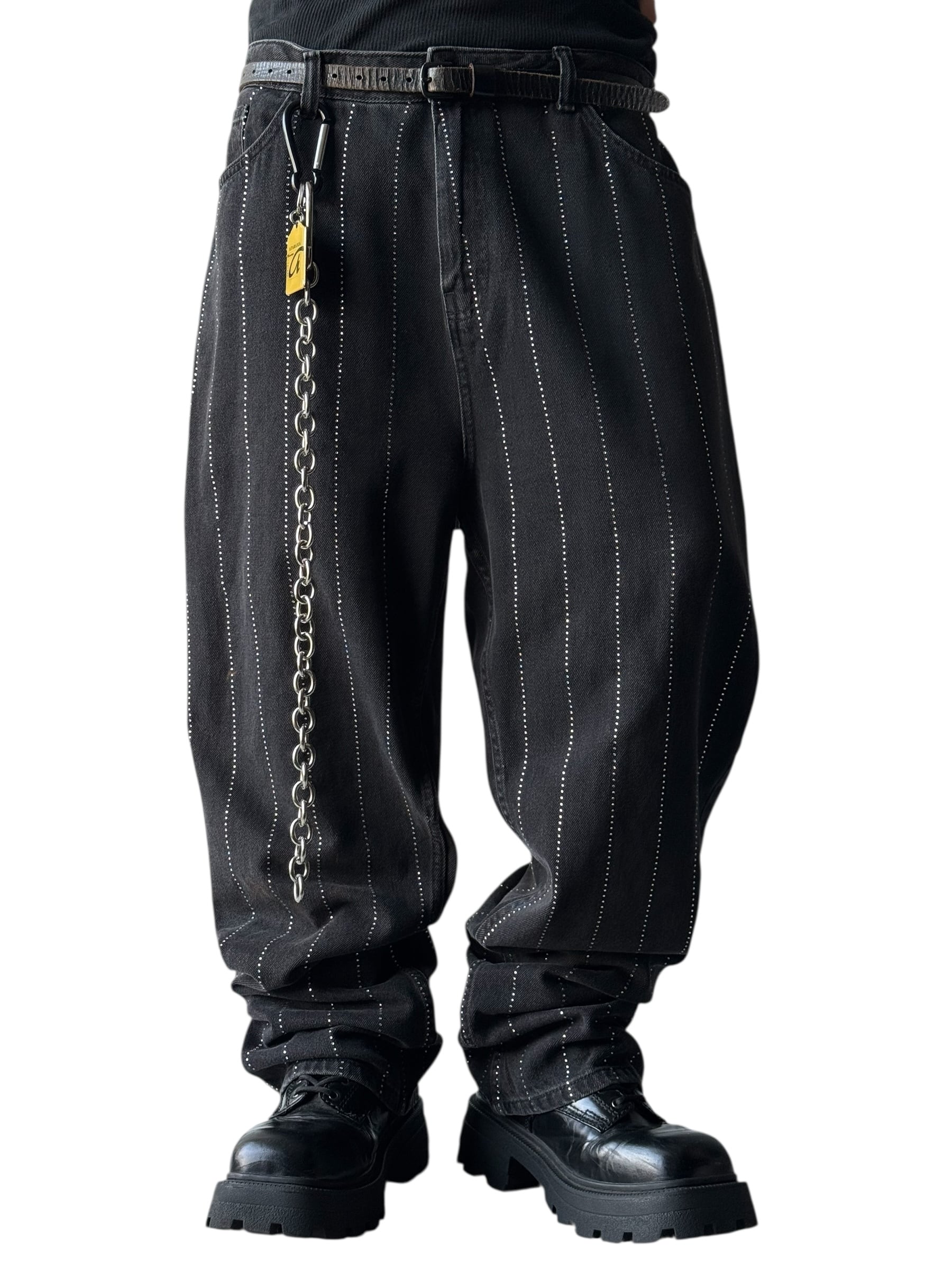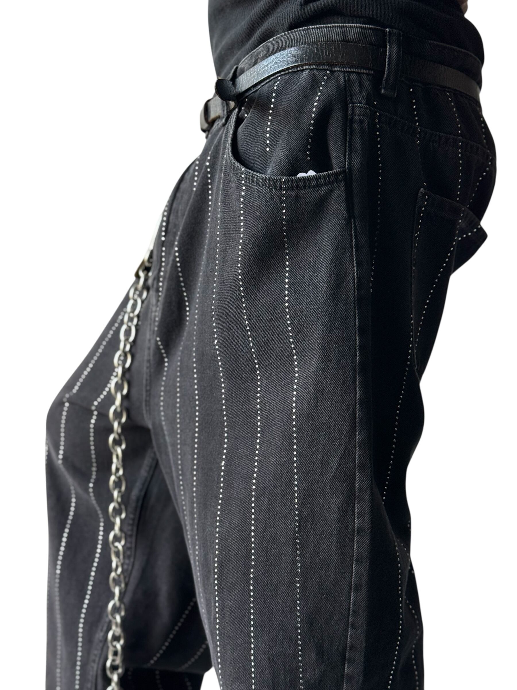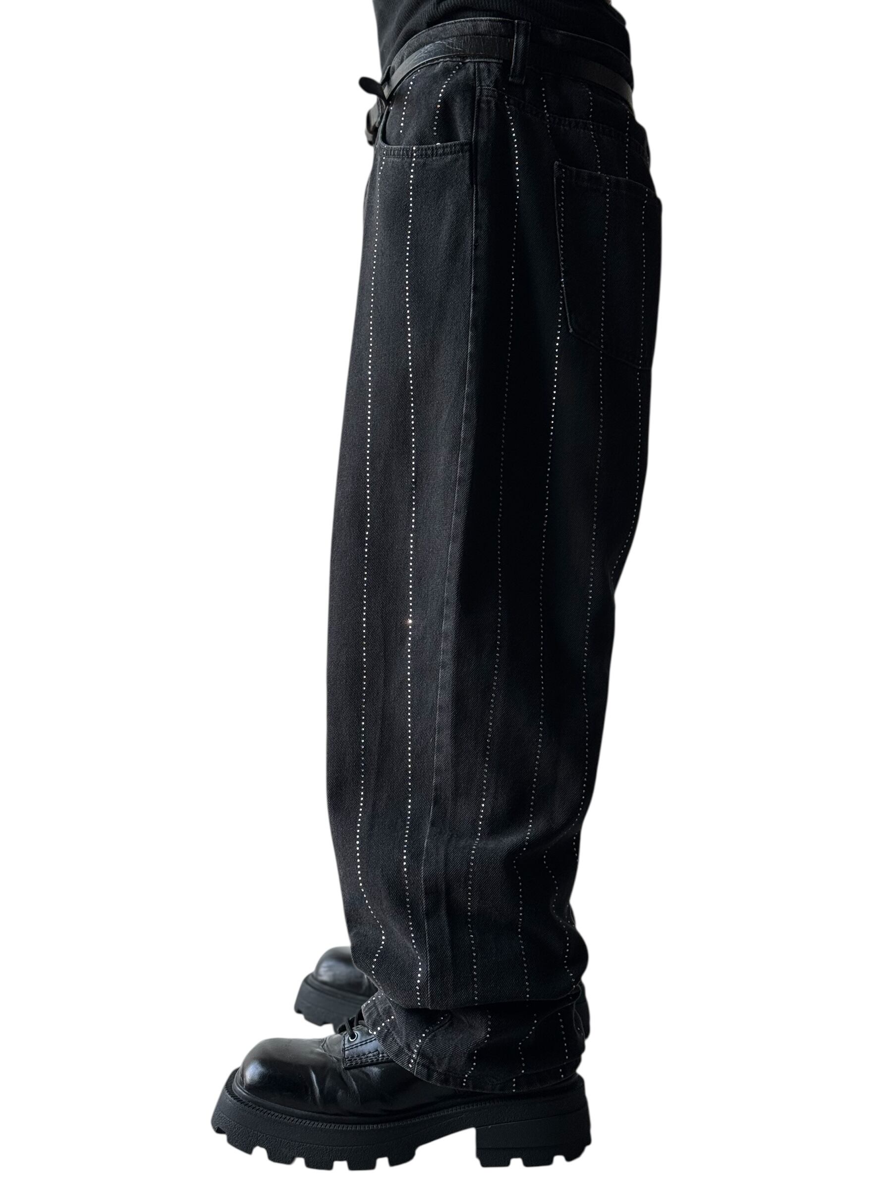 Rhinestone Striped Wide Silhouette Denim Pants