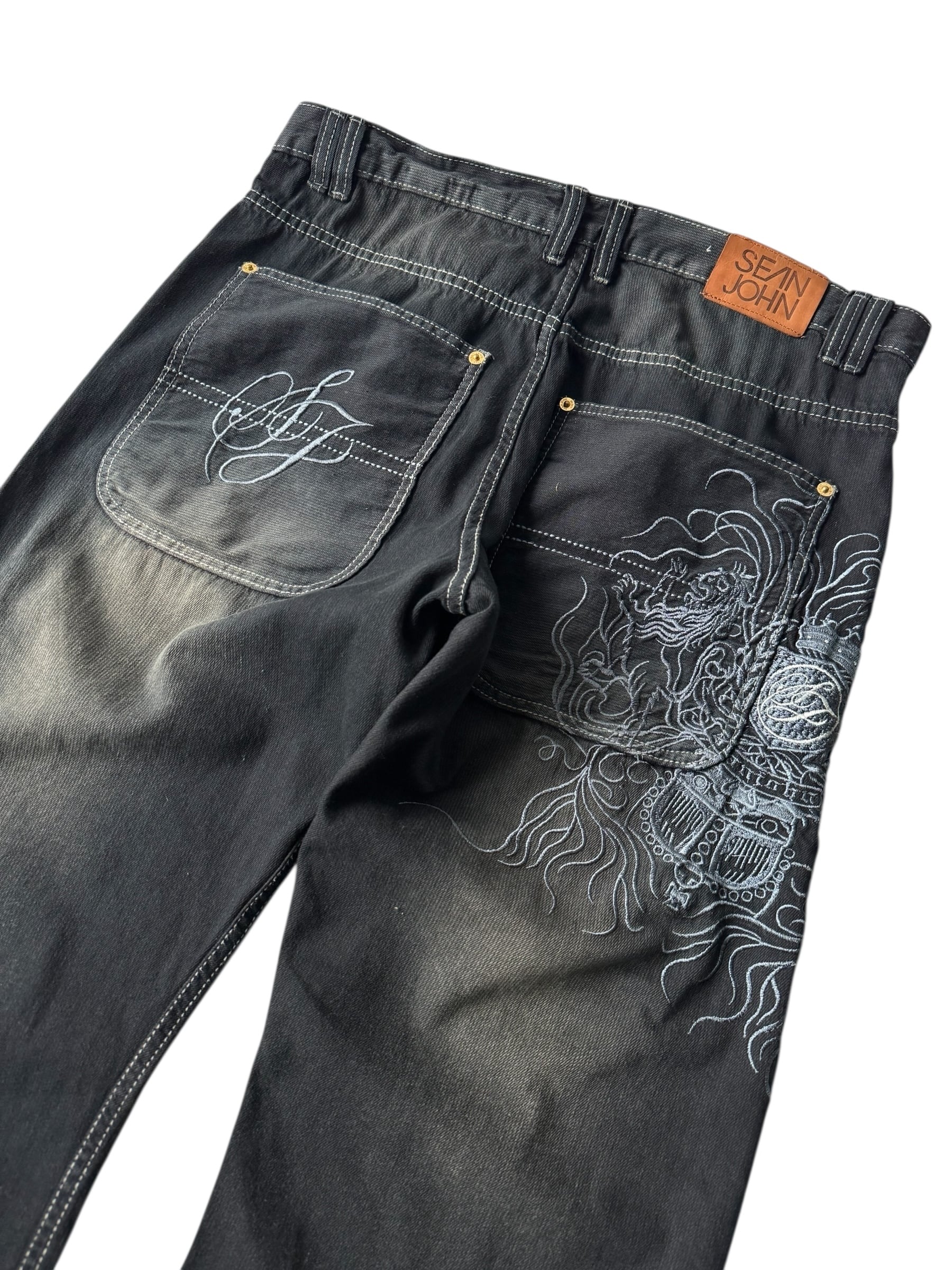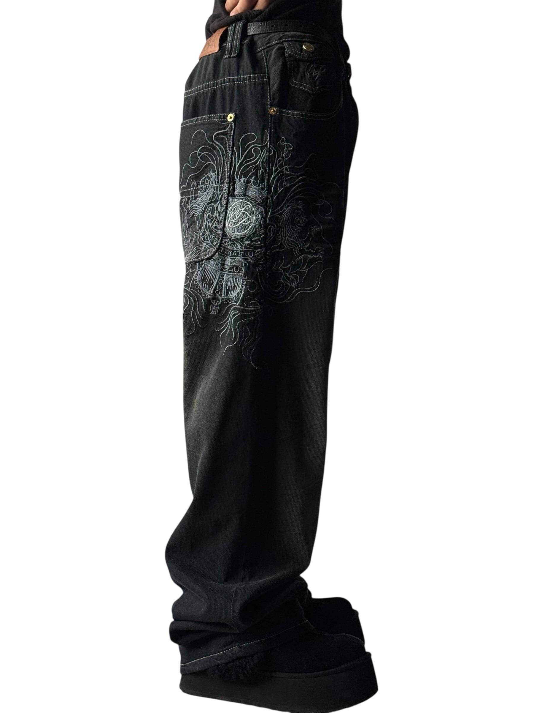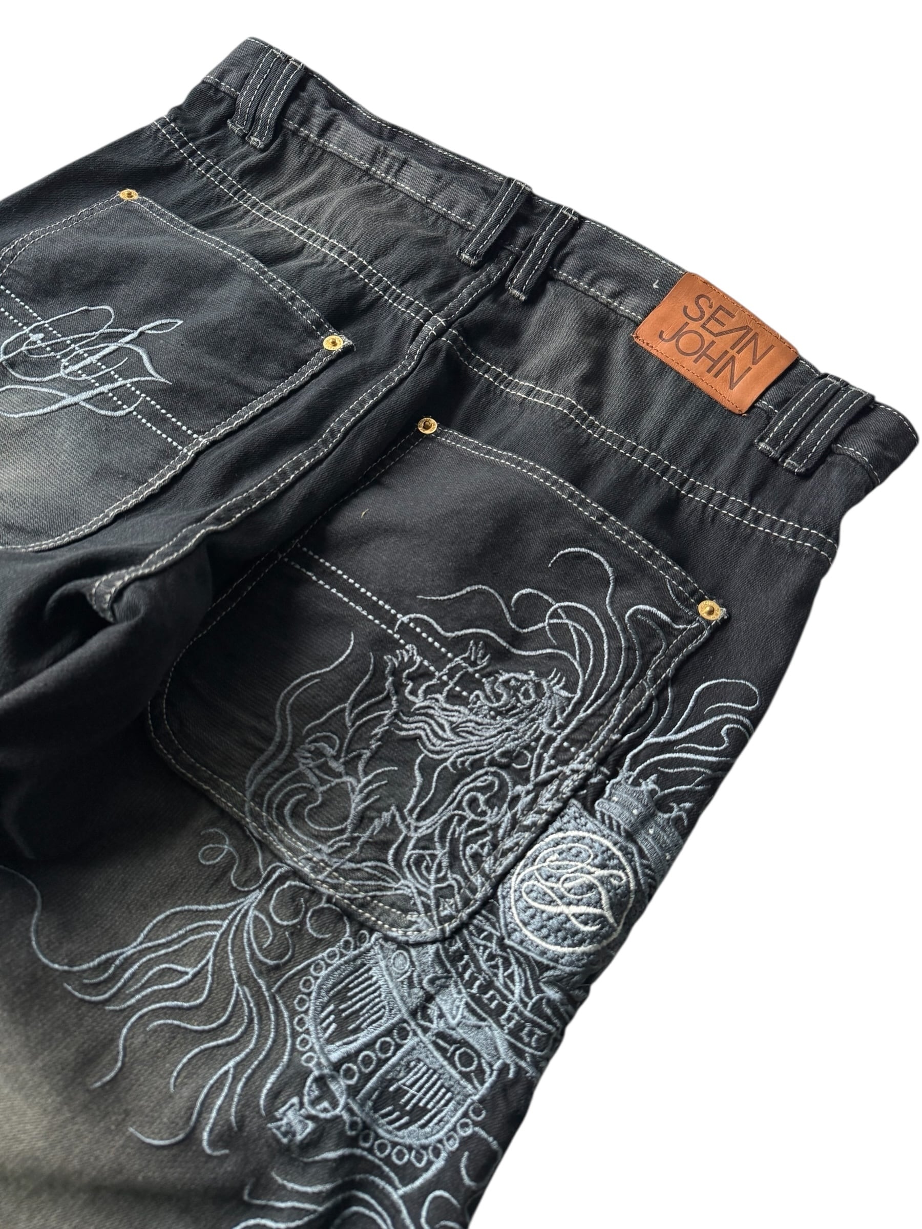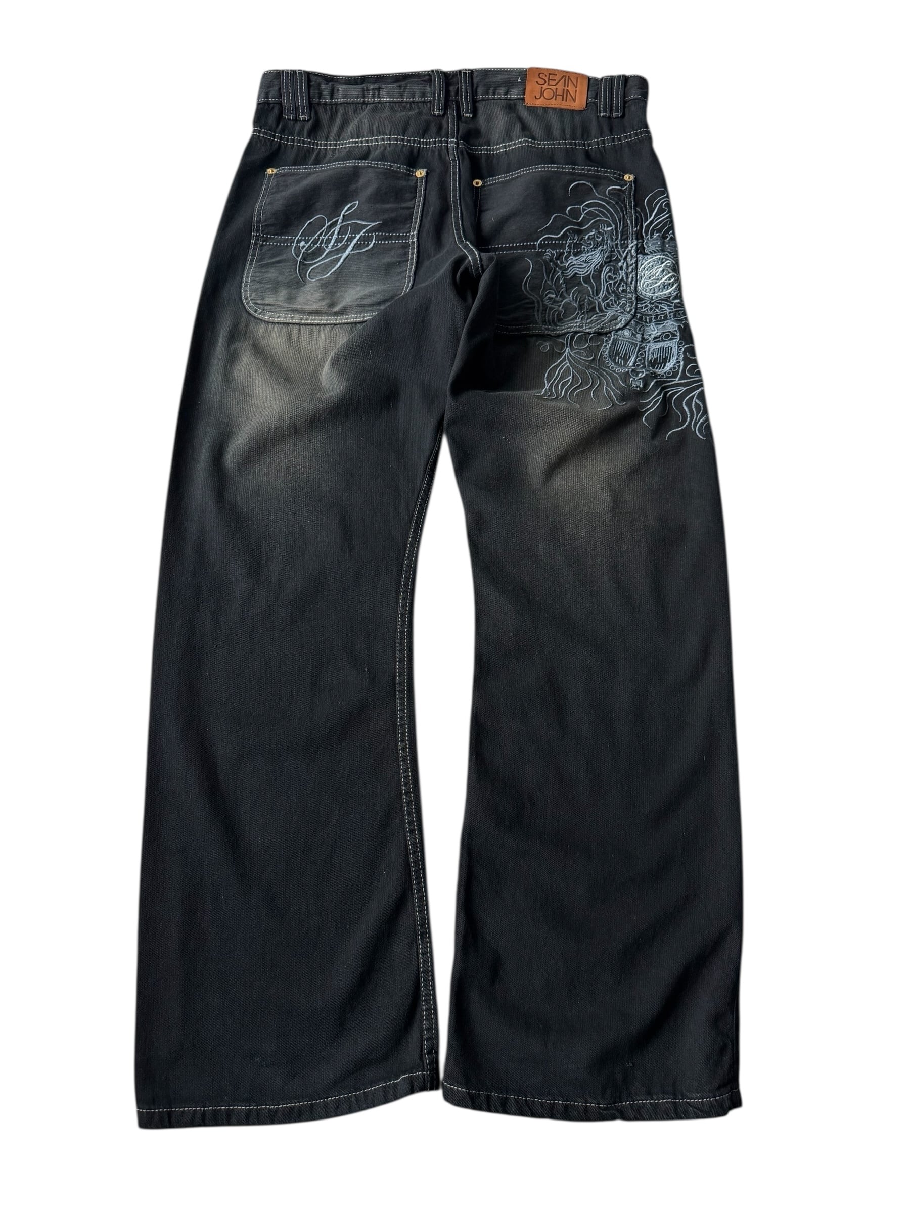 ♾SEAN JOHN♾ emblem motif Embroidered wide denim pants size 38