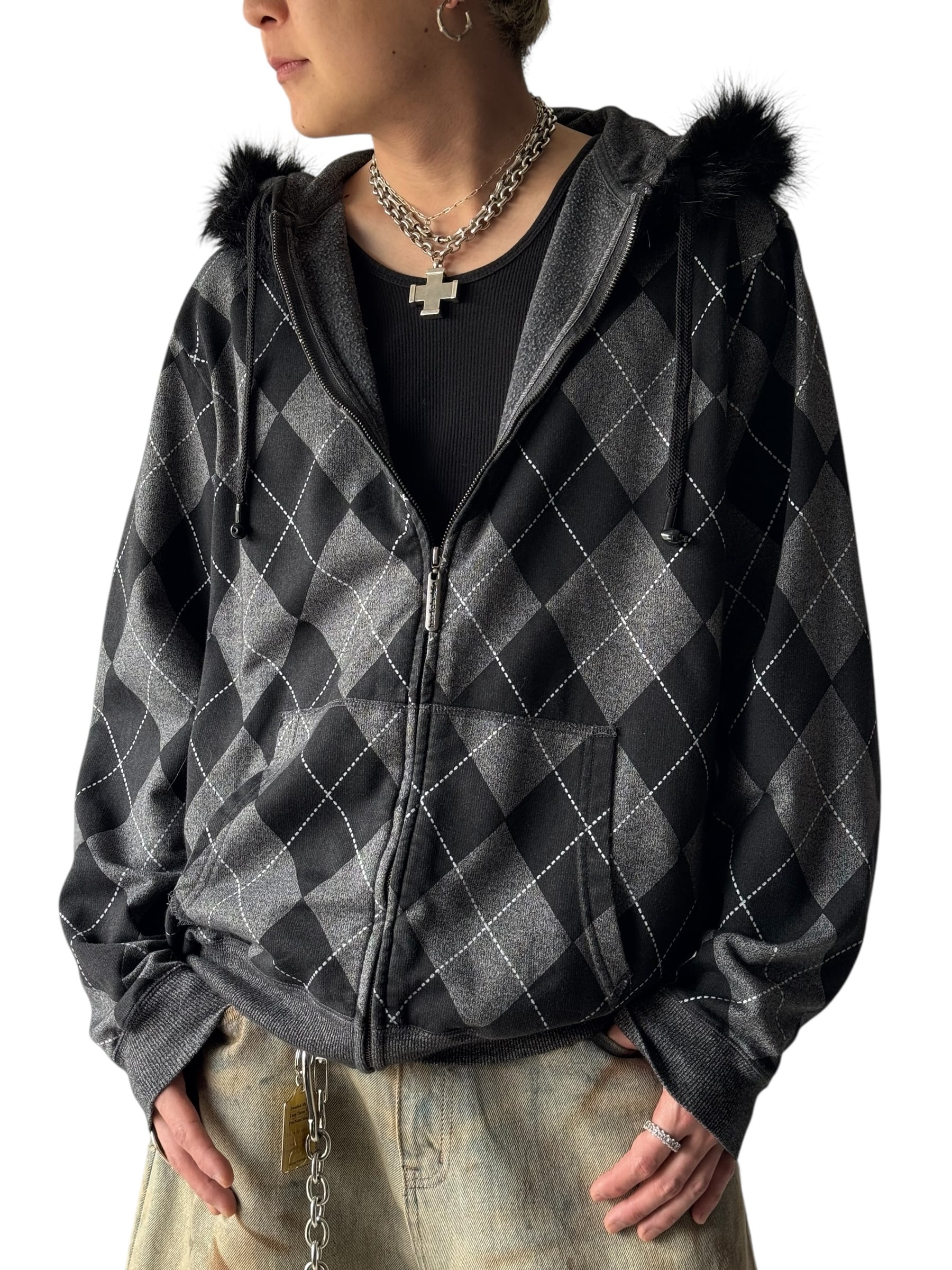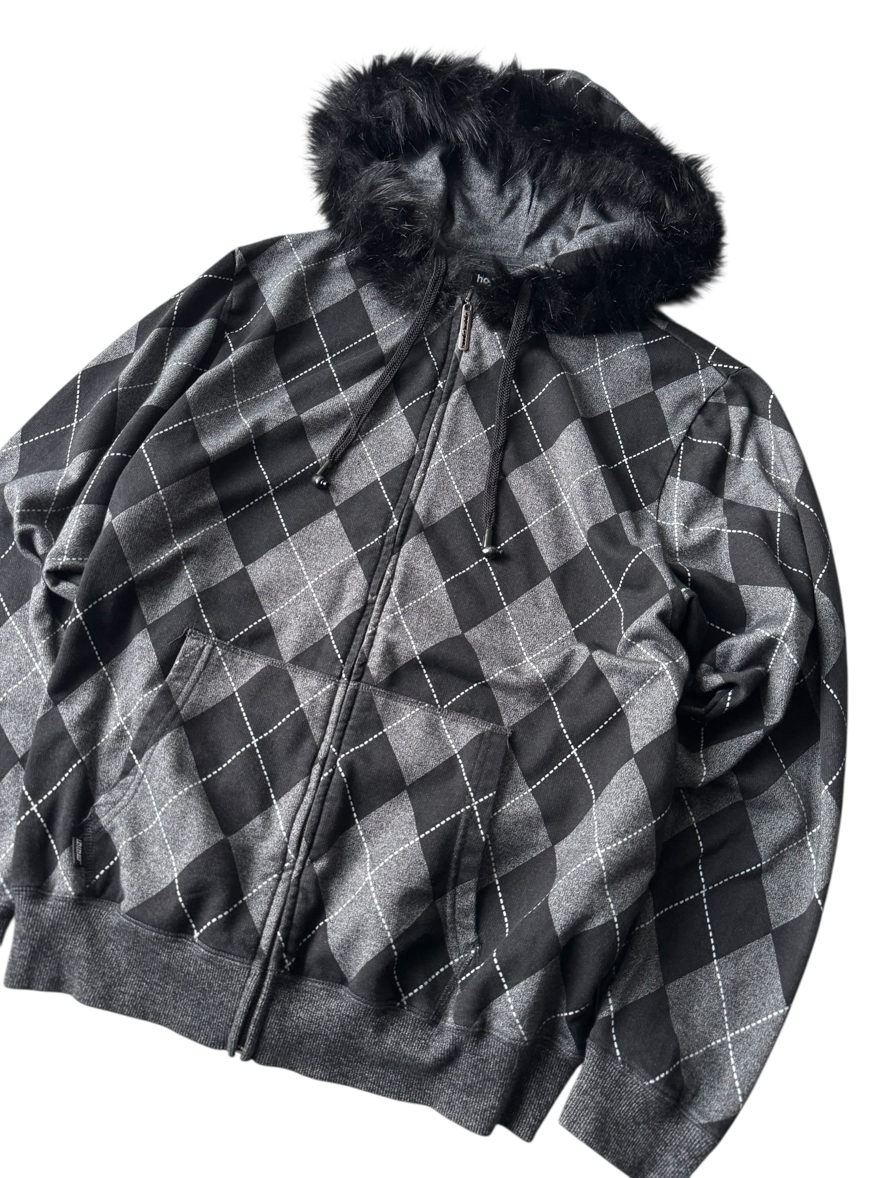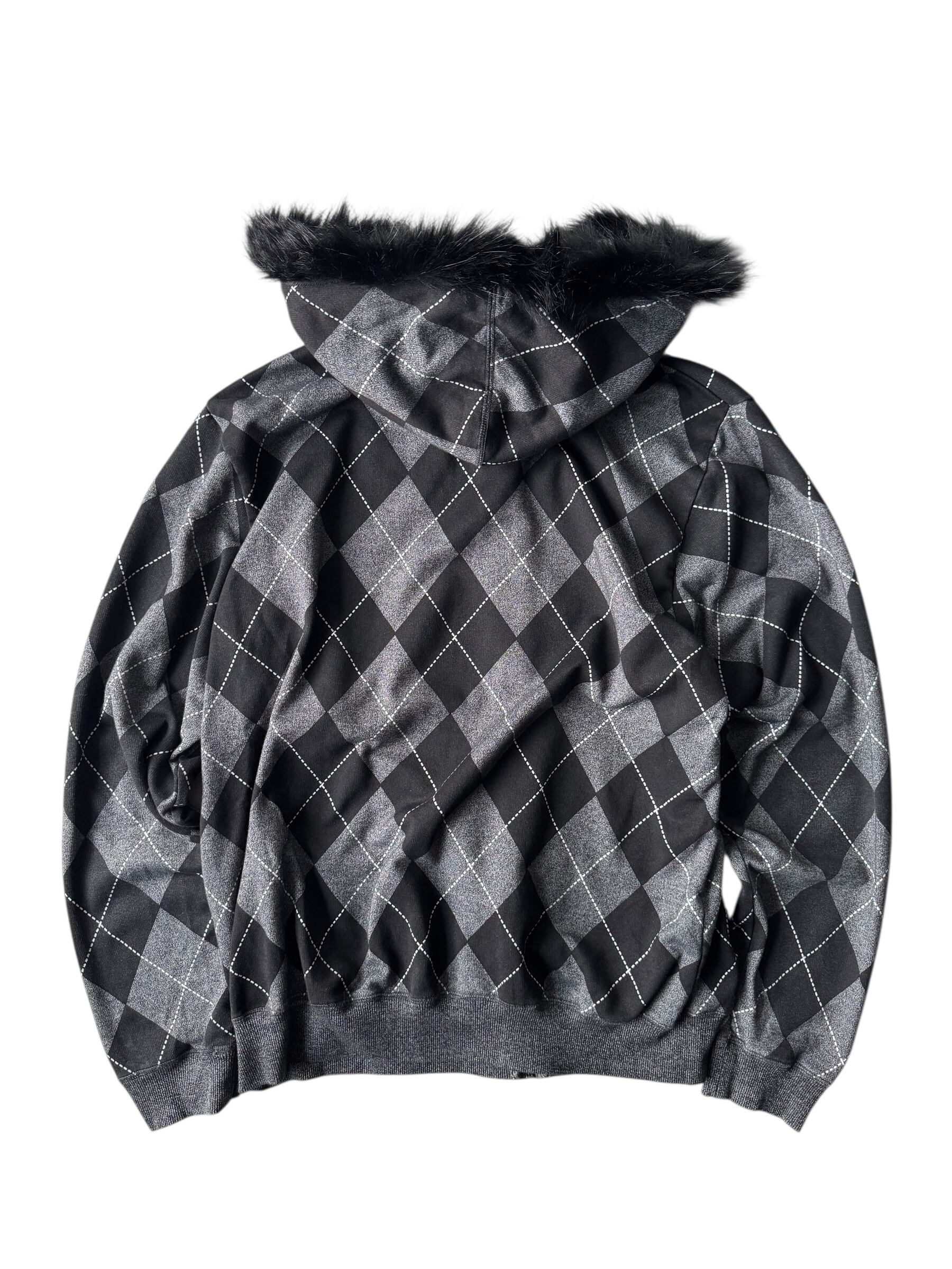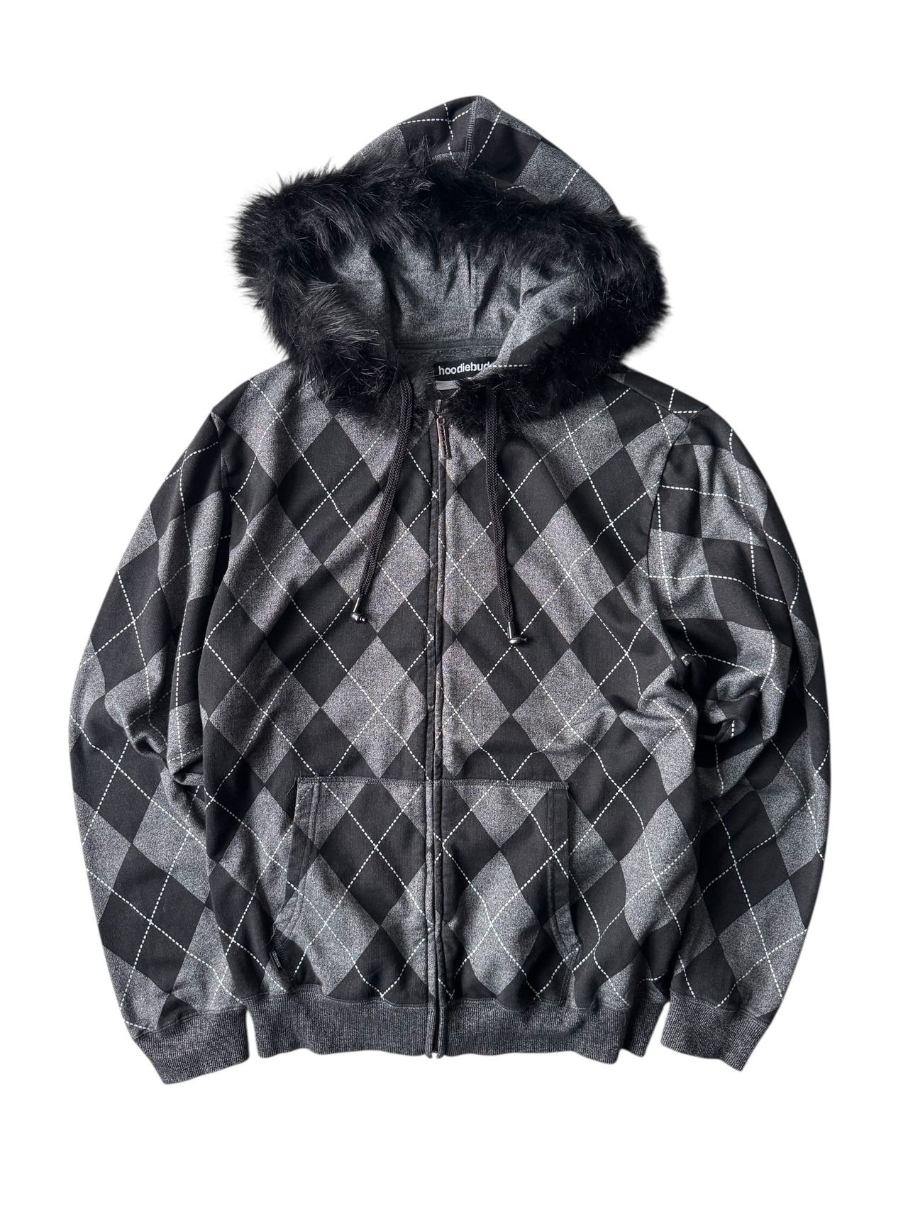 ♾HOODIEBUDDIE♾ Argyle pattern fur hooded zip hoodie size L