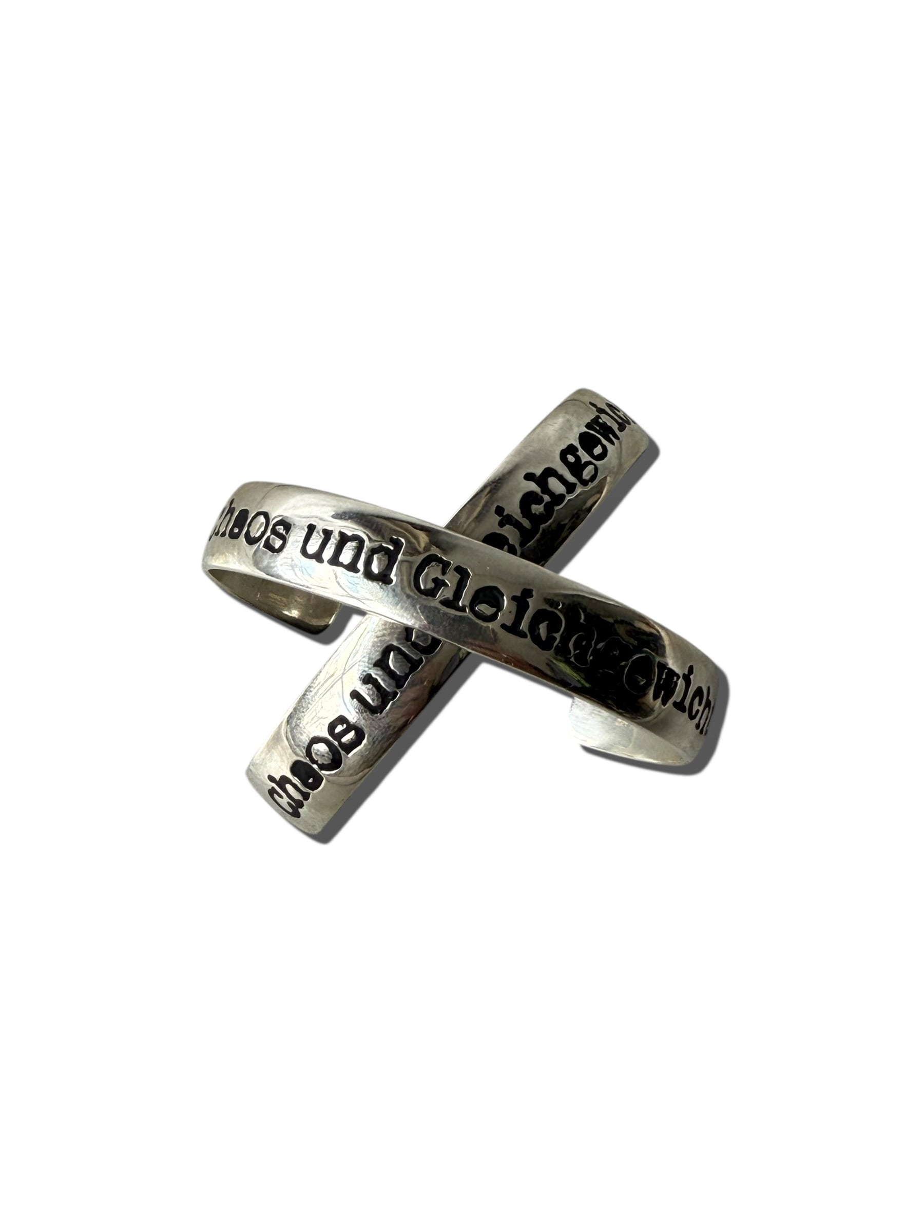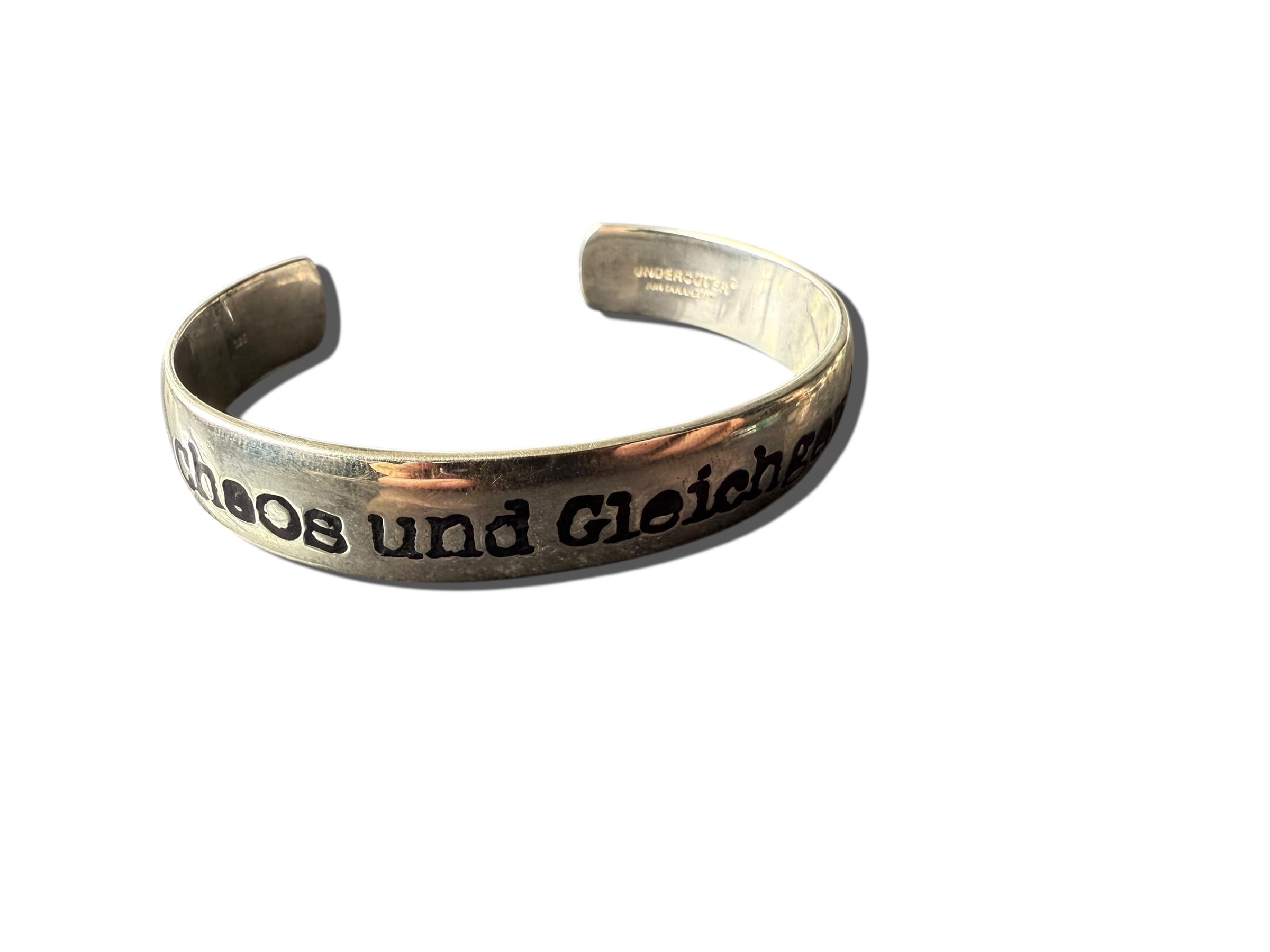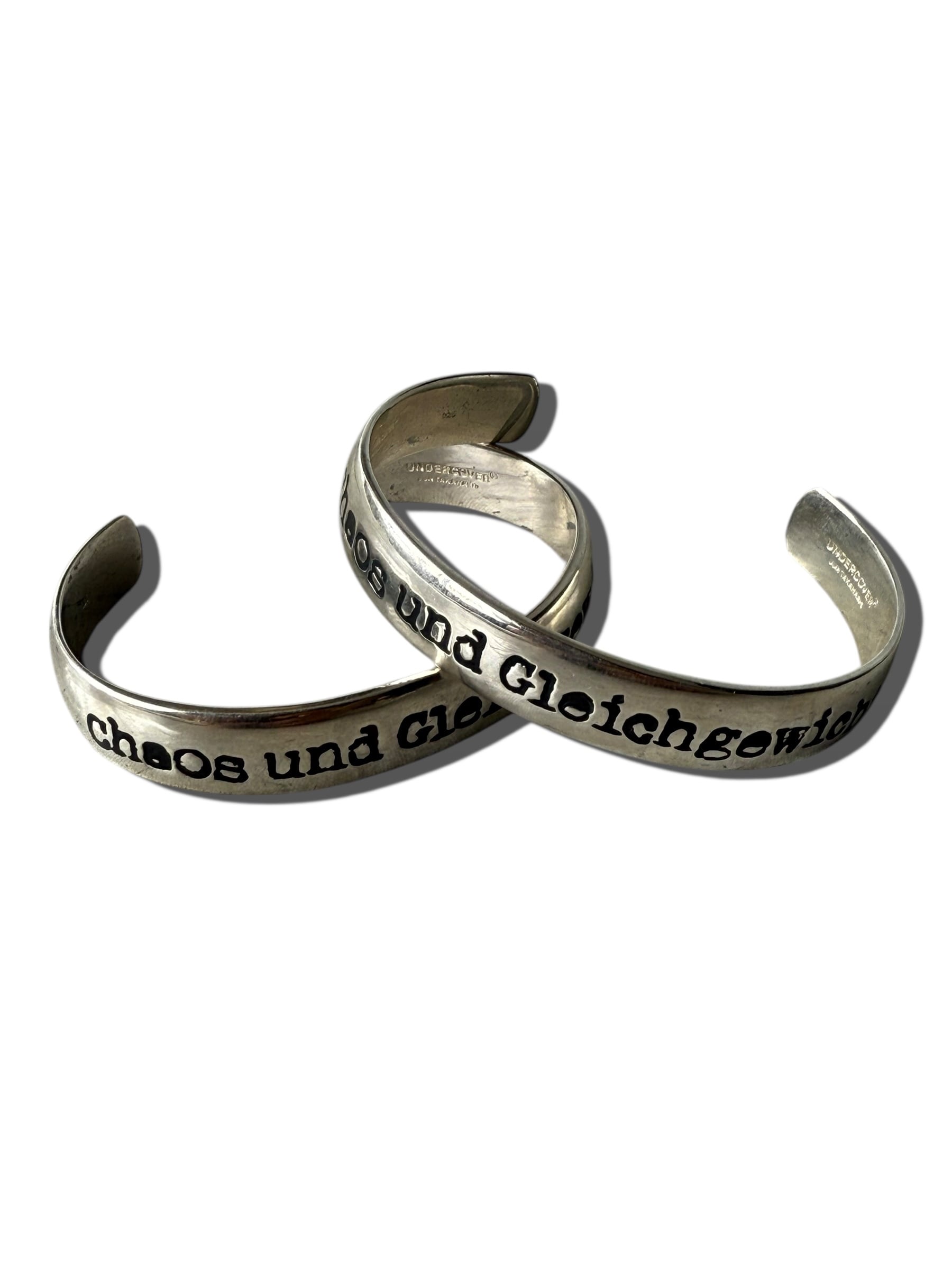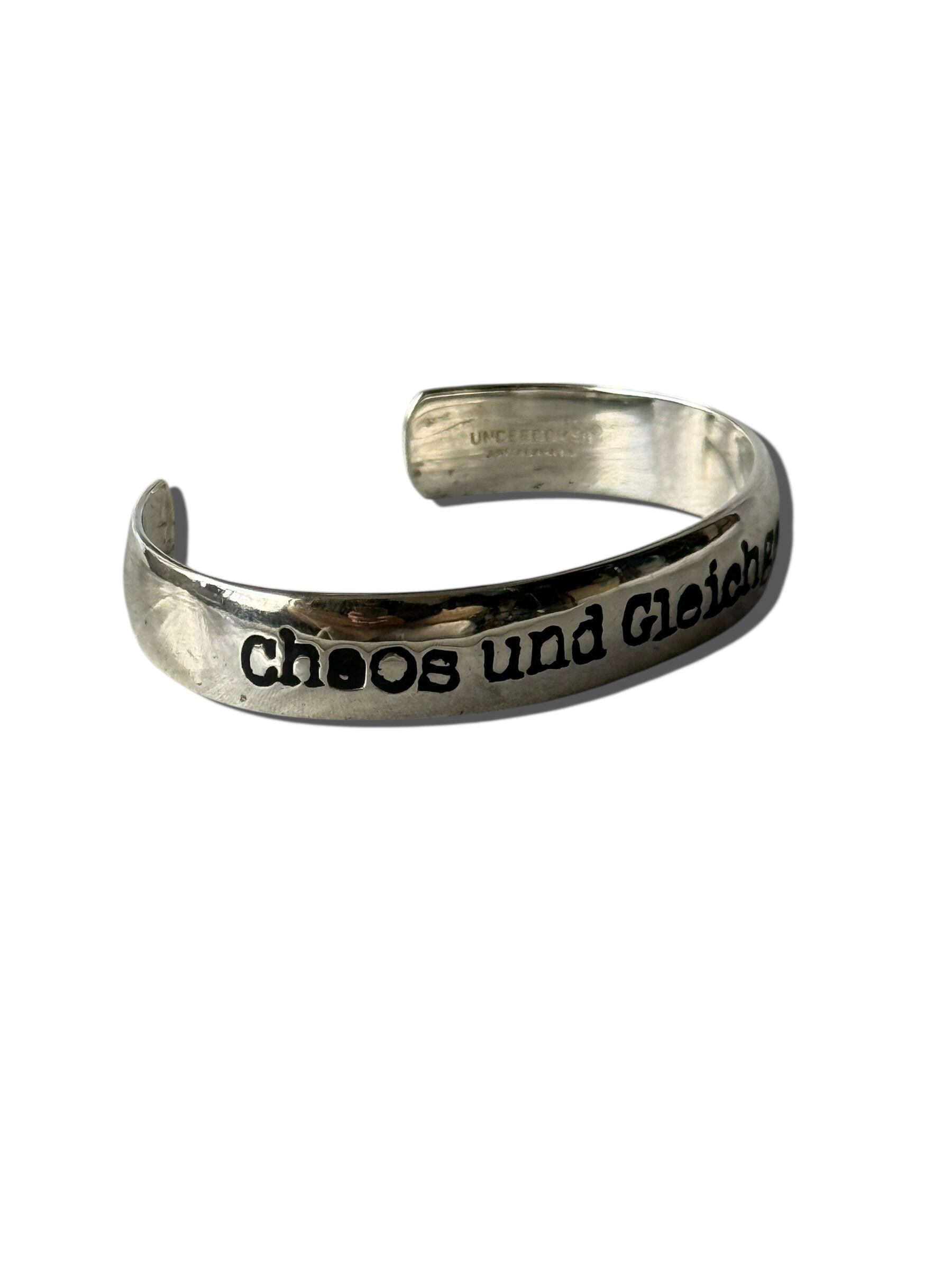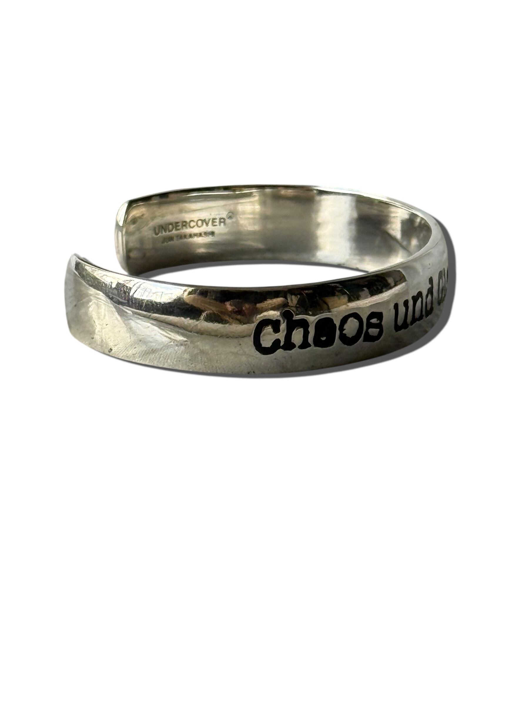 UNDERCOVER 20AW(Chaos and Balance / カオスと均衡)期のバングルで表面に大きく “Chaos und Gleichgewicht”(カオスと均衡) と彫られていてフォントは少し歪んだような、UNDERCOVER特有の手書き風・不均一なグラフィックがめちゃくちゃかっこいい。