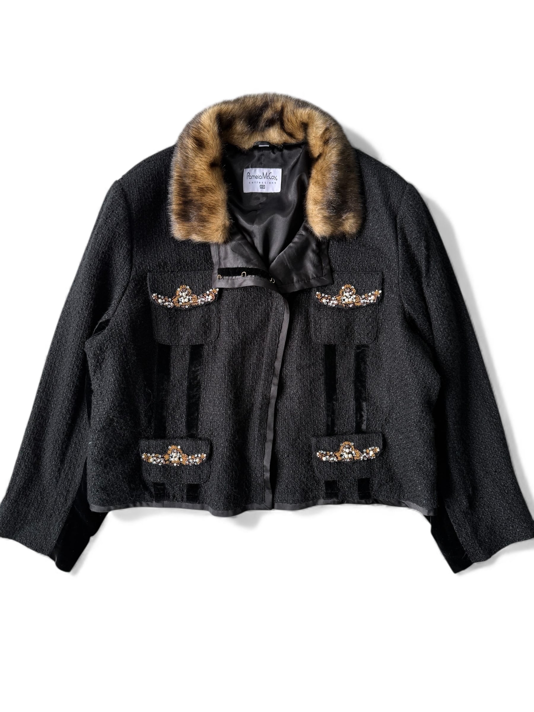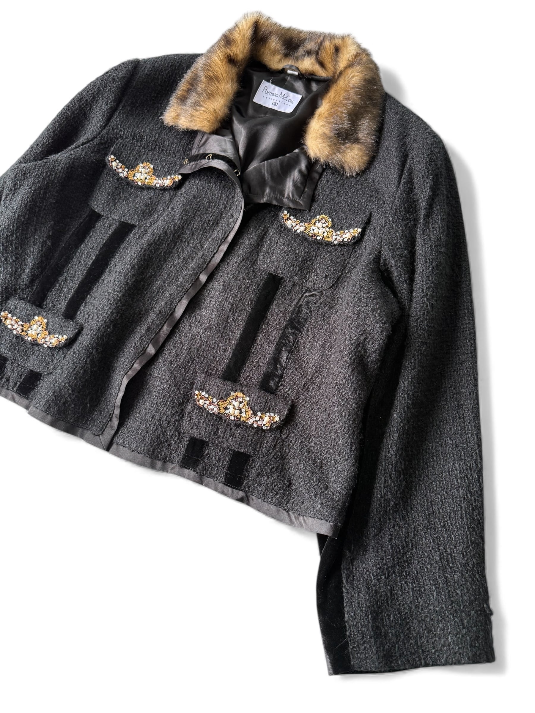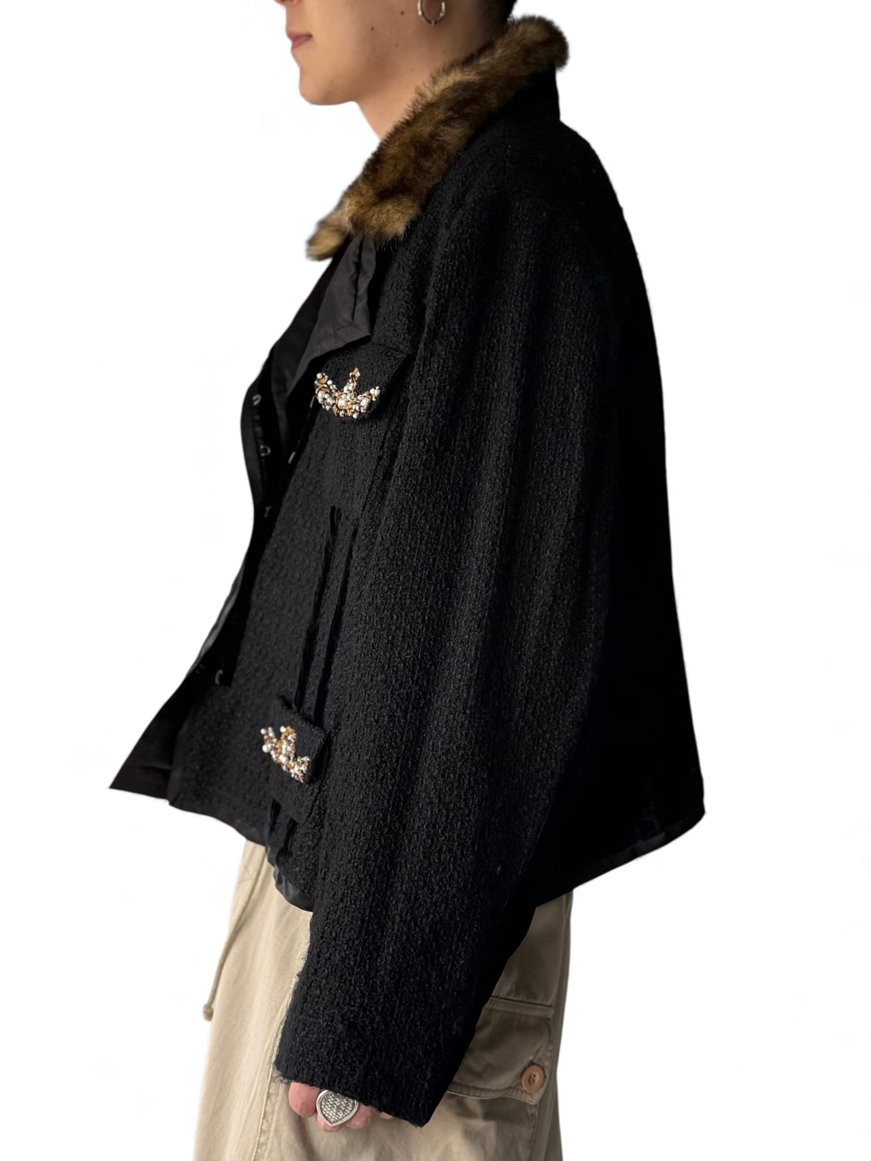 【Pamela McCoy】Fur collar and beaded decoration" Wide short tweed jacket