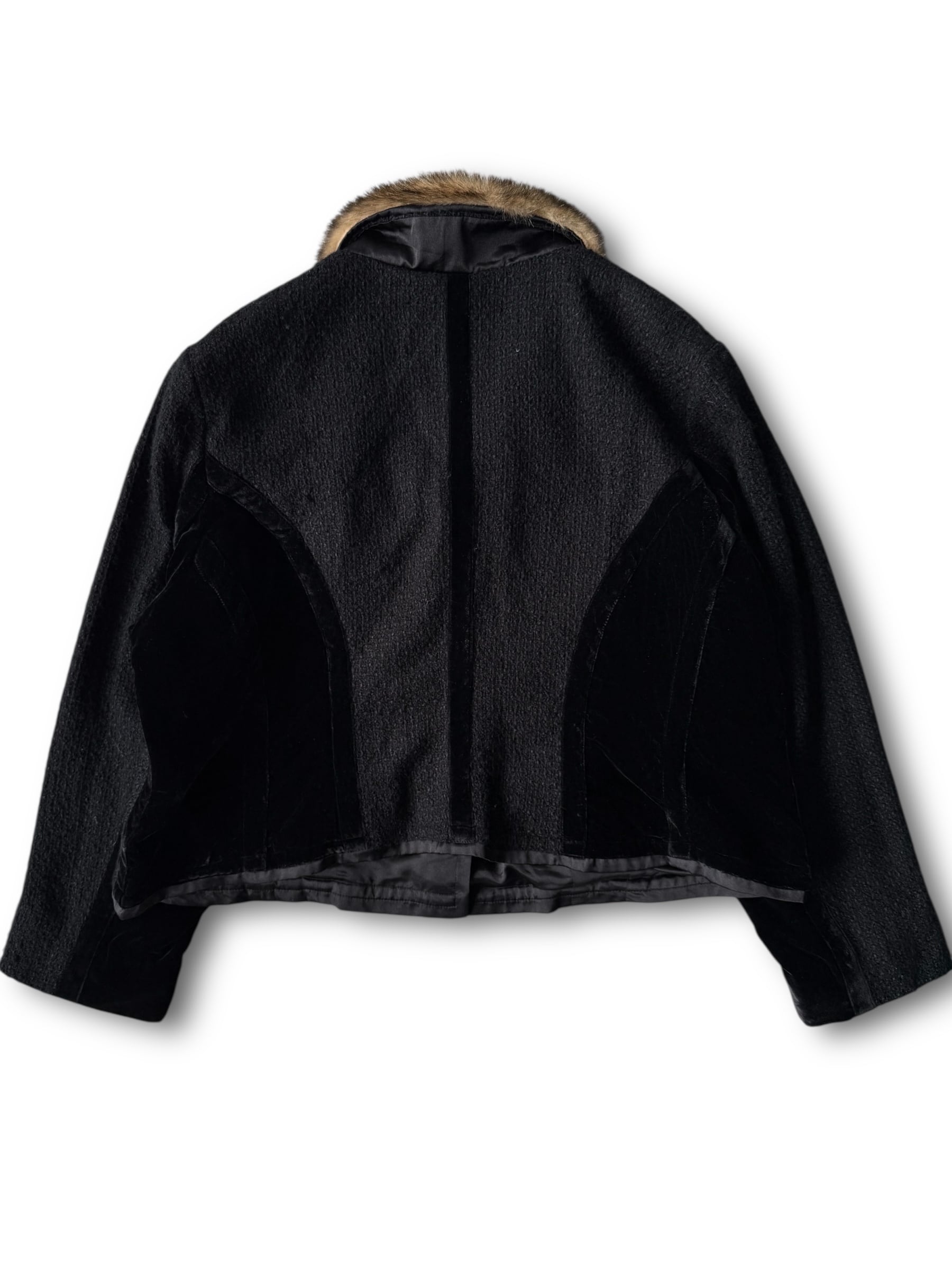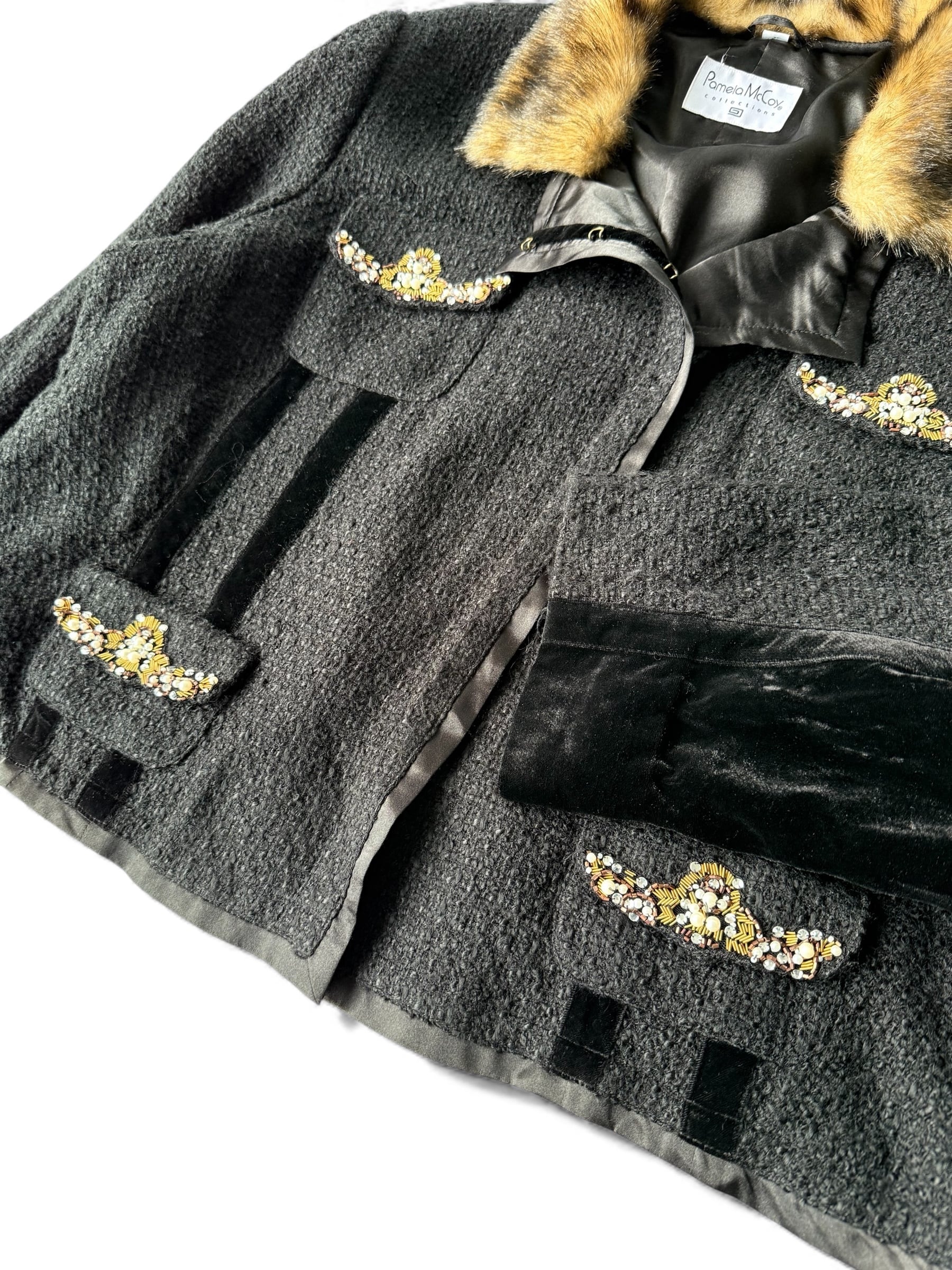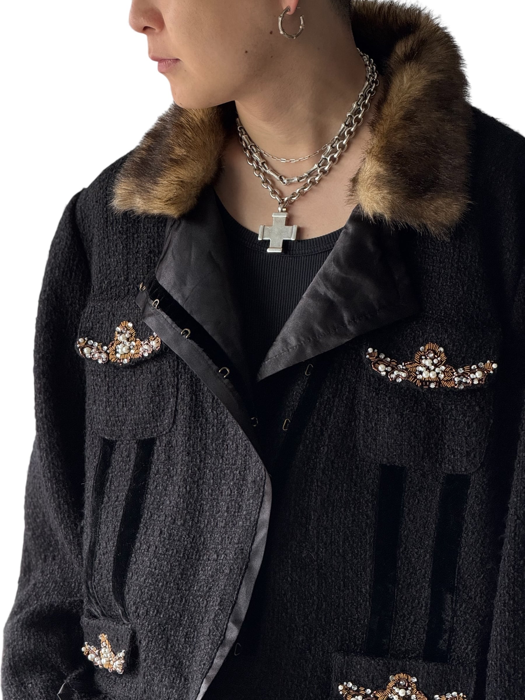 【Pamela McCoy】Fur collar and beaded decoration" Wide short tweed jacket