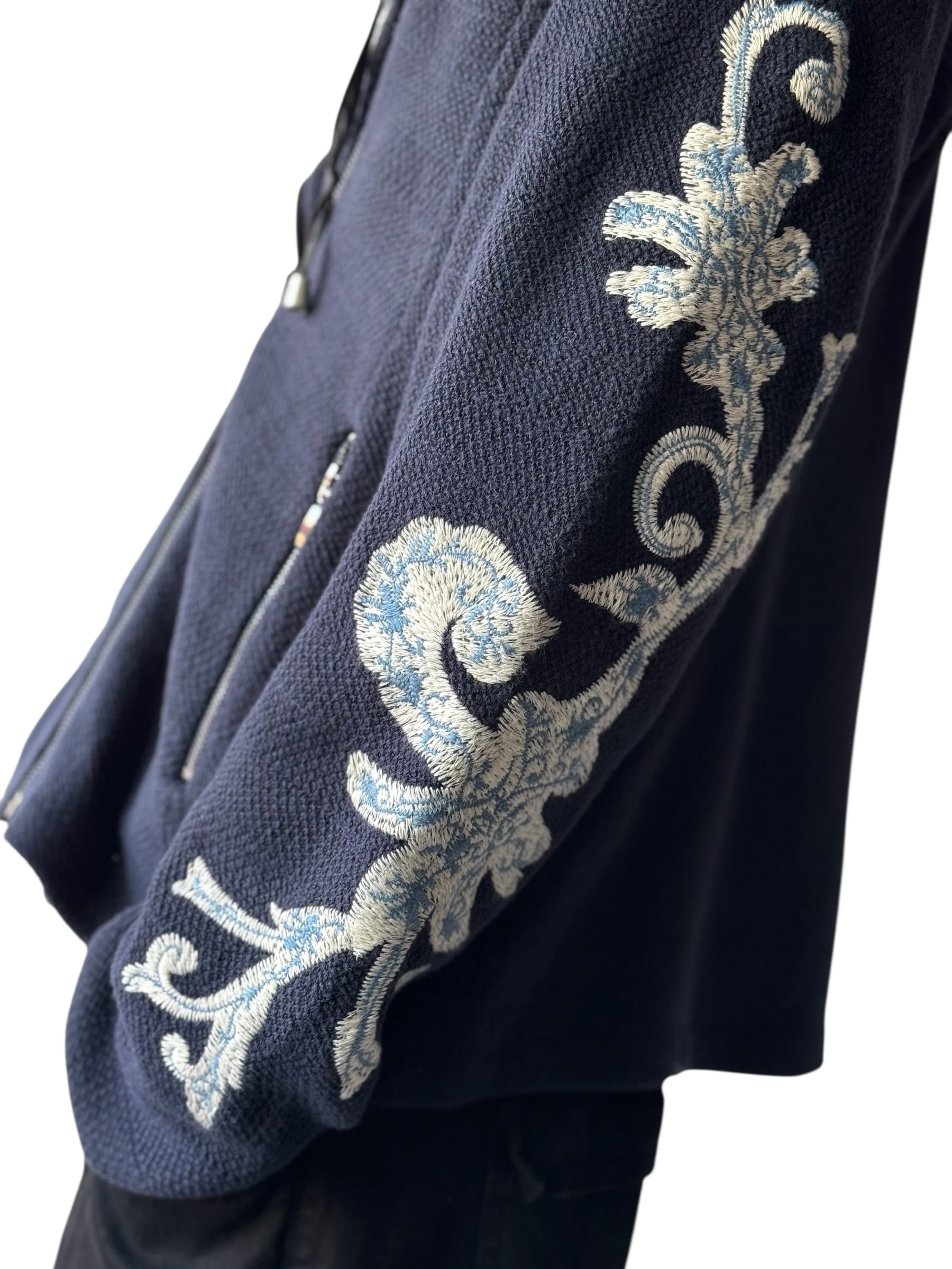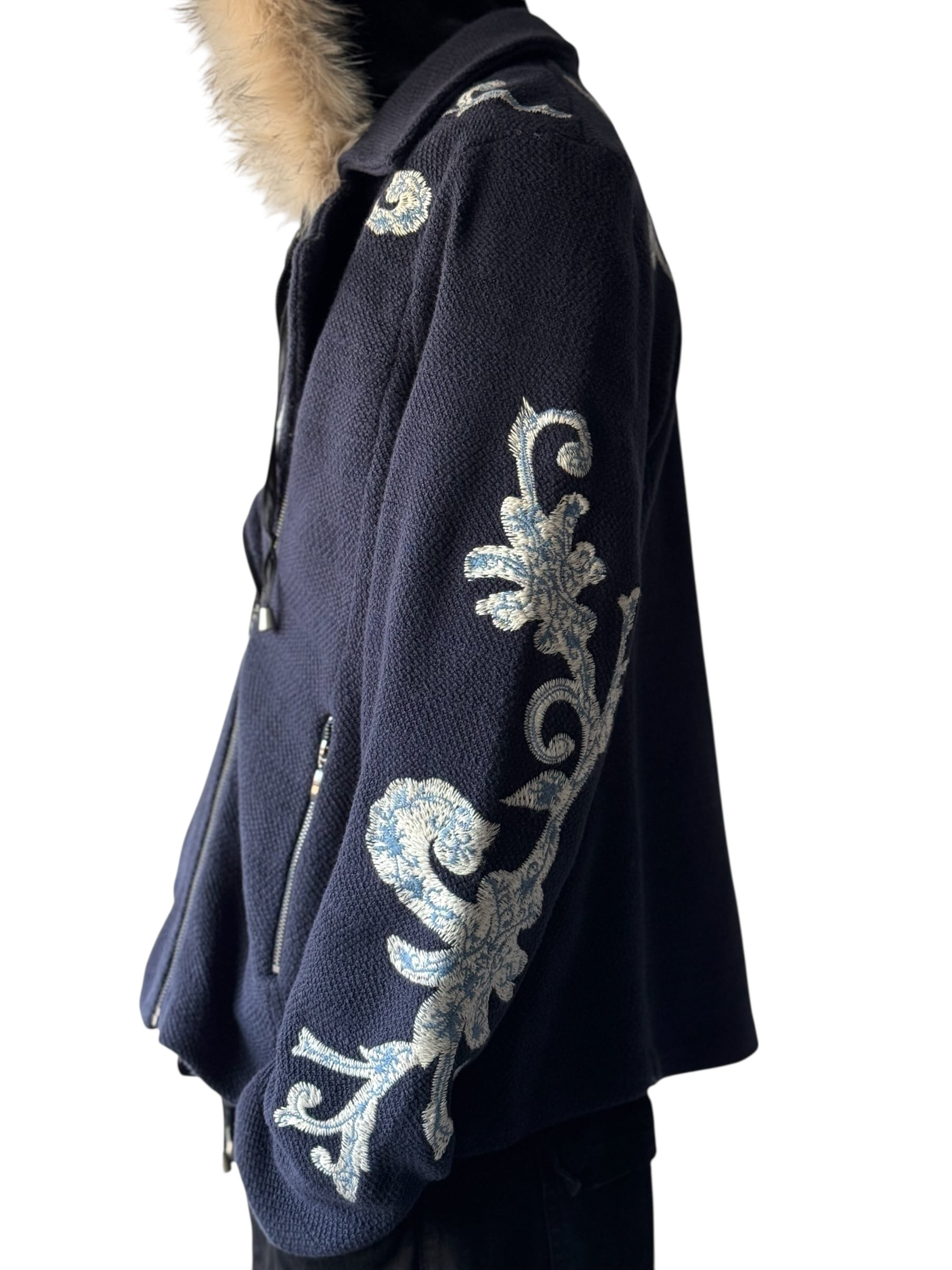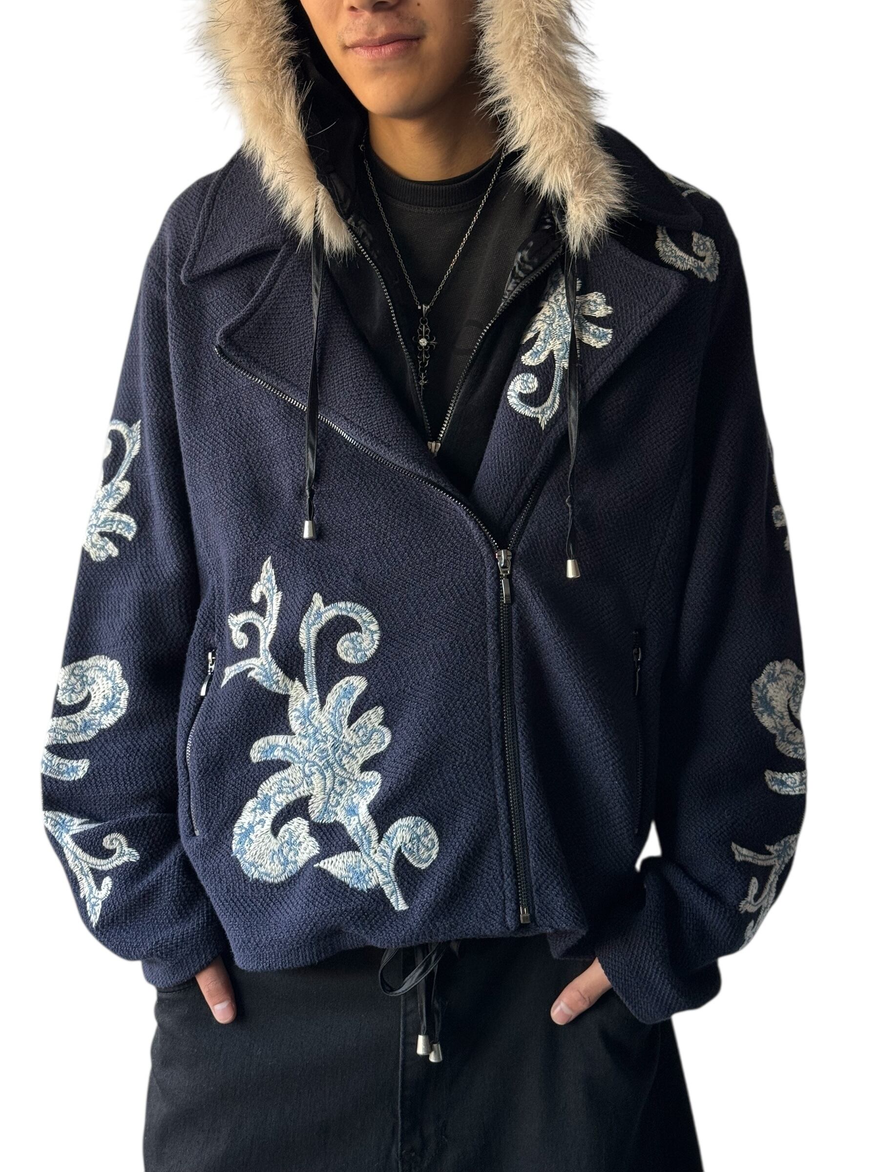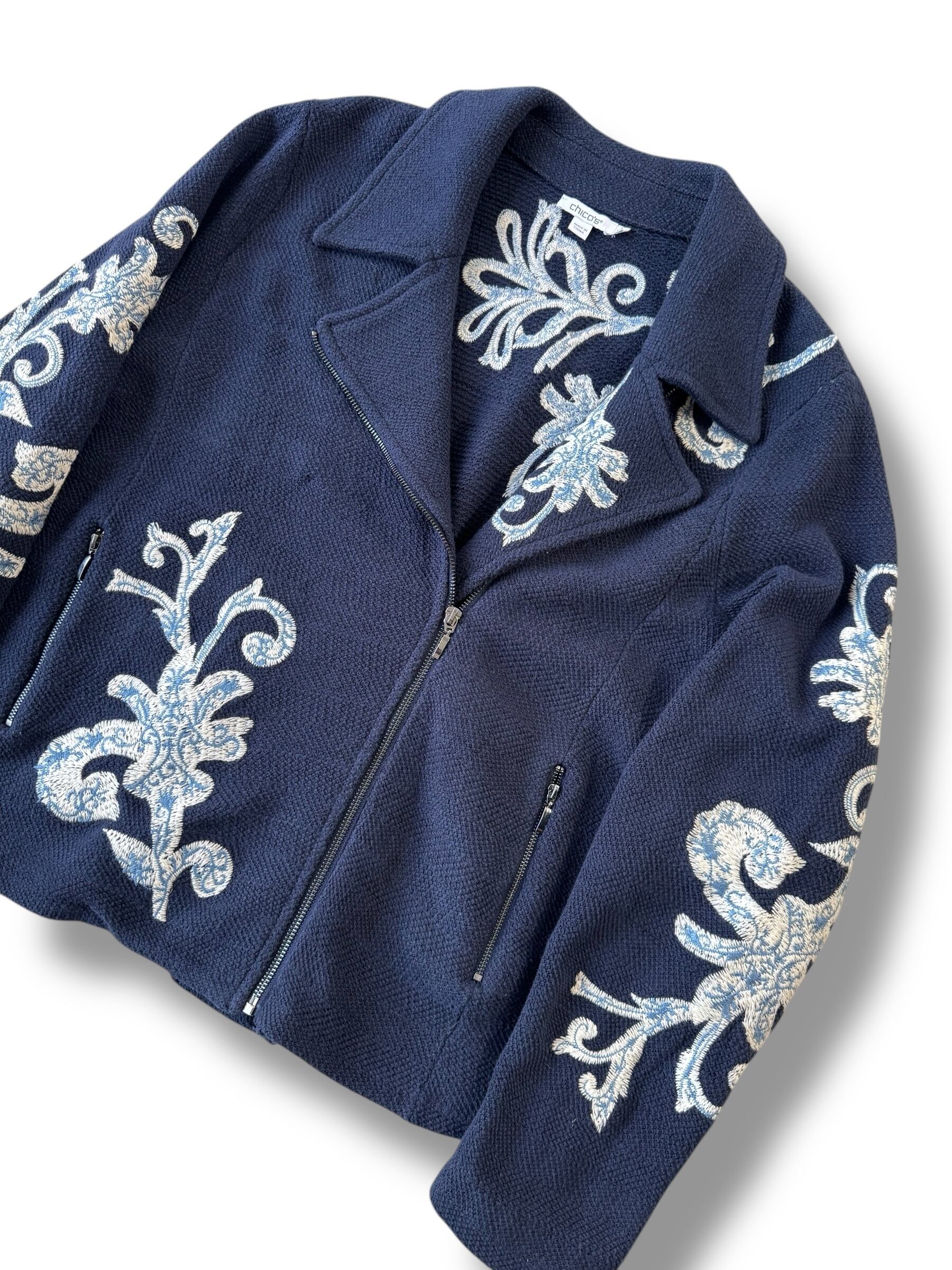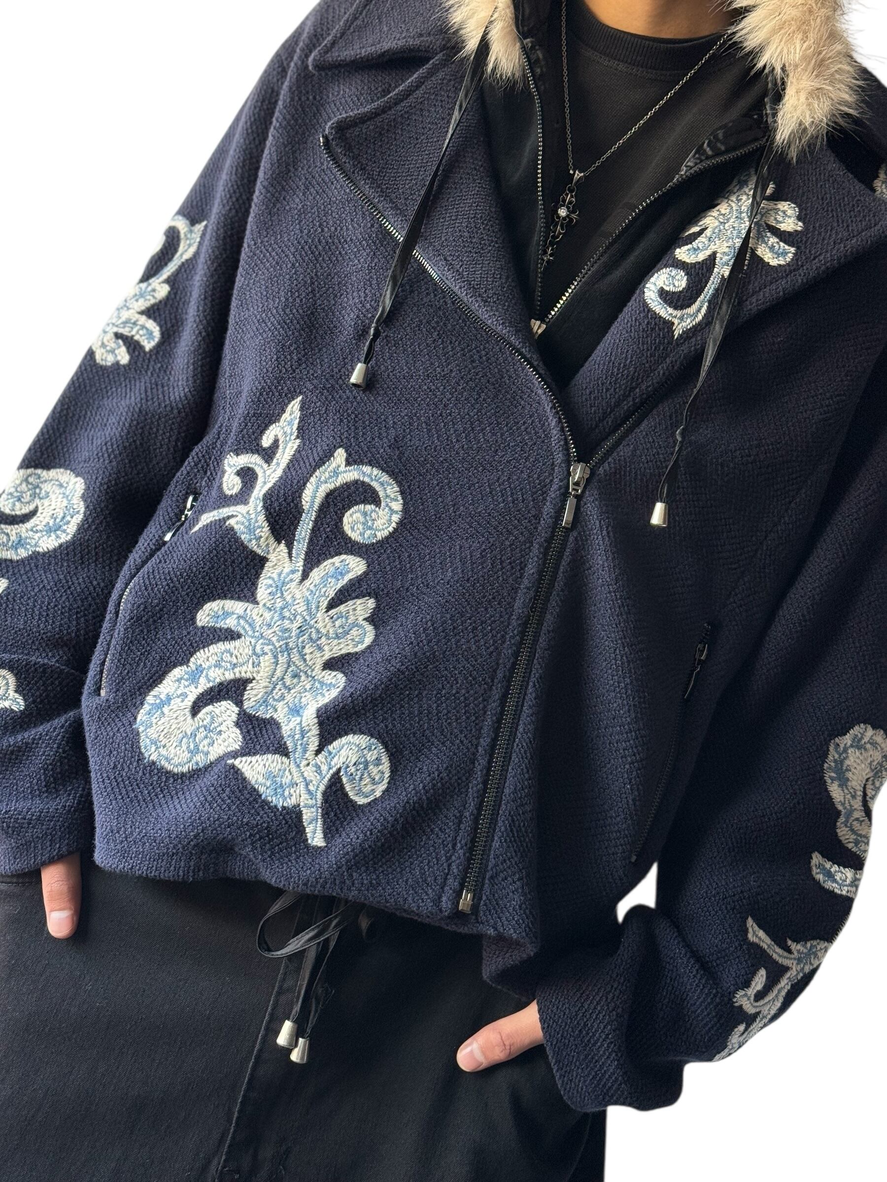 渋めのネイビーのフローラルモチーフの刺繍の総柄のライダース型ジャケット‼️