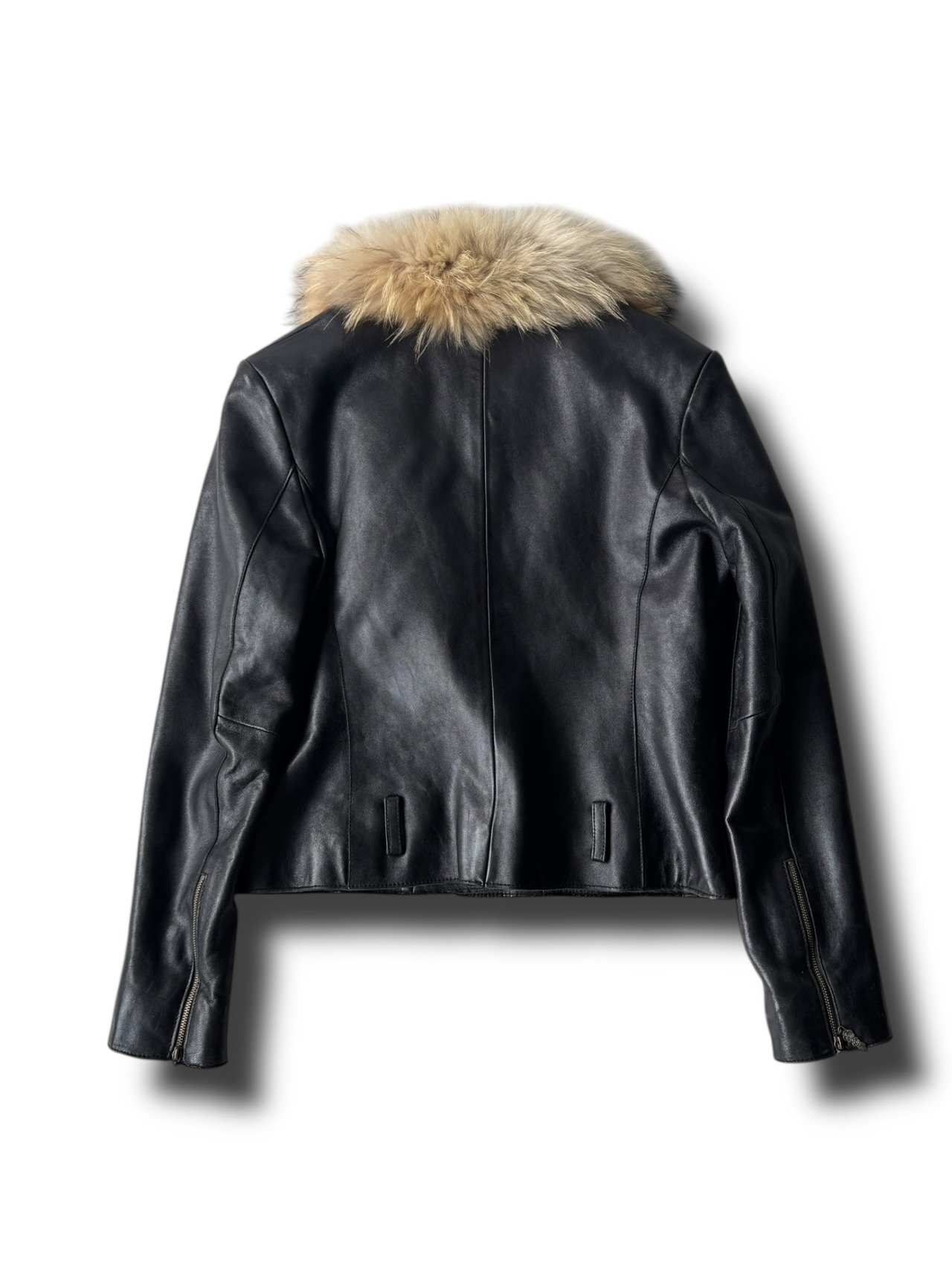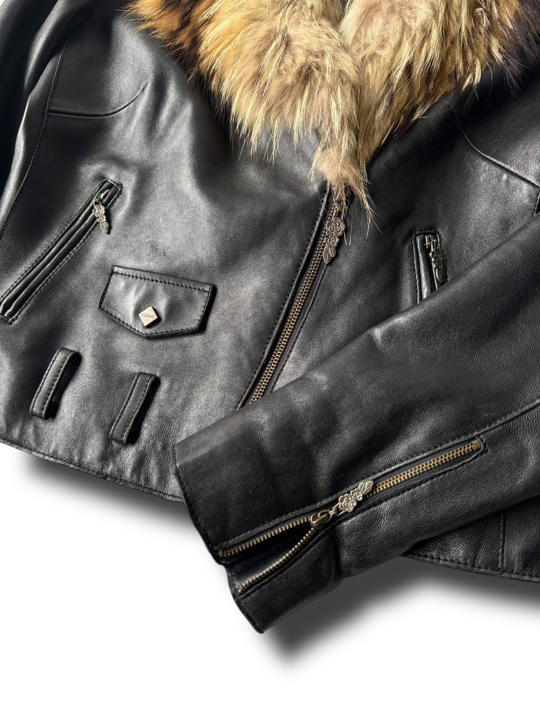 その漆黒に包まれた柔らかなレザーを使い表現された、ショートレングスダブルレイダースの襟に毛足ロングなフォックスファー‼️‼️‼️