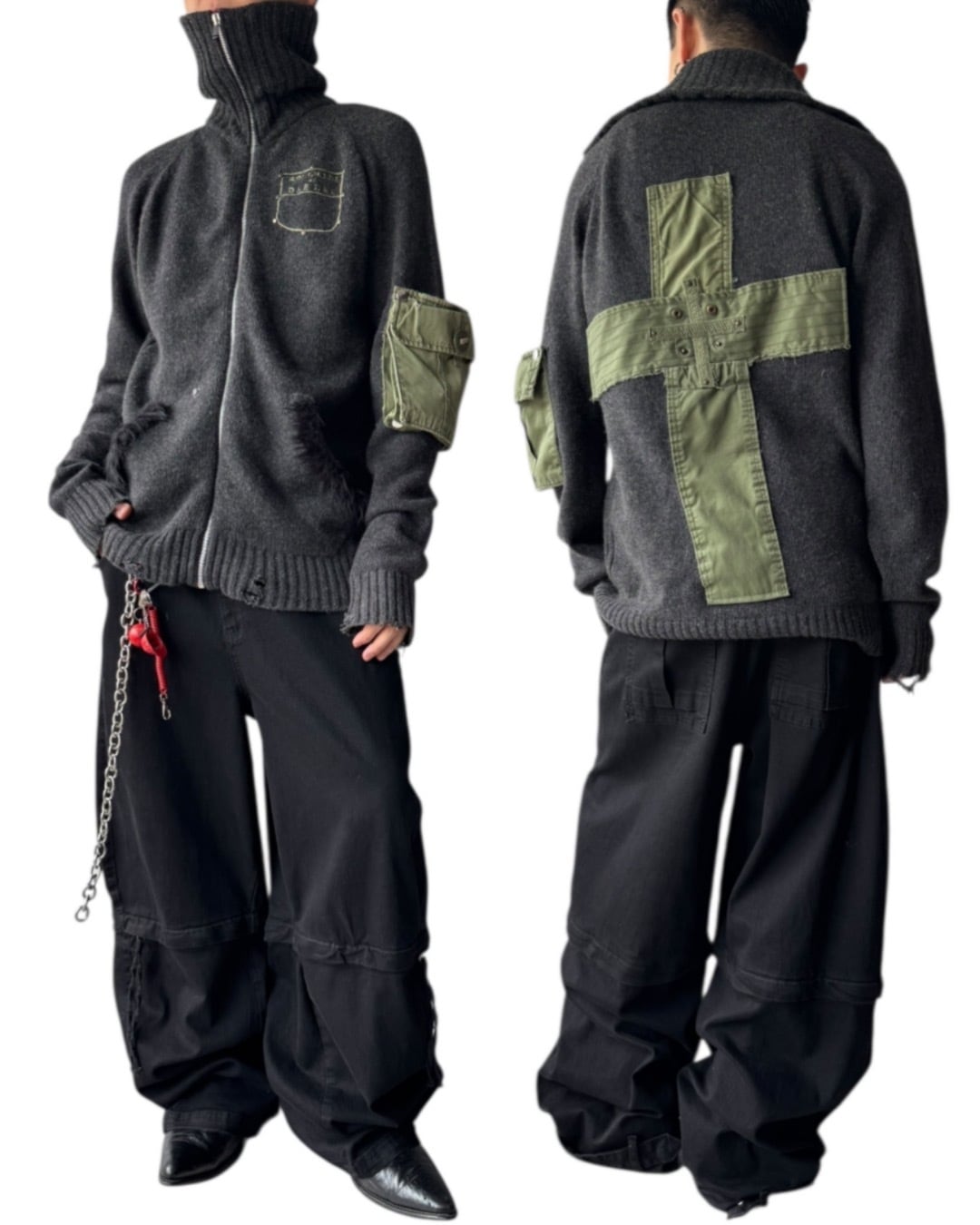 極め付けはミリタリーファブリックを解体したクロスモチーフドン。