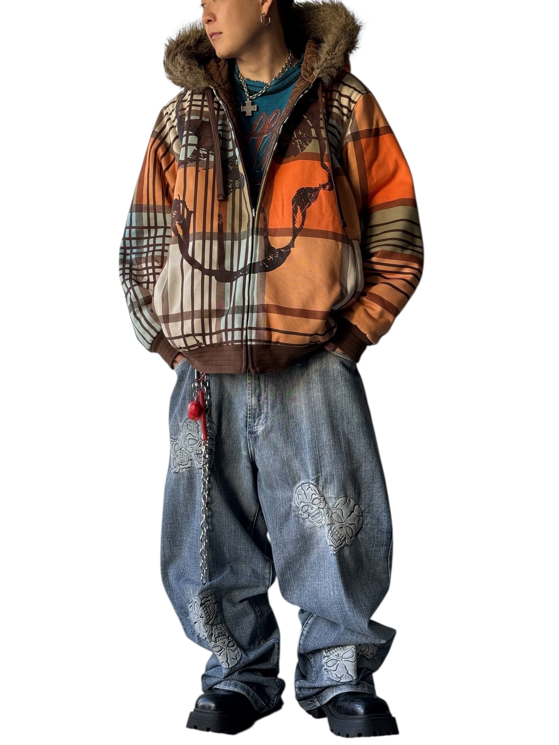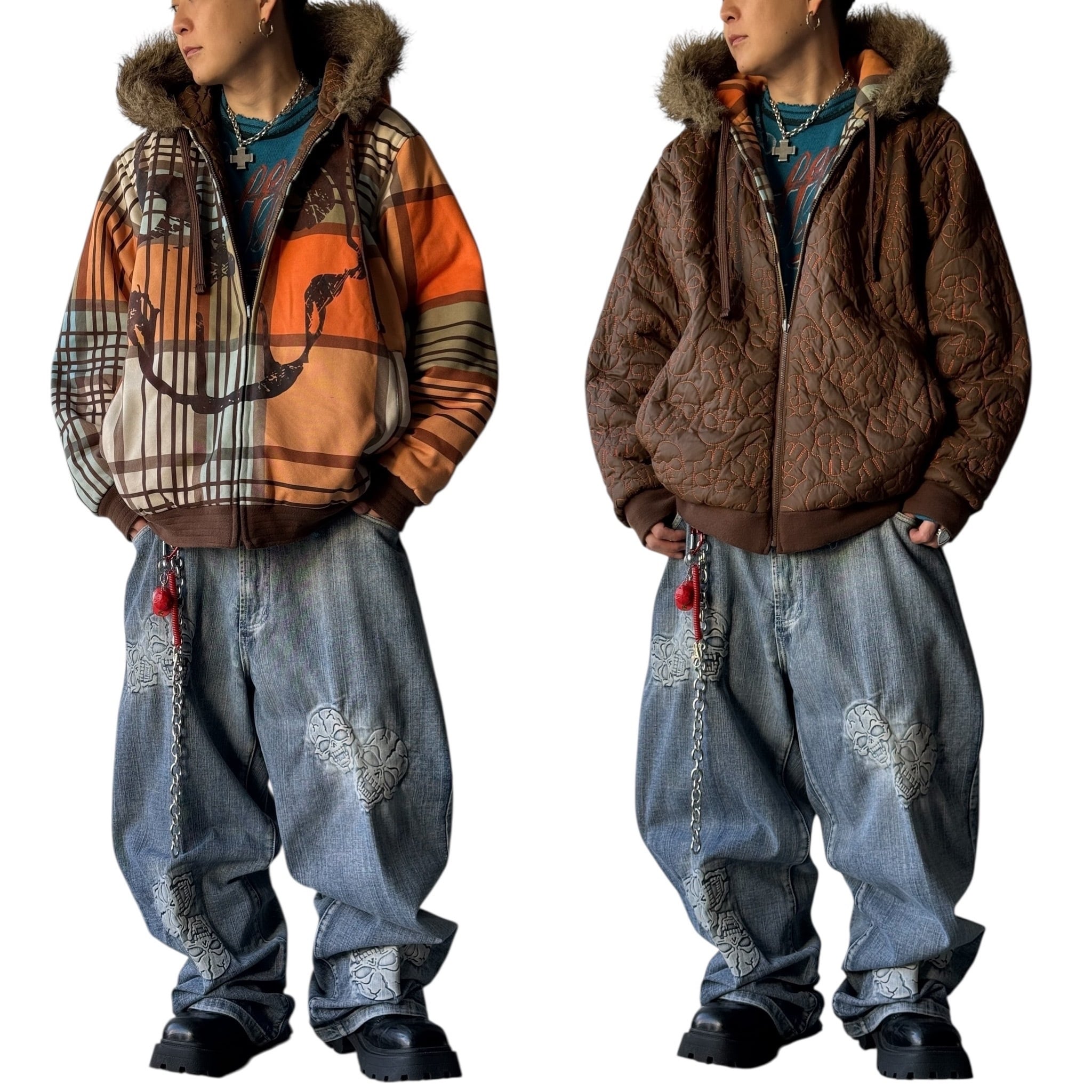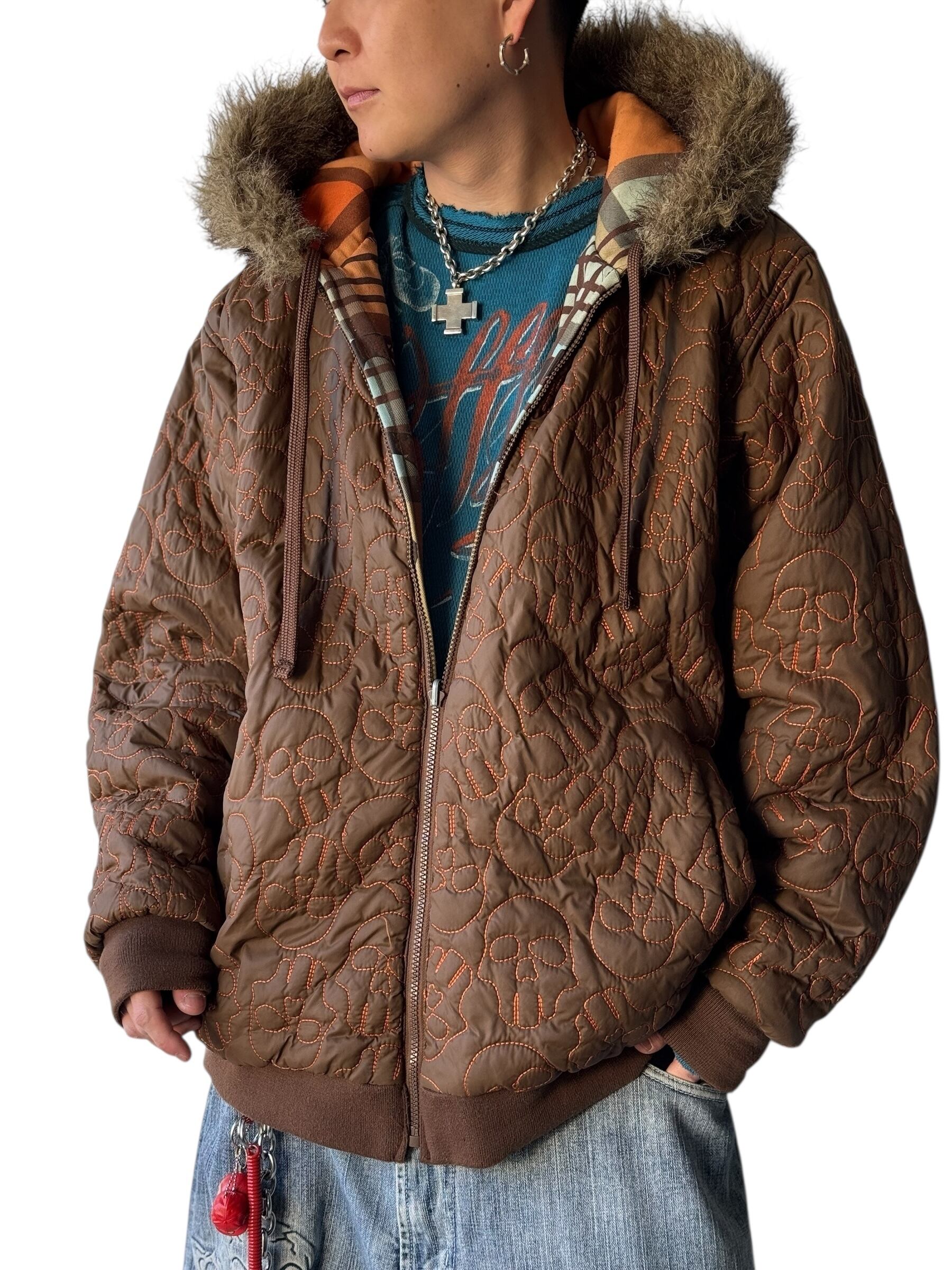 ♾ RAW BLUE ♾ embroidery skull graphic motif reversible fur hoodie blouson size L