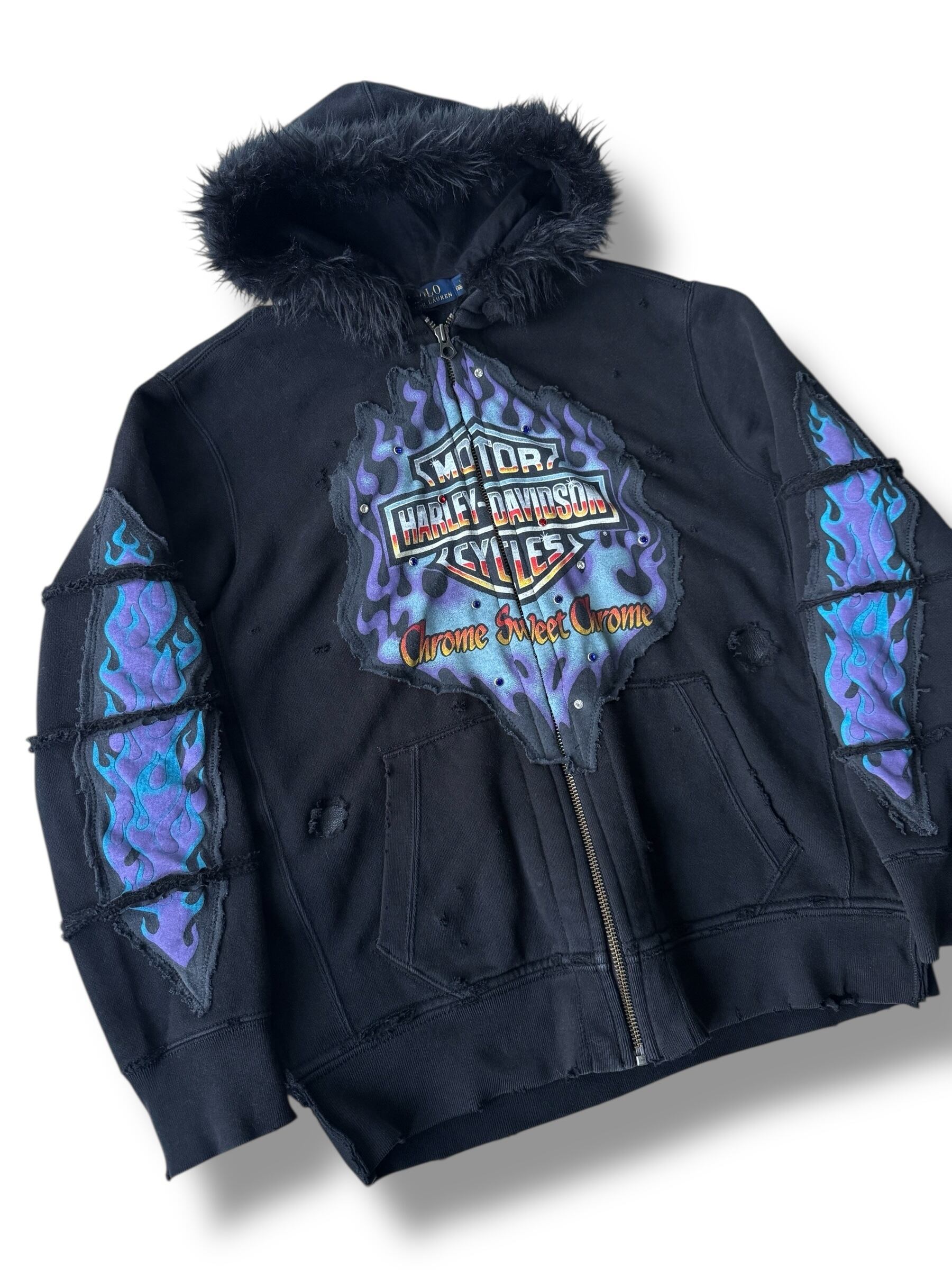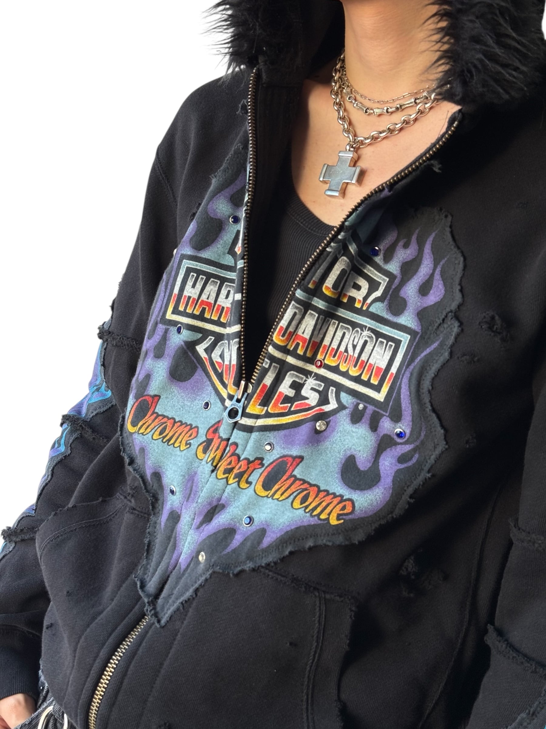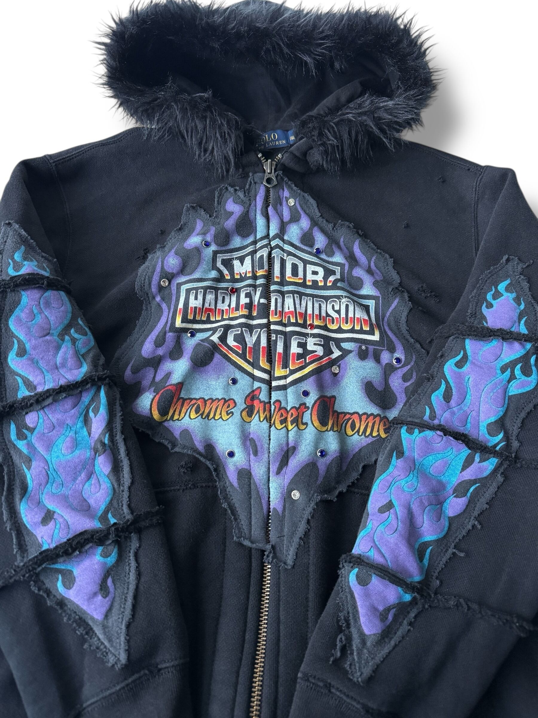 RALPH LAURENボディーを使用し、ハーレーダビッドソンのロゴを軸に、袖の地層のようなツギハギデザインと程よいダメージデザイン、CZスタッズなど魅力が盛りだくさんの1着✨️