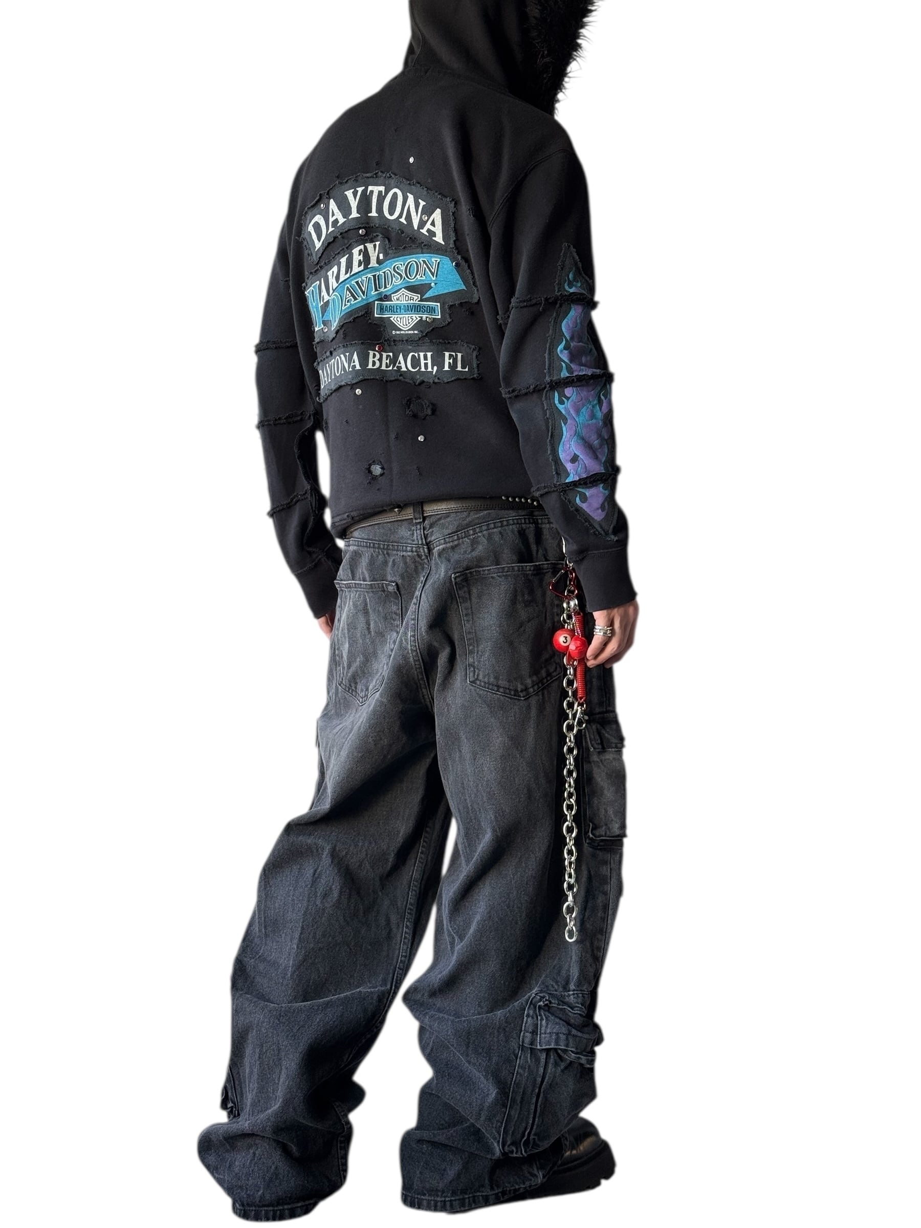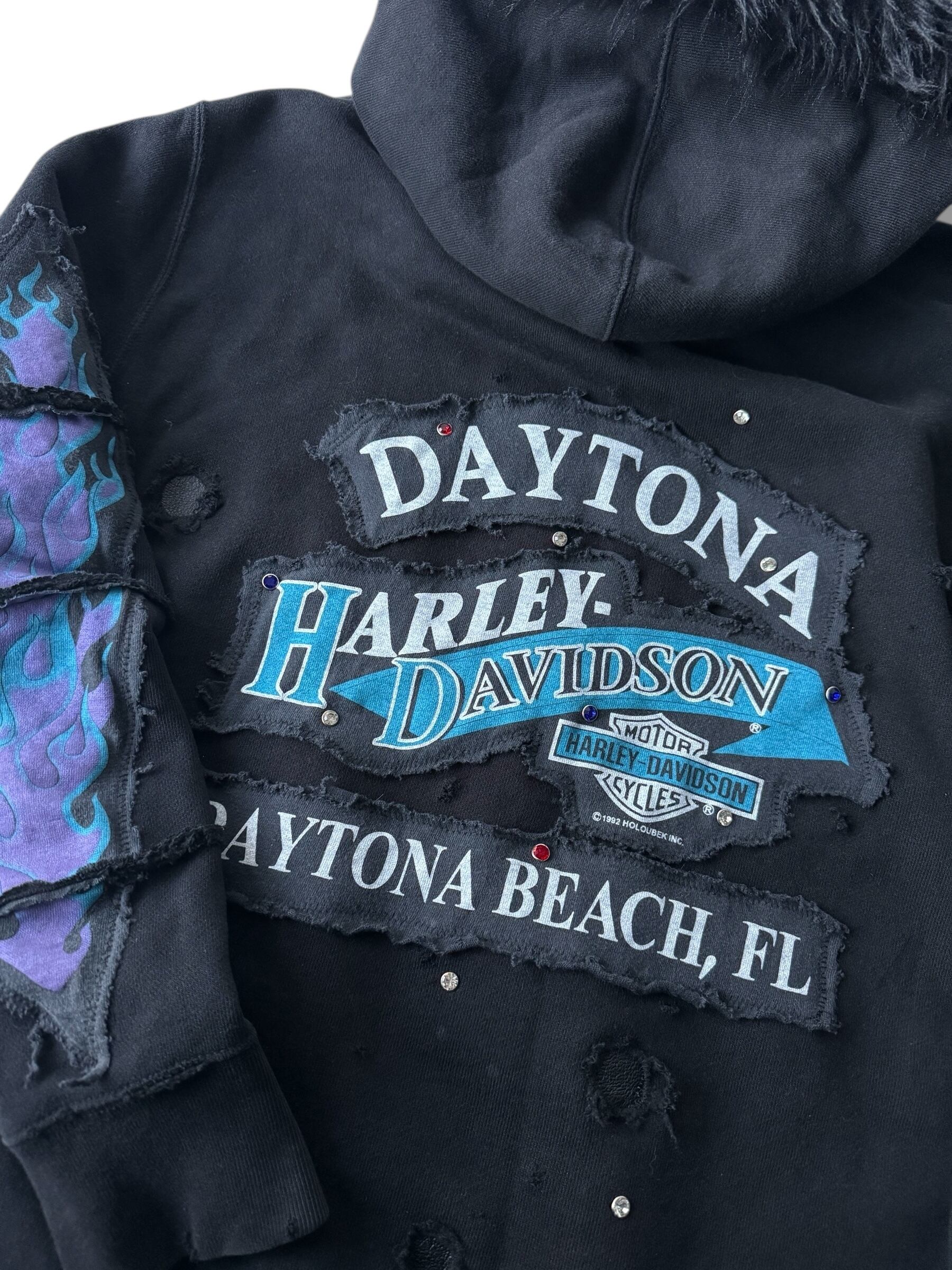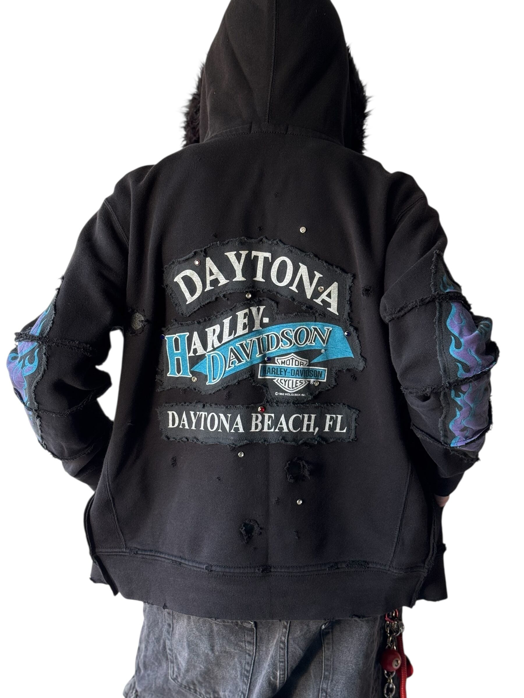 RALPH LAURENボディーを使用し、ハーレーダビッドソンのロゴを軸に、袖の地層のようなツギハギデザインと程よいダメージデザイン、CZスタッズなど魅力が盛りだくさんの1着✨️