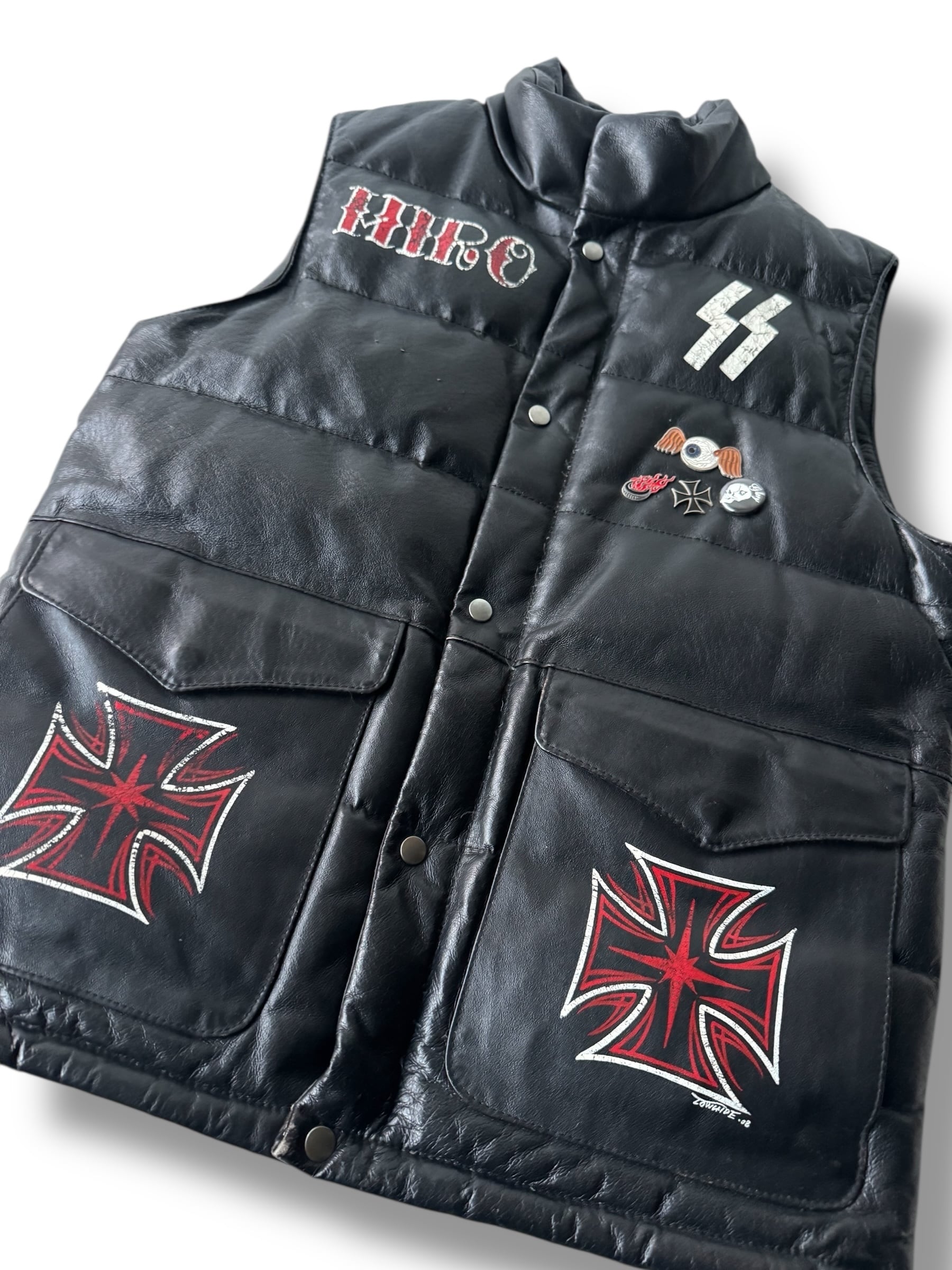 漆黒レザーにハンドペインティングでアイアンクロスや"ss" さらにはセレクトされたピンバッチがかなりセンス良すぎなバイカーズテンションの圧倒的存在感‼️