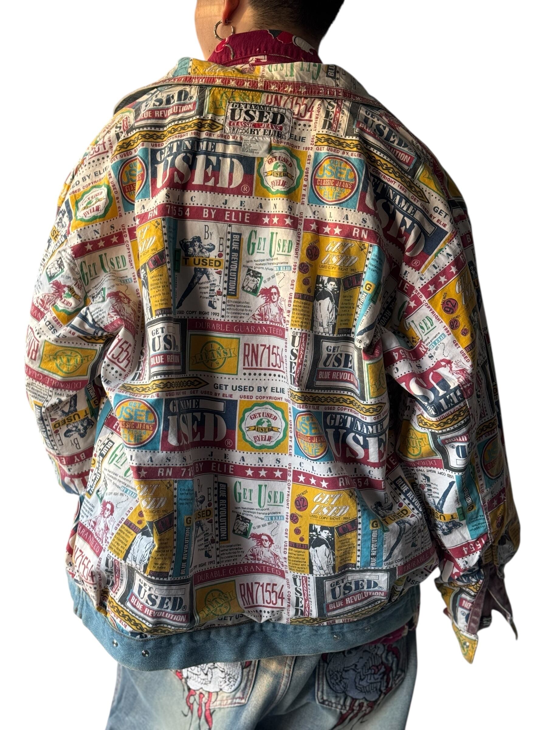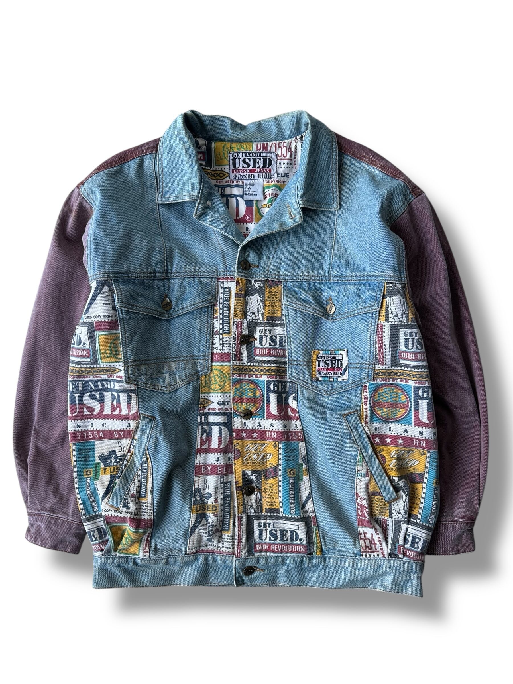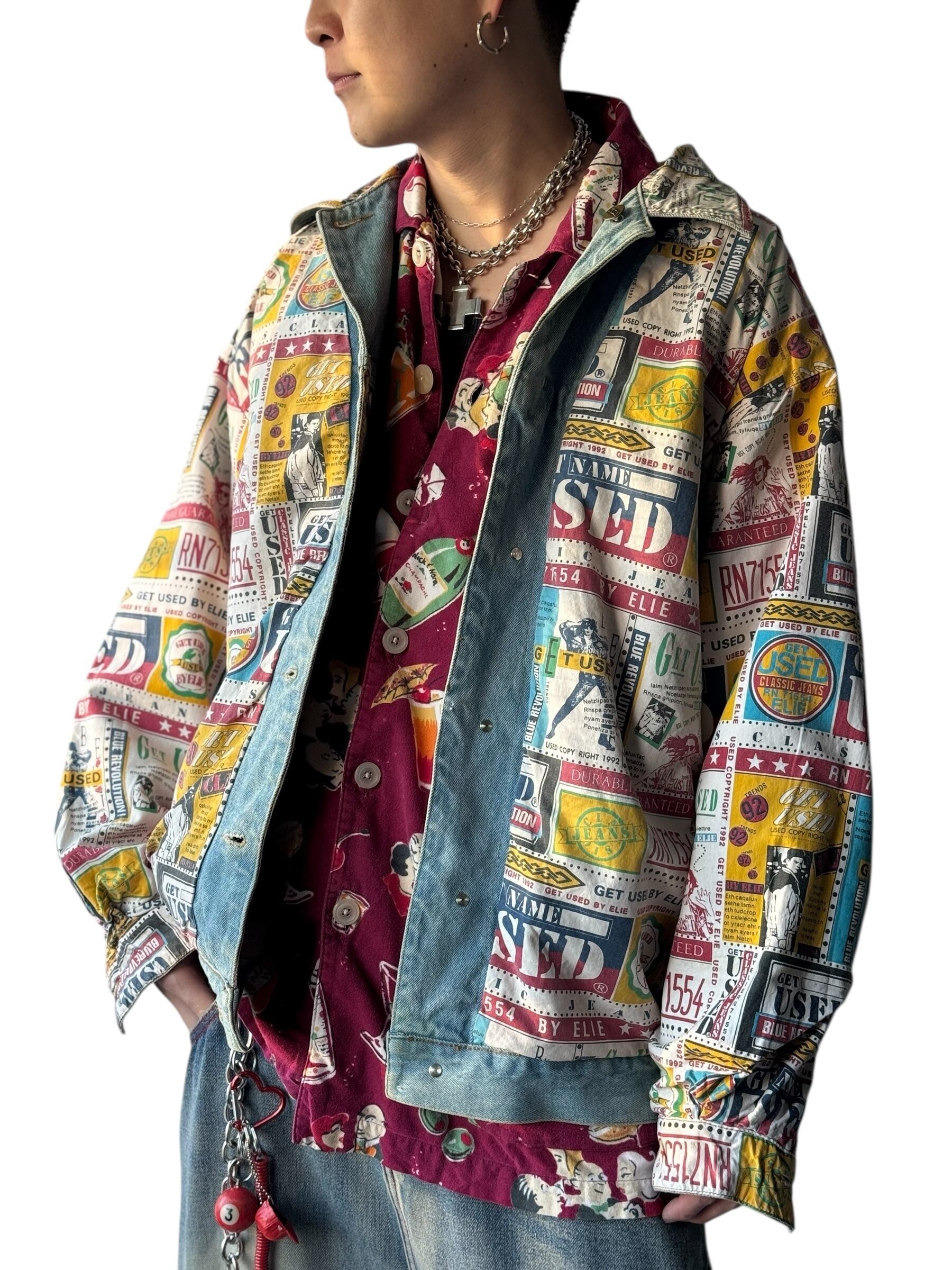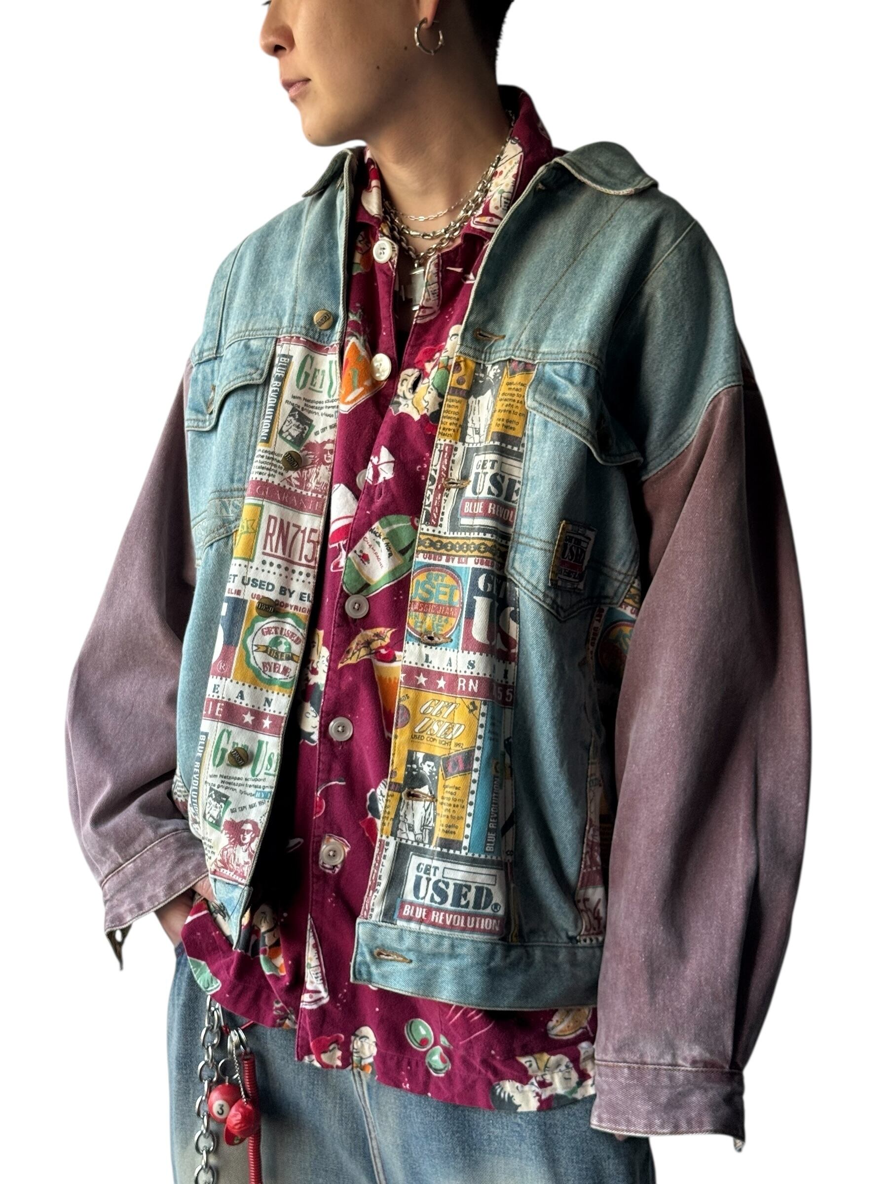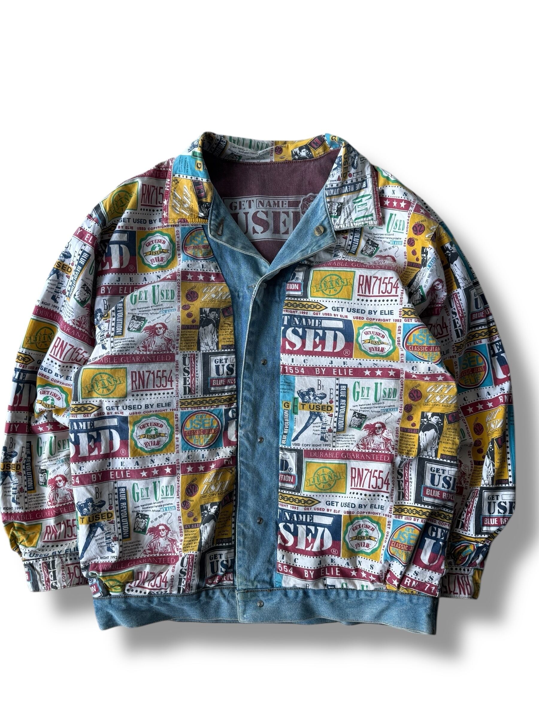 ♾90’s GET NAME USED♾ graphic poster all over patterned switching design denim jacket sizeM