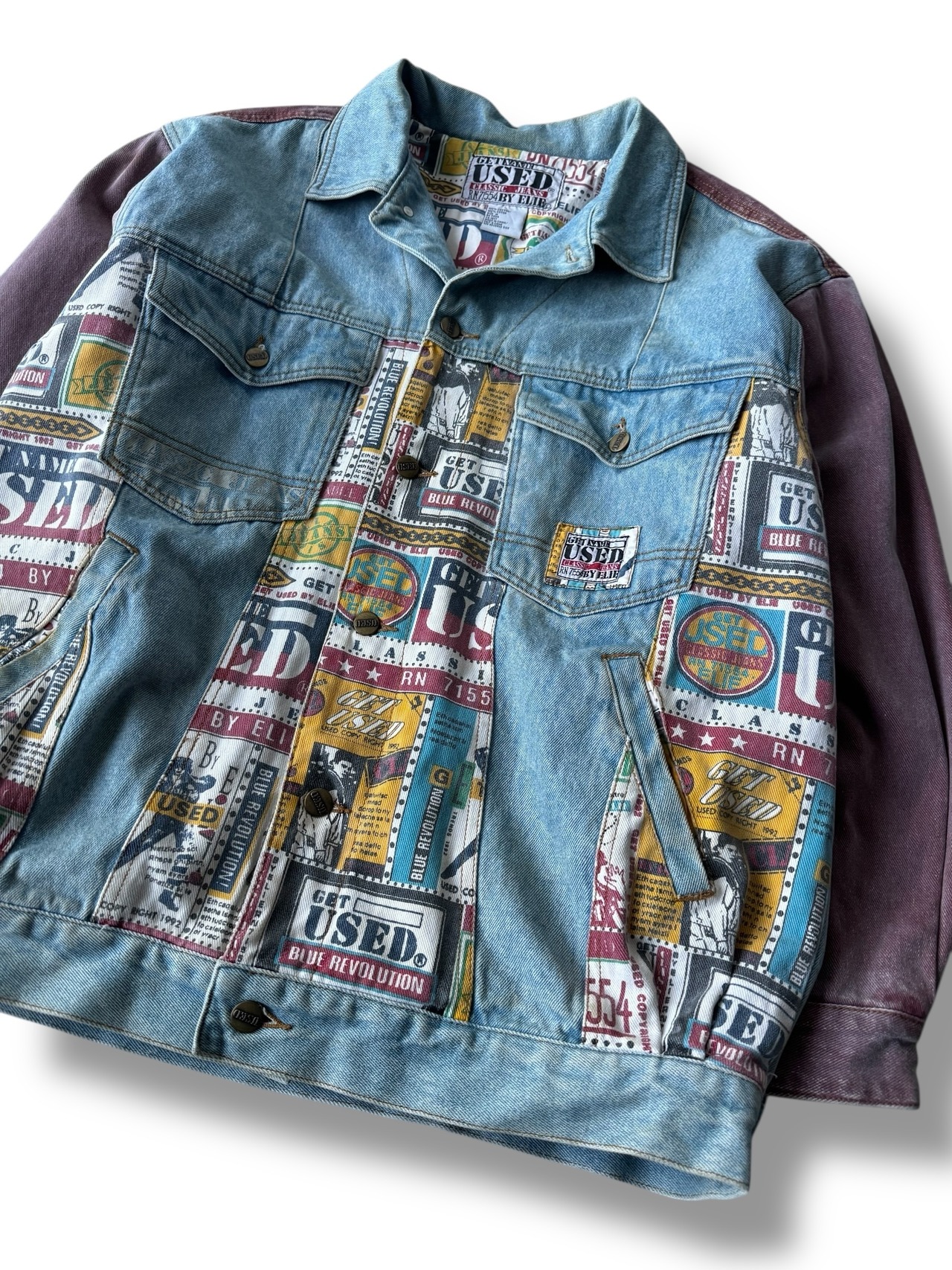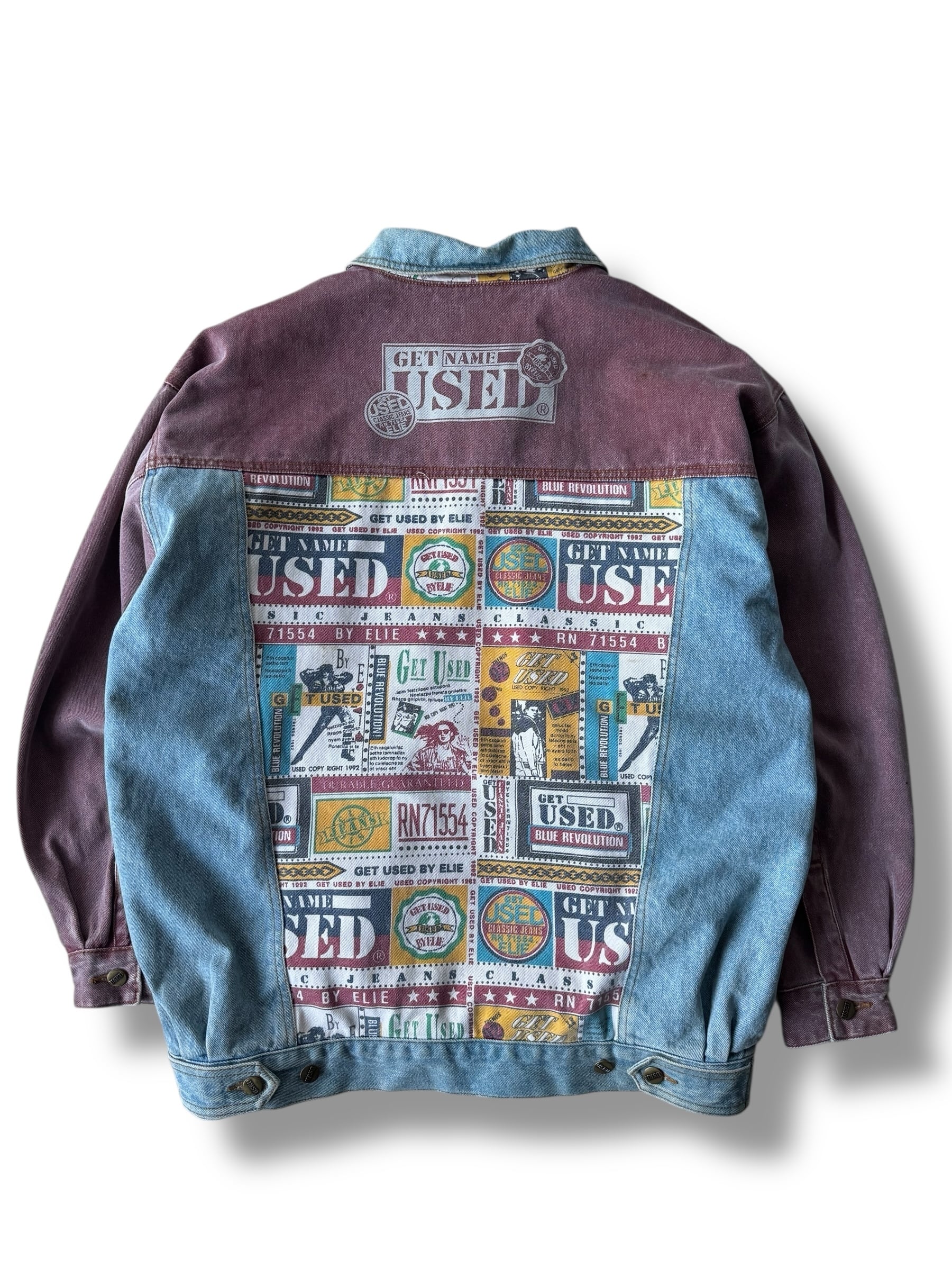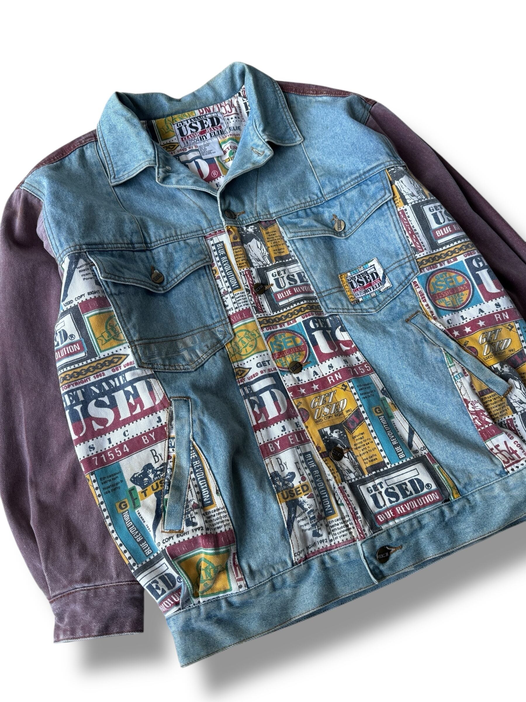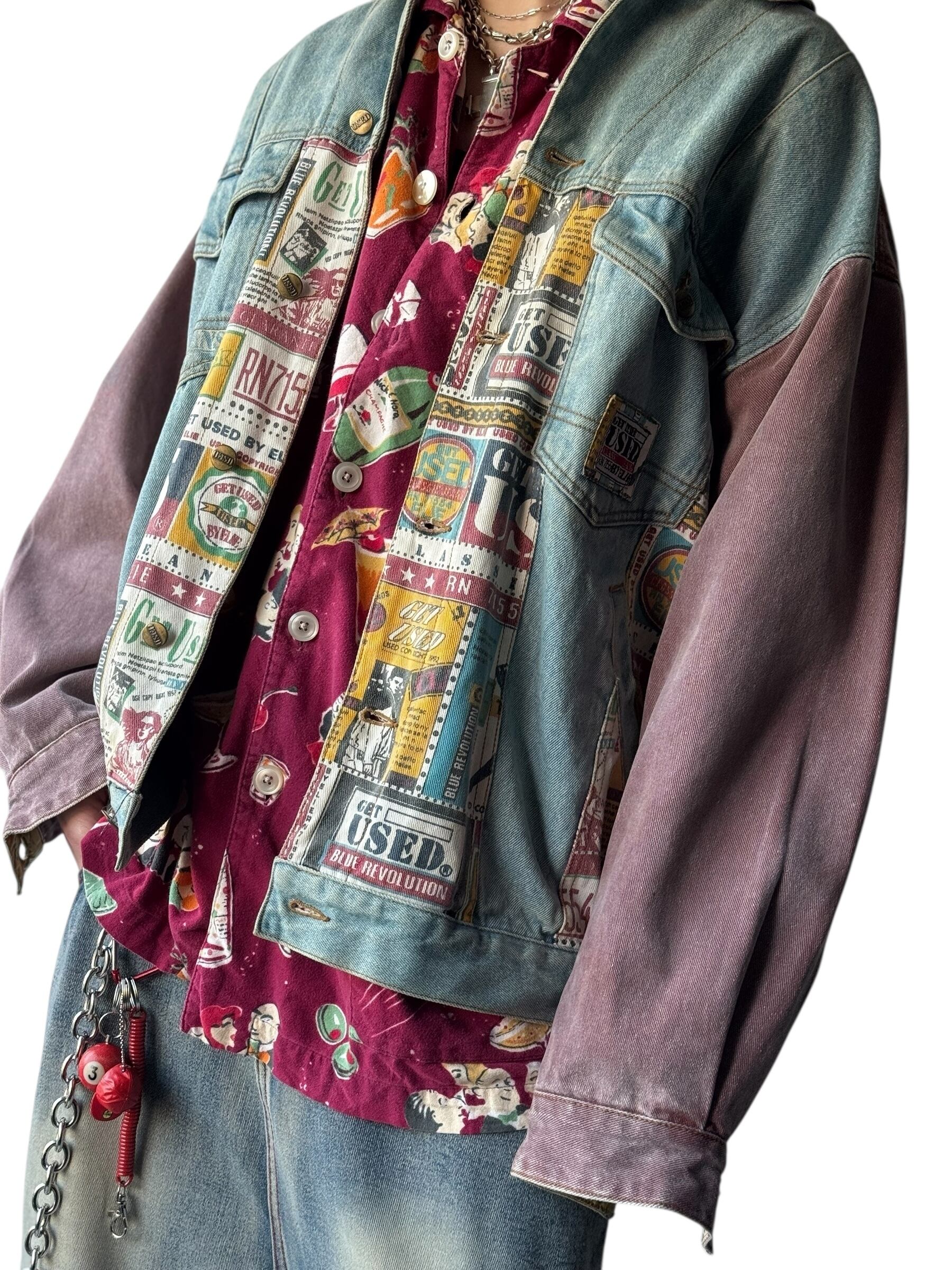 ♾90’s GET NAME USED♾ graphic poster all over patterned switching design denim jacket sizeM
