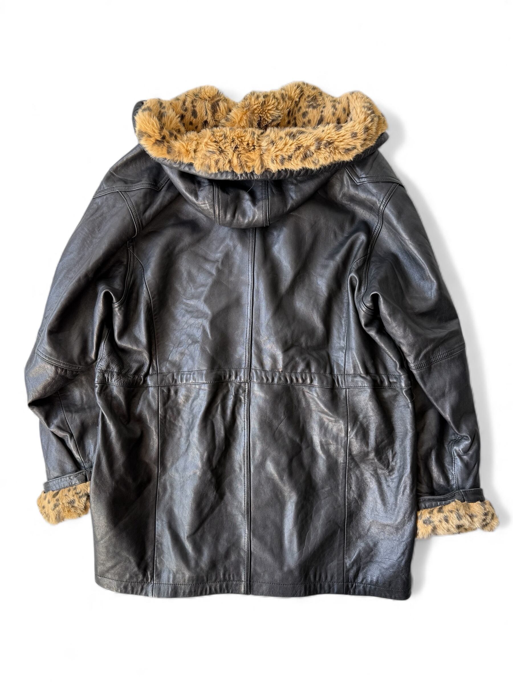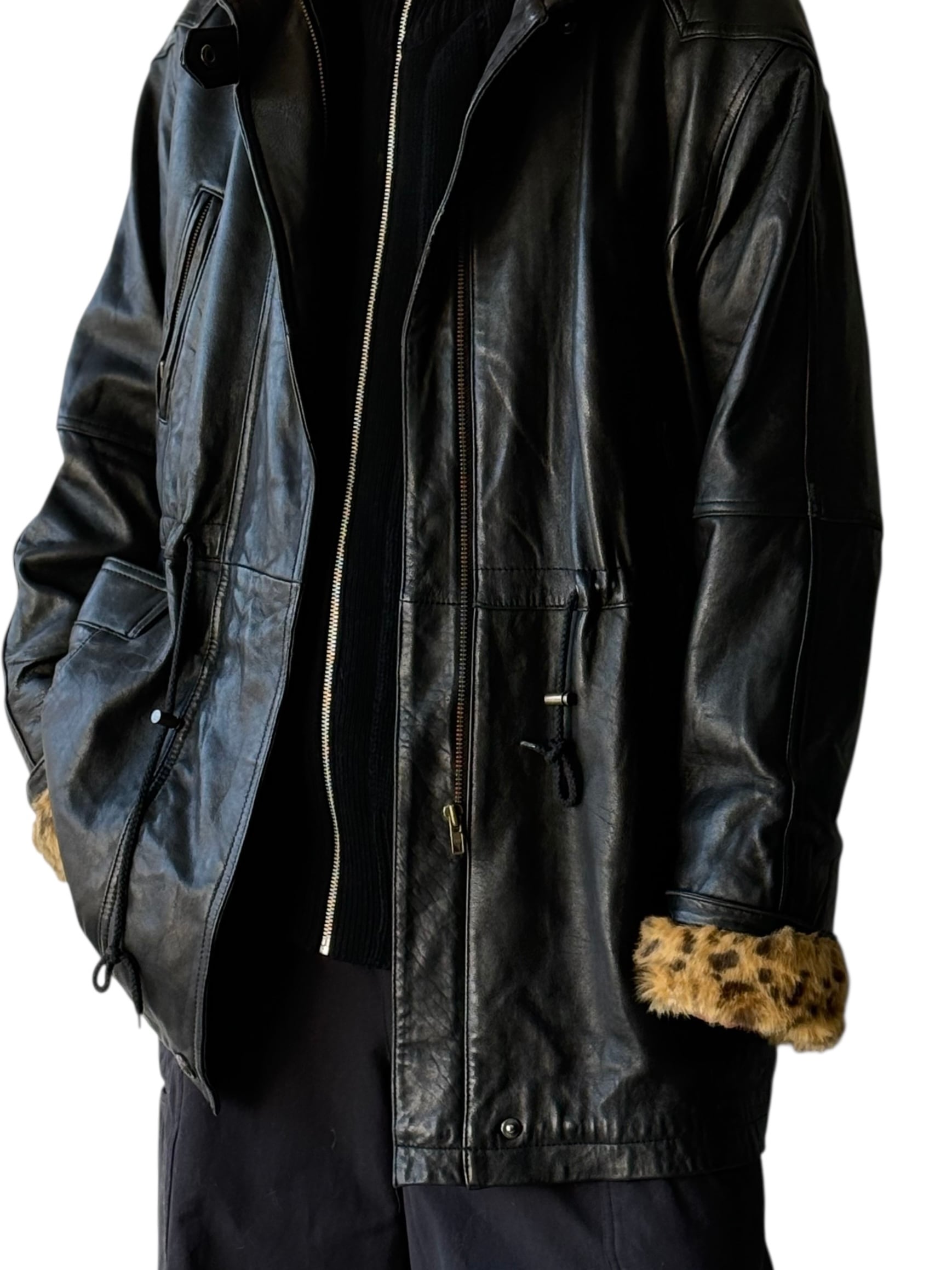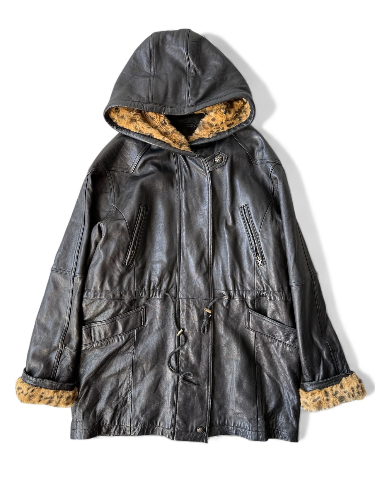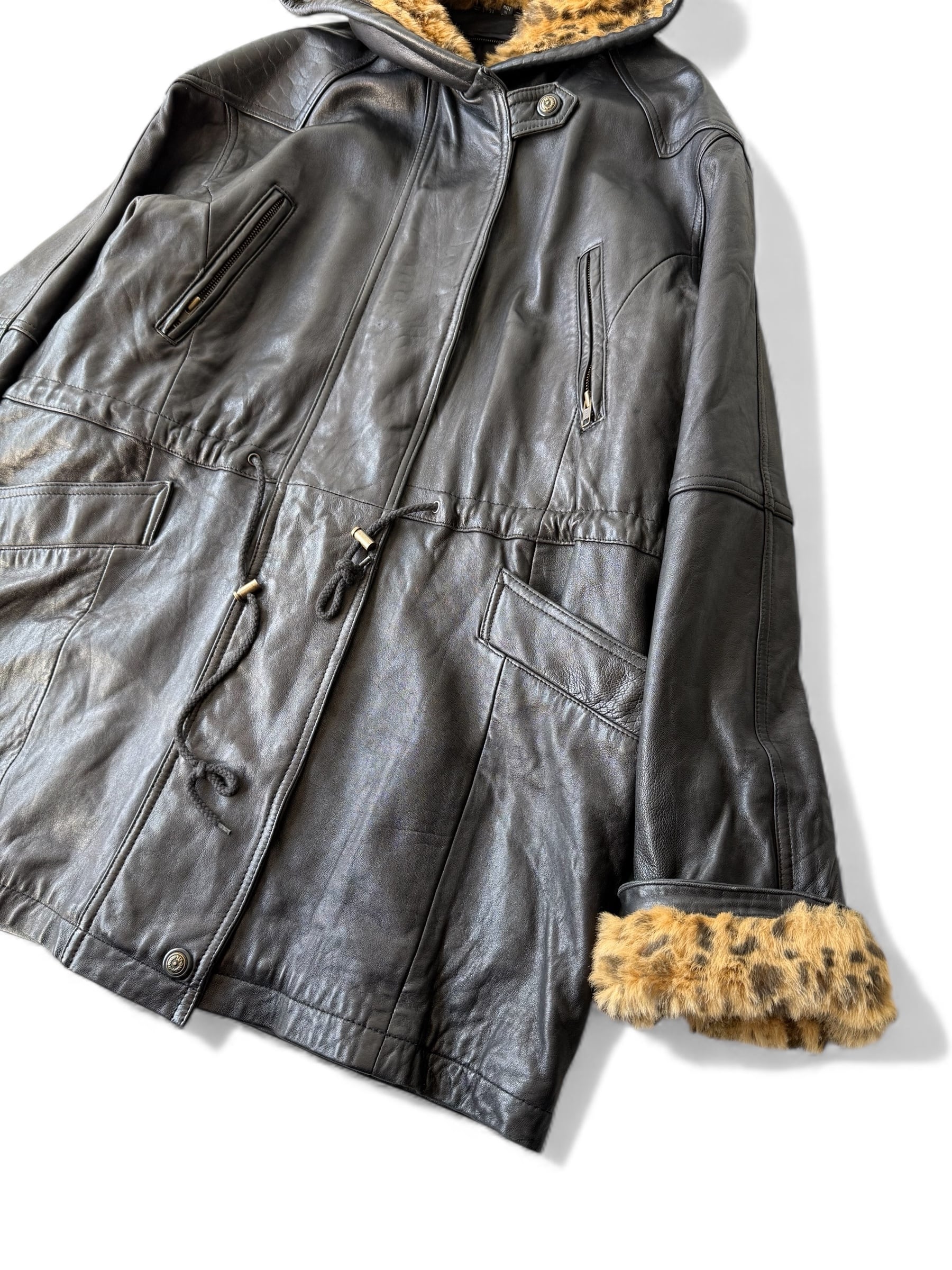 【90s unknown】Leopard faux fur swiching hooded leather coat