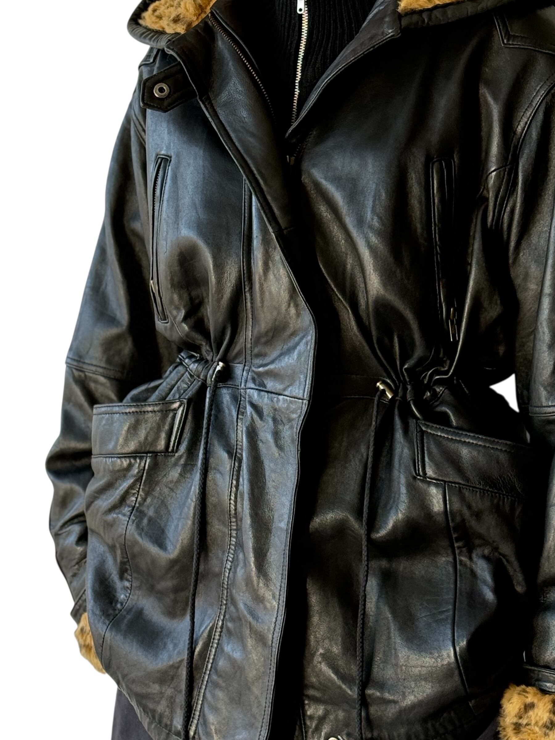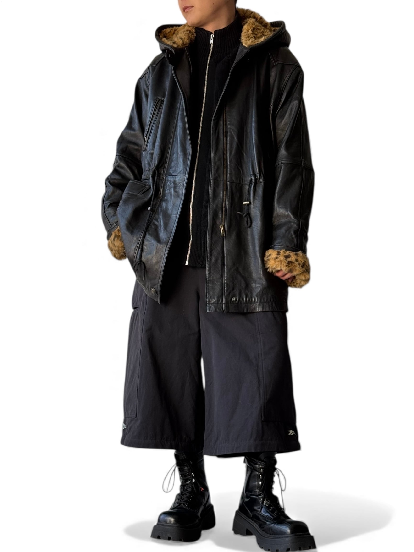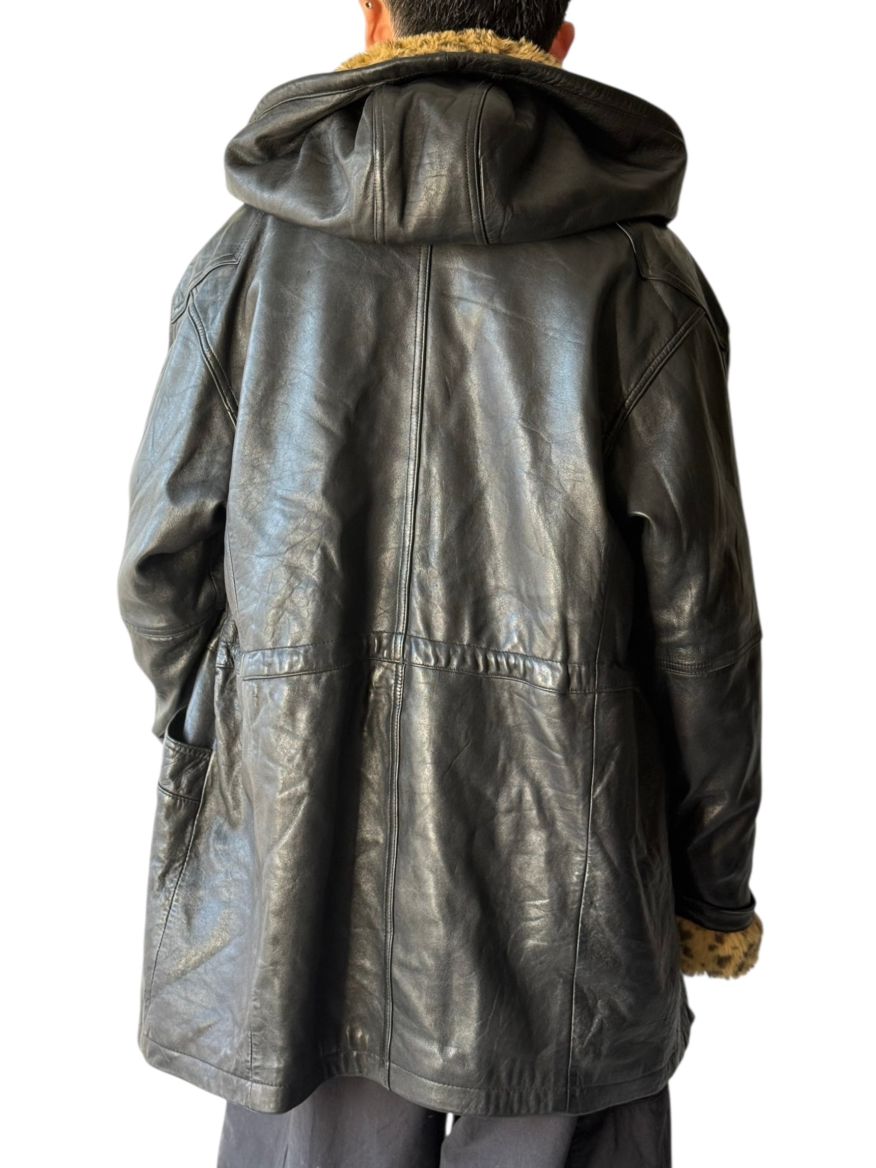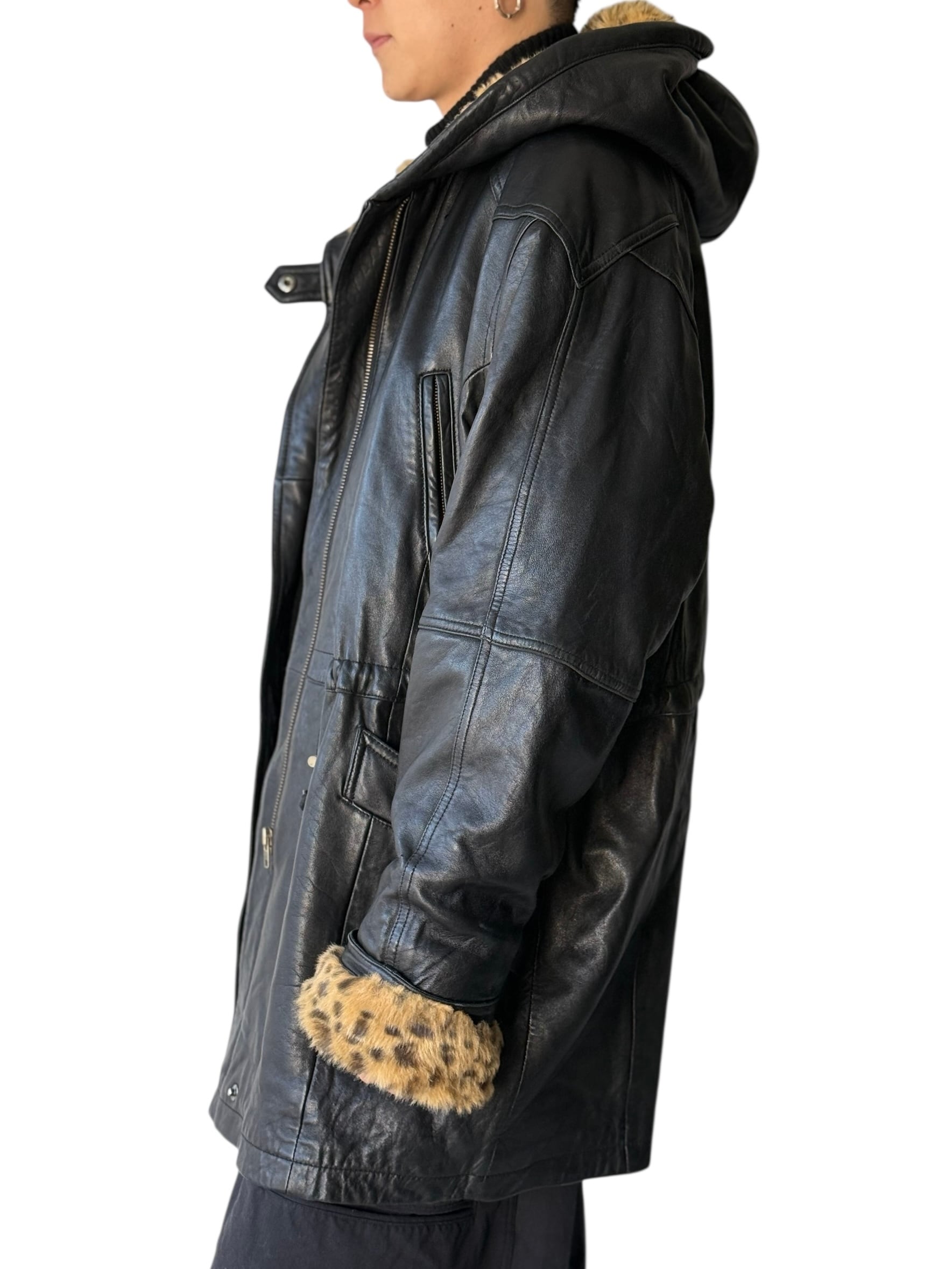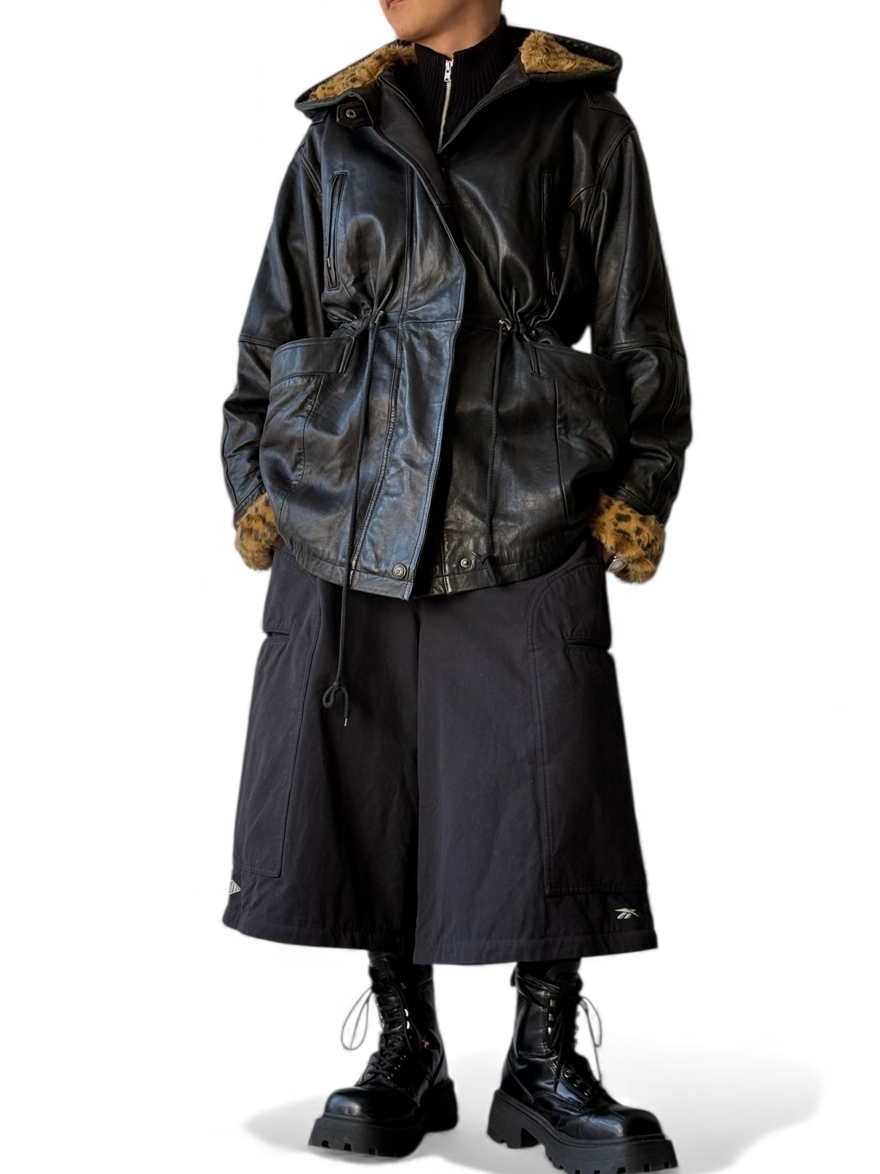 【90s unknown】Leopard faux fur swiching hooded leather coat