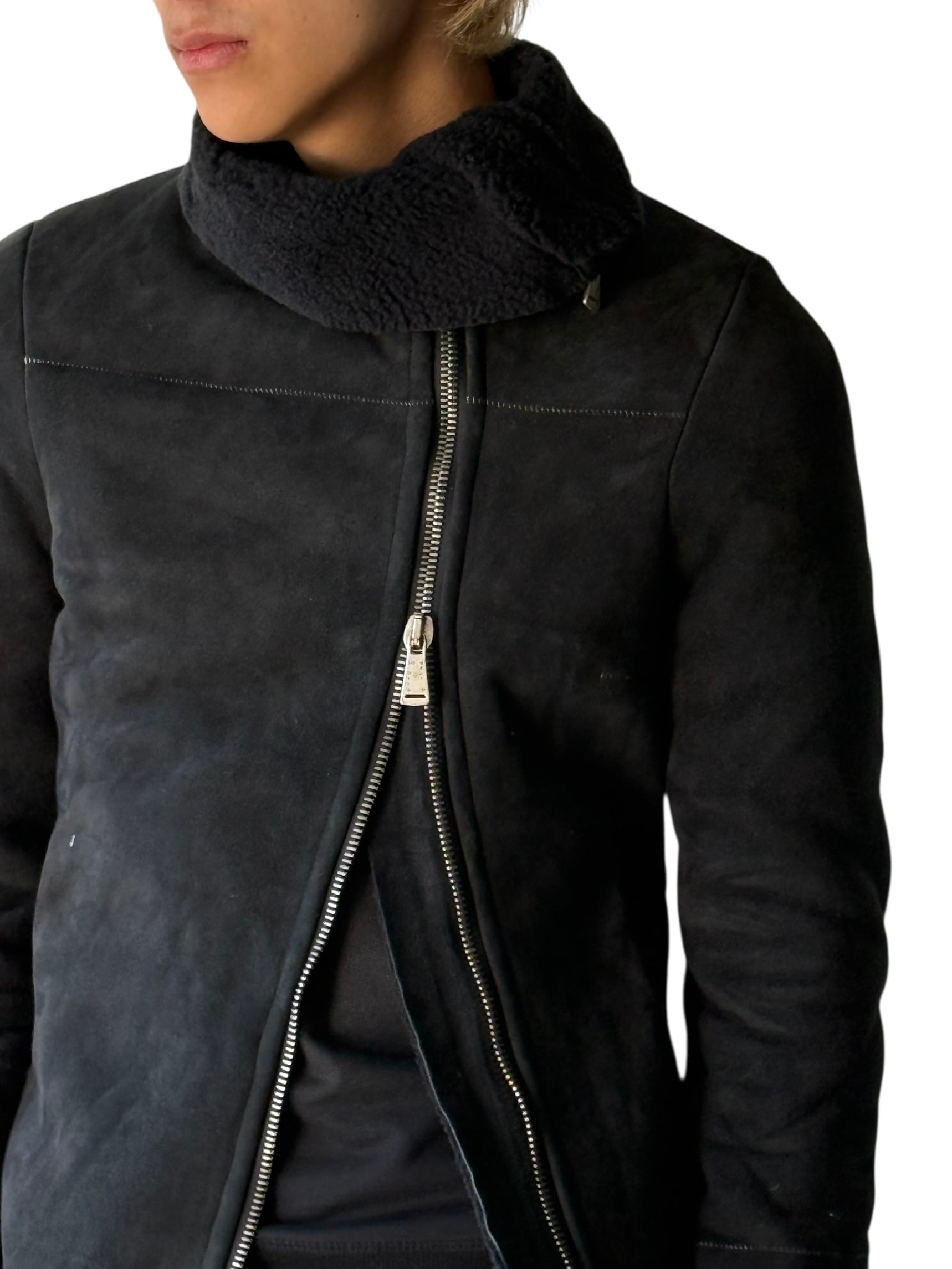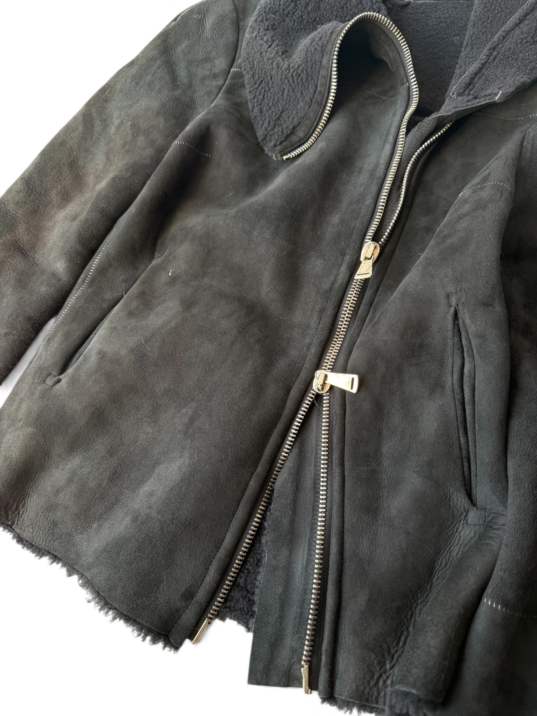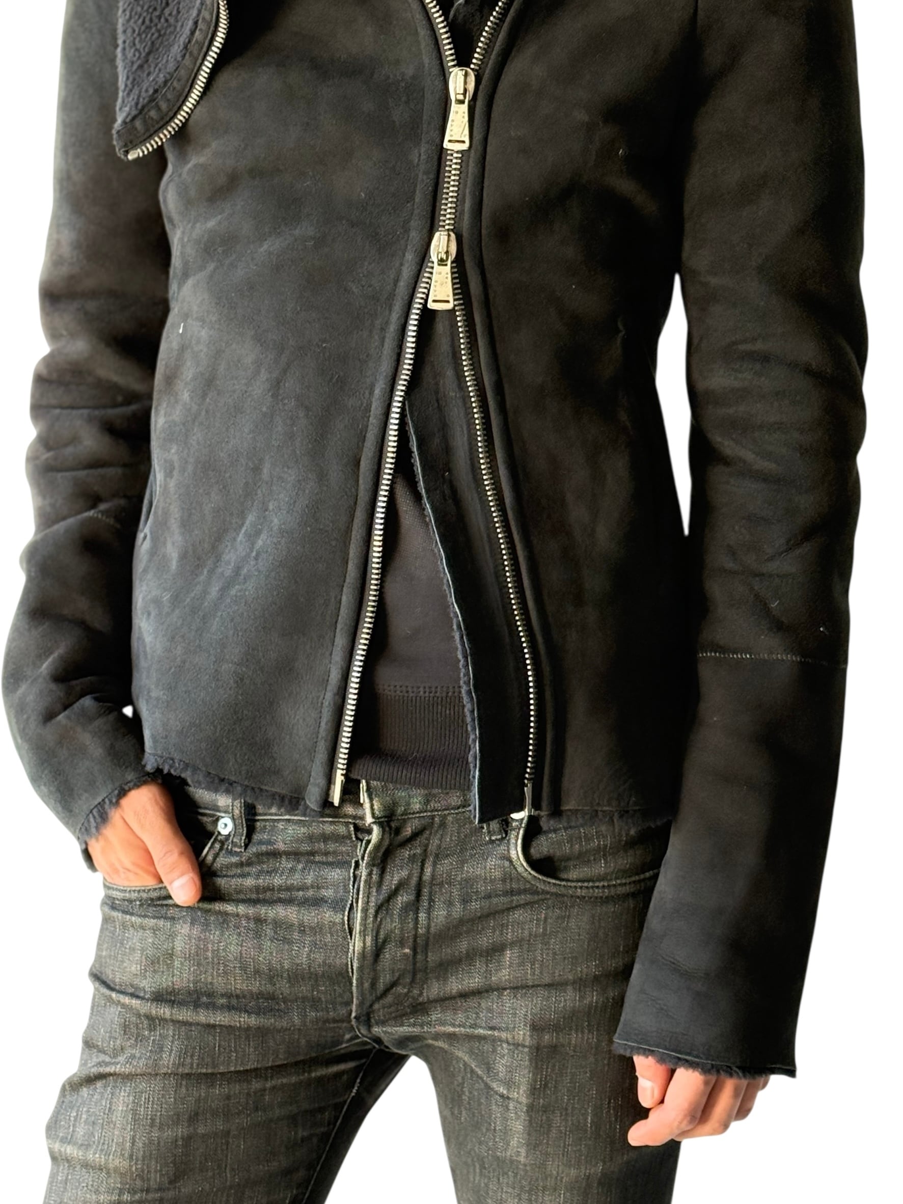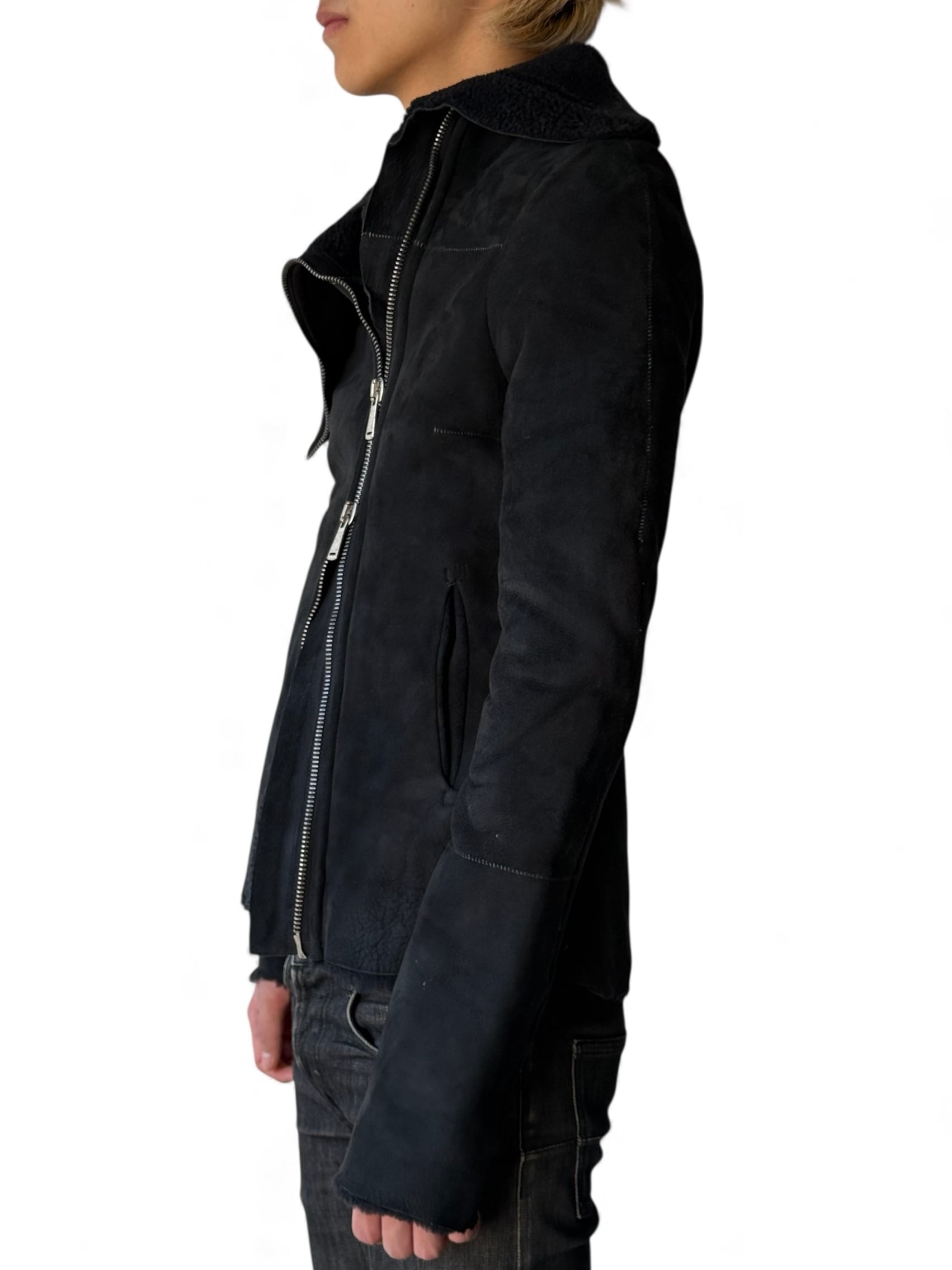 こちらはシンプルでタイトなデザインのリアルムートンジャケットですが、シルバーのダブルジップや首元のデザインなどリックなどブランド好きにはたまらないデザインの高さ◎
