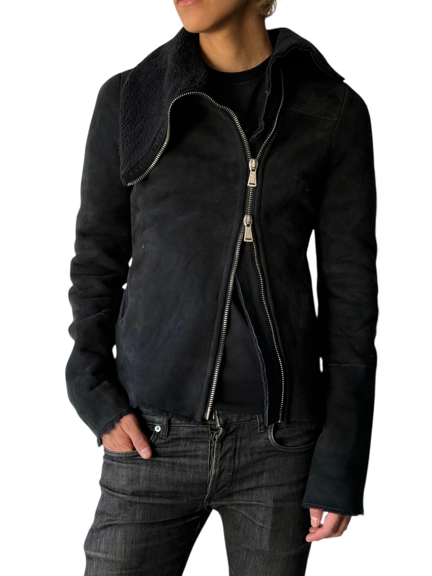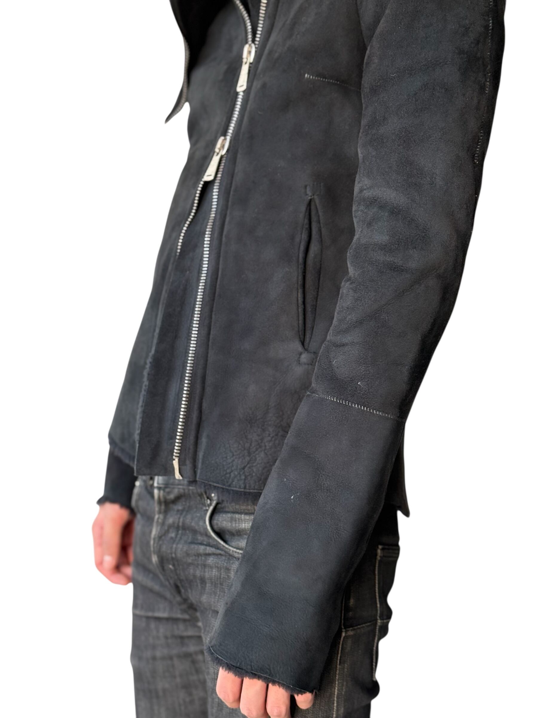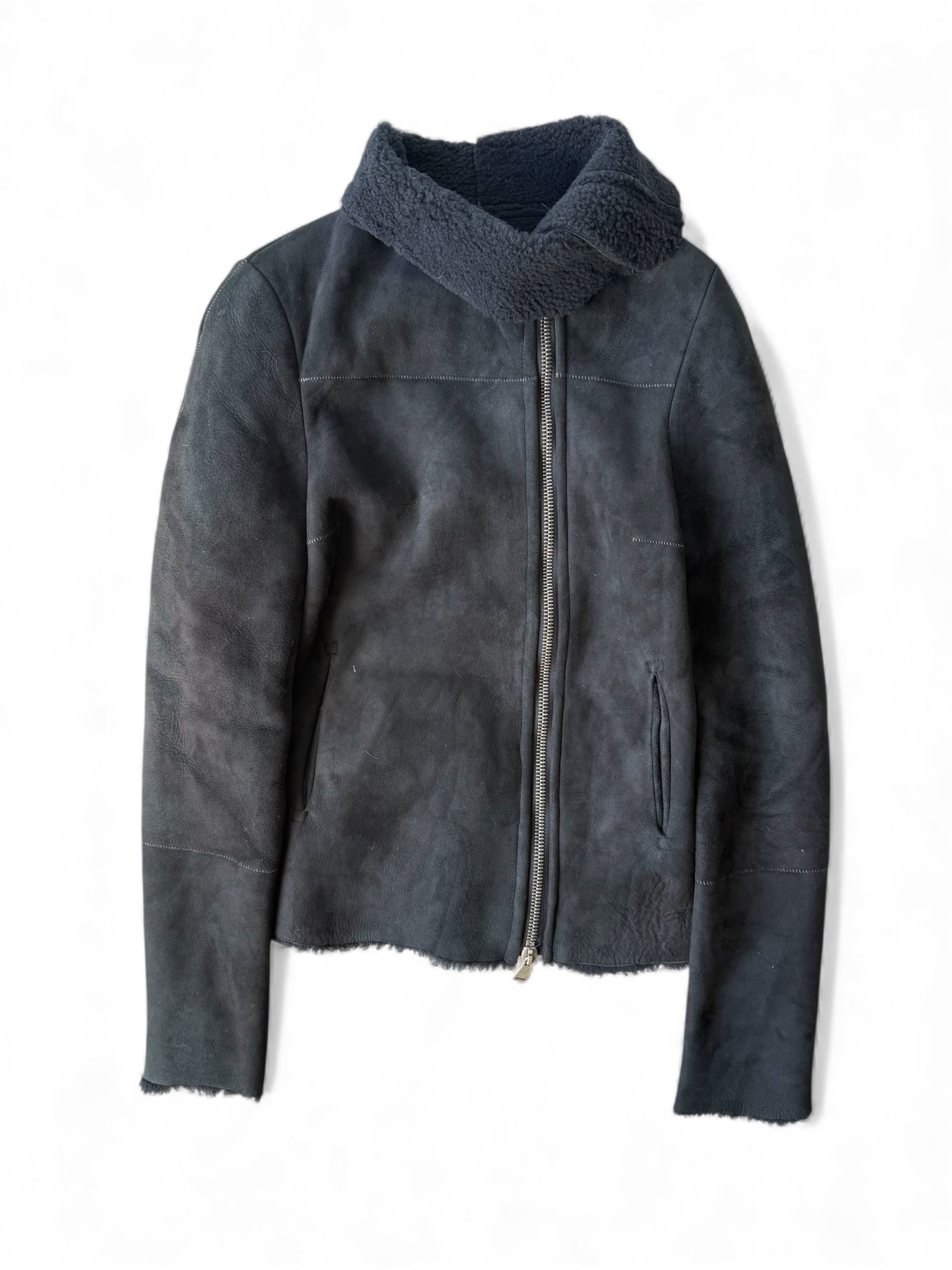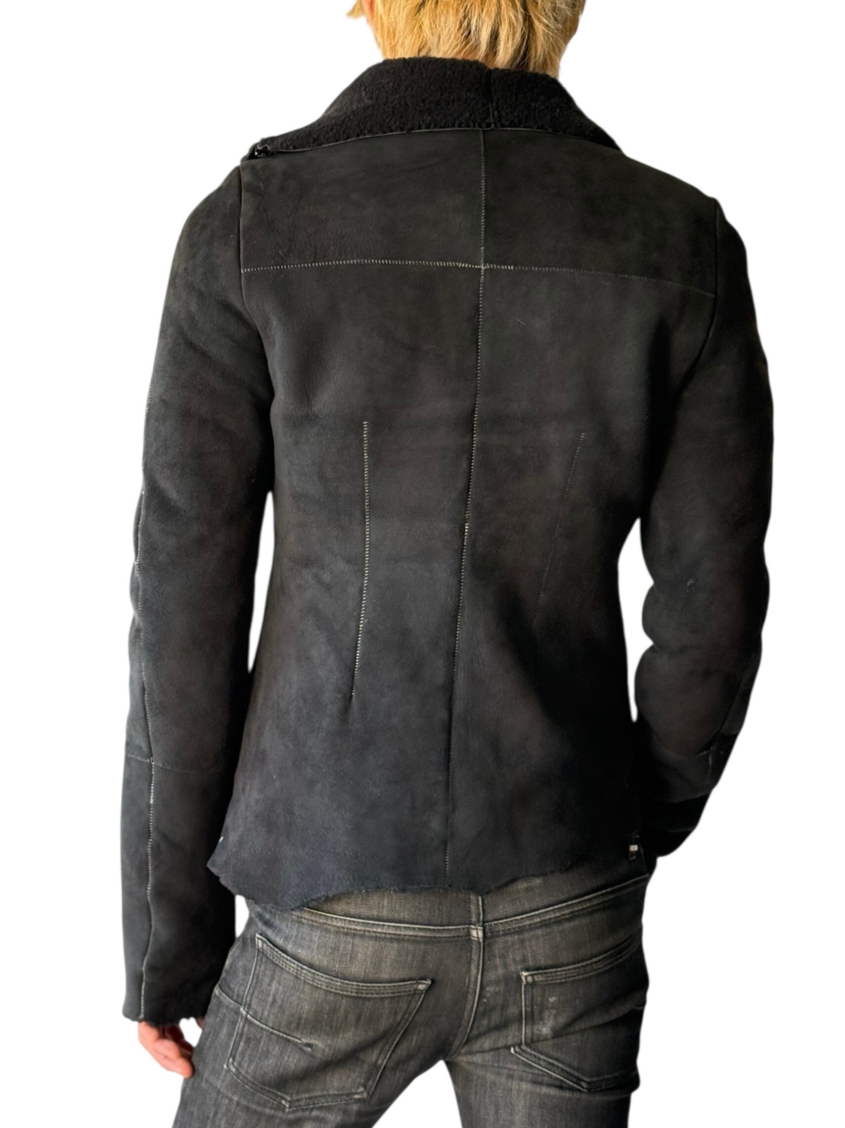 こちらはシンプルでタイトなデザインのリアルムートンジャケットですが、シルバーのダブルジップや首元のデザインなどリックなどブランド好きにはたまらないデザインの高さ◎