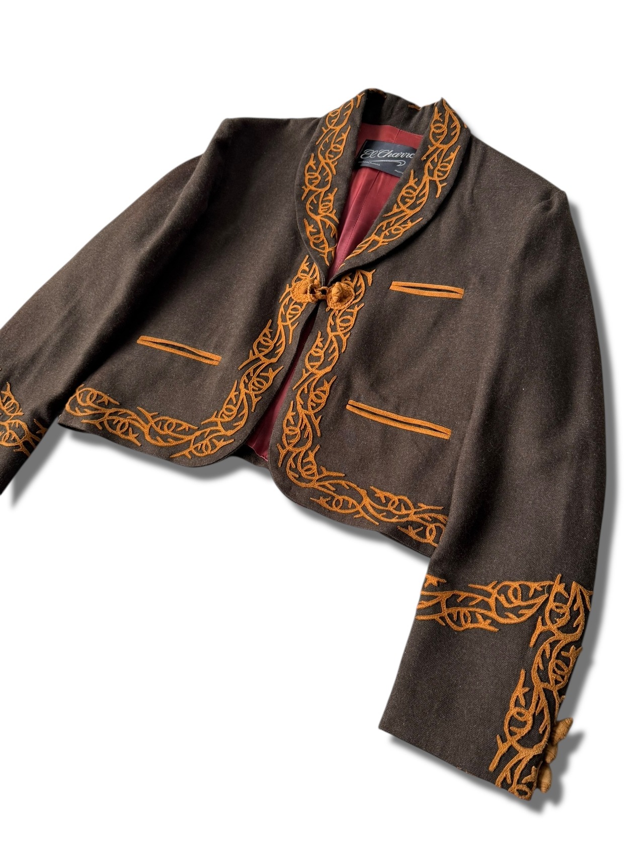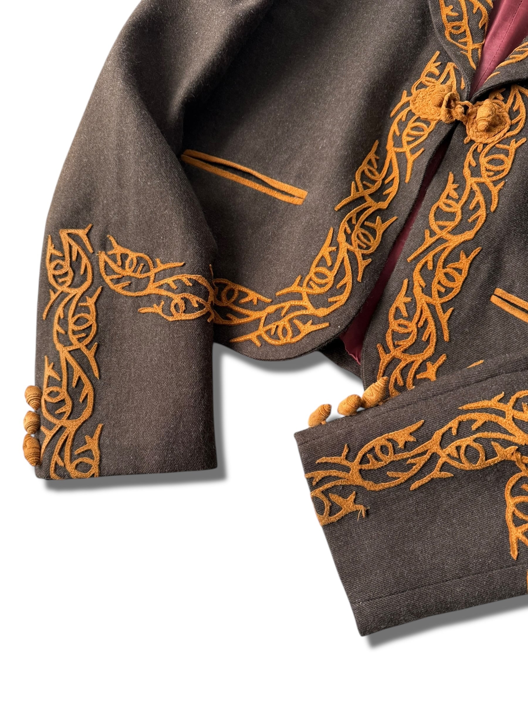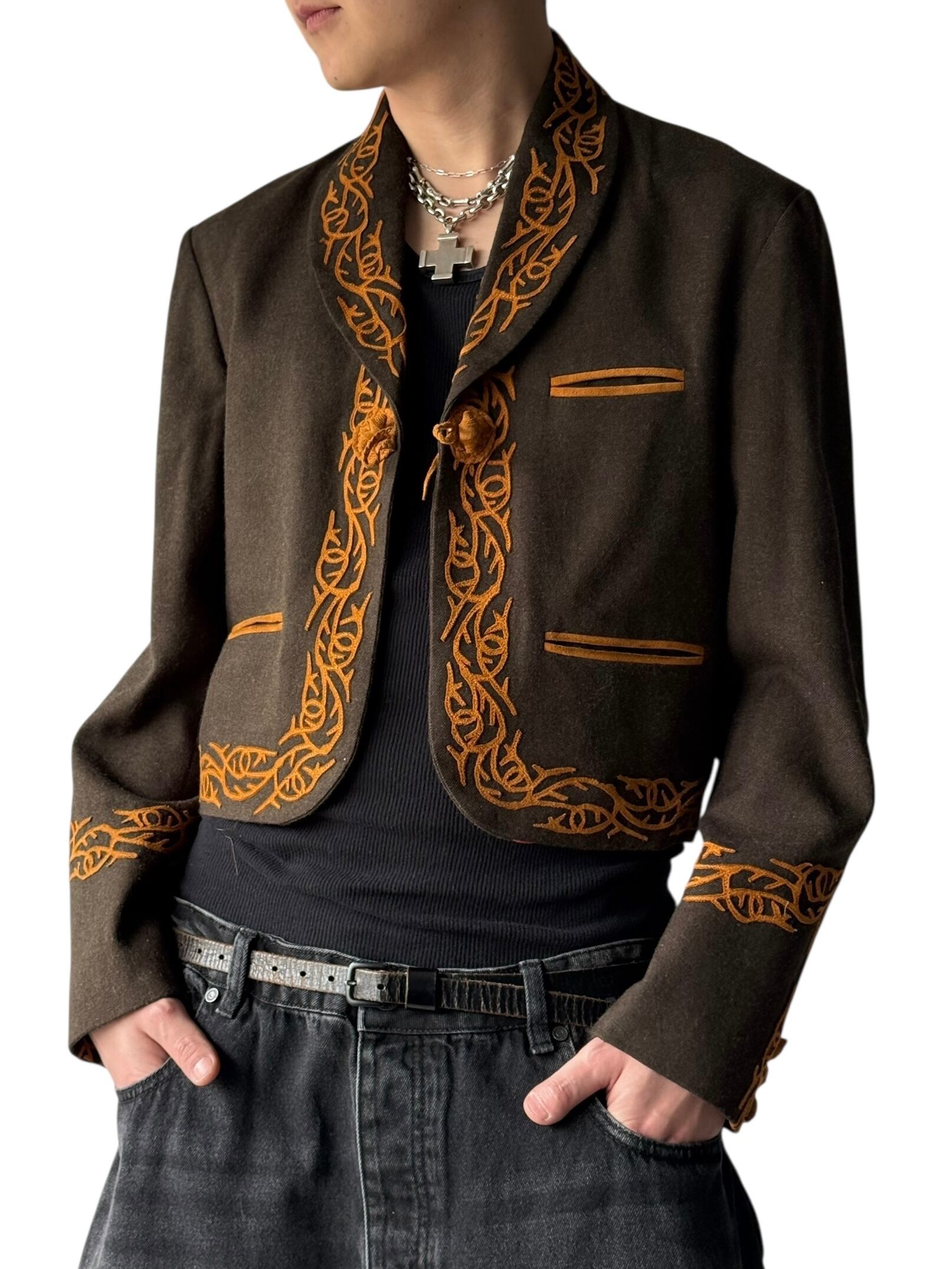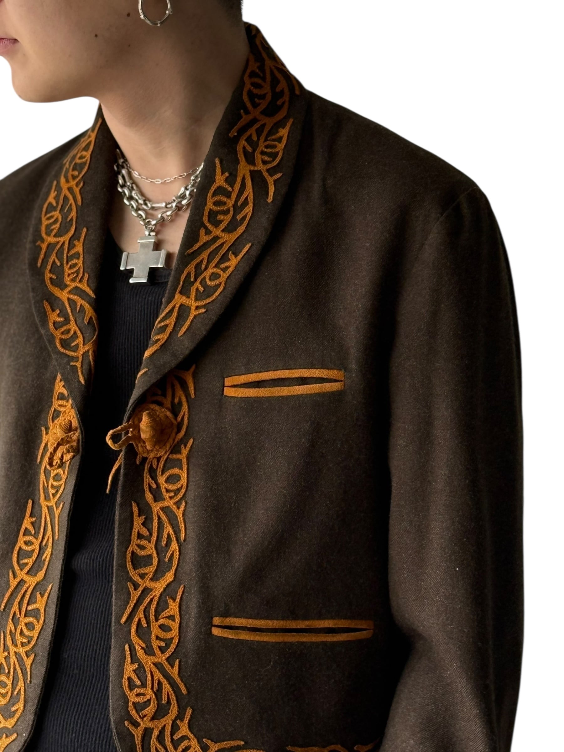 ショート丈で、アザミの葉や花、アステカのモチーフなどの複雑な刺繍が襟や袖口、ポケットにあしらわれているのが特徴的◎
