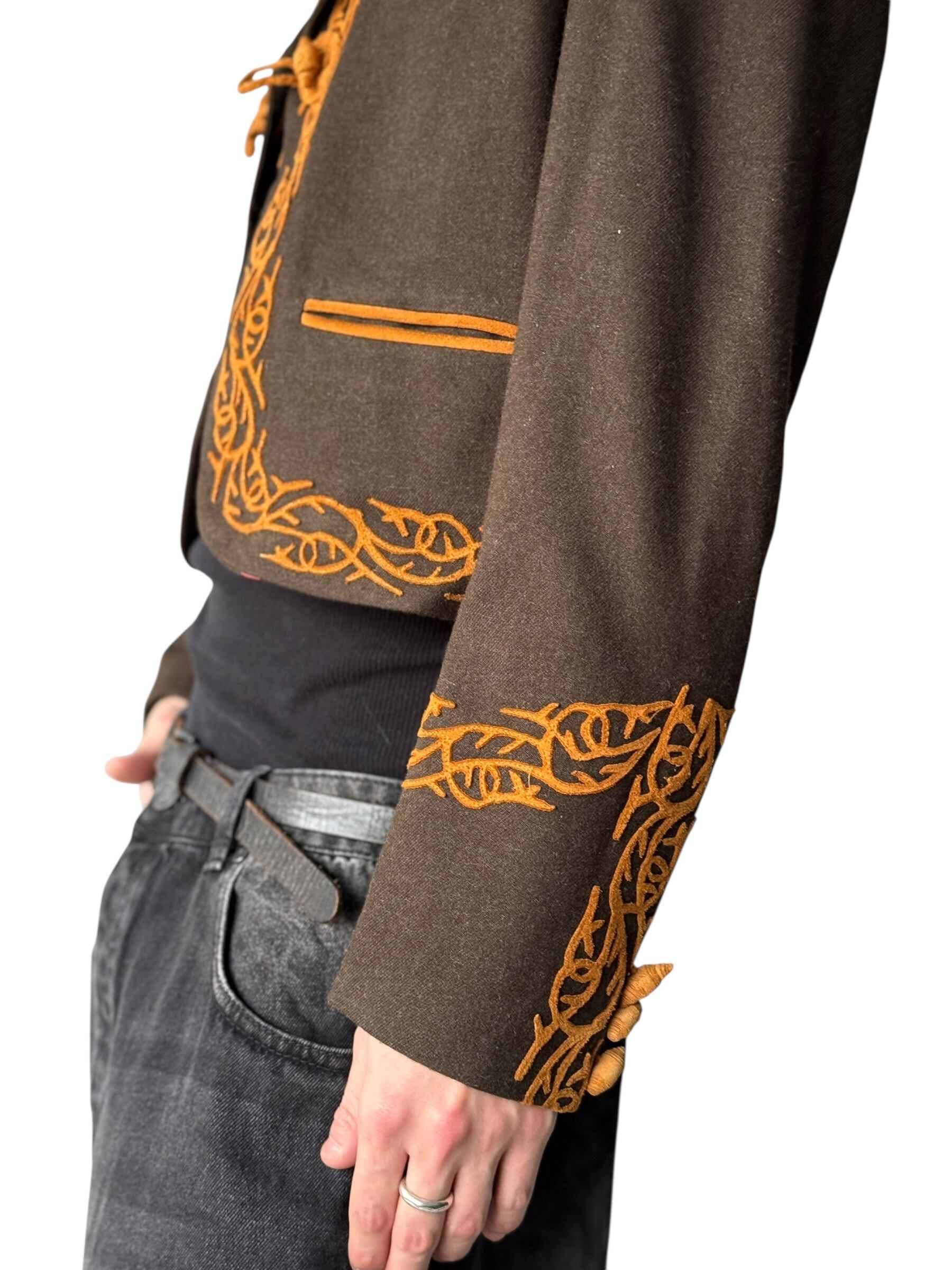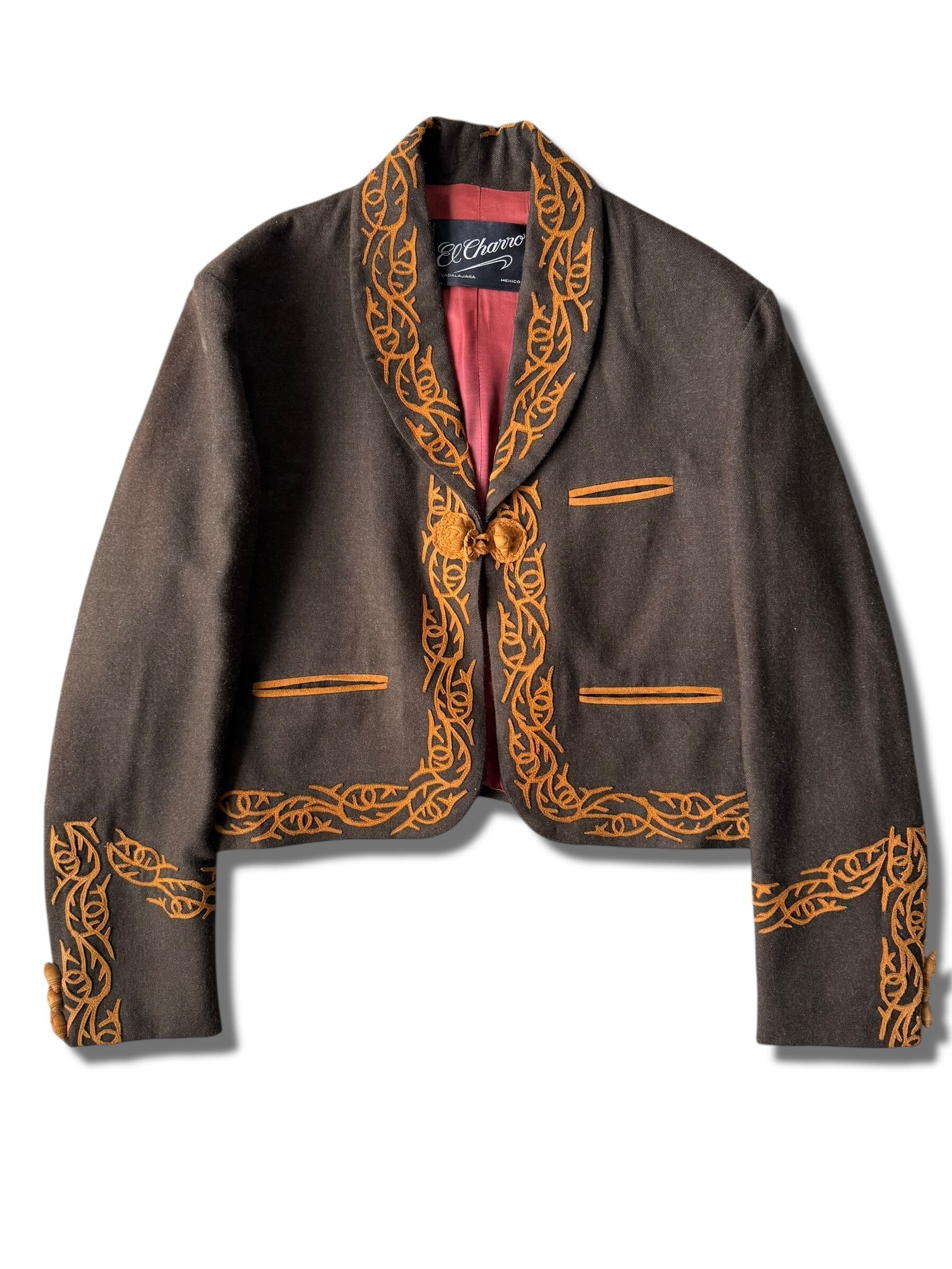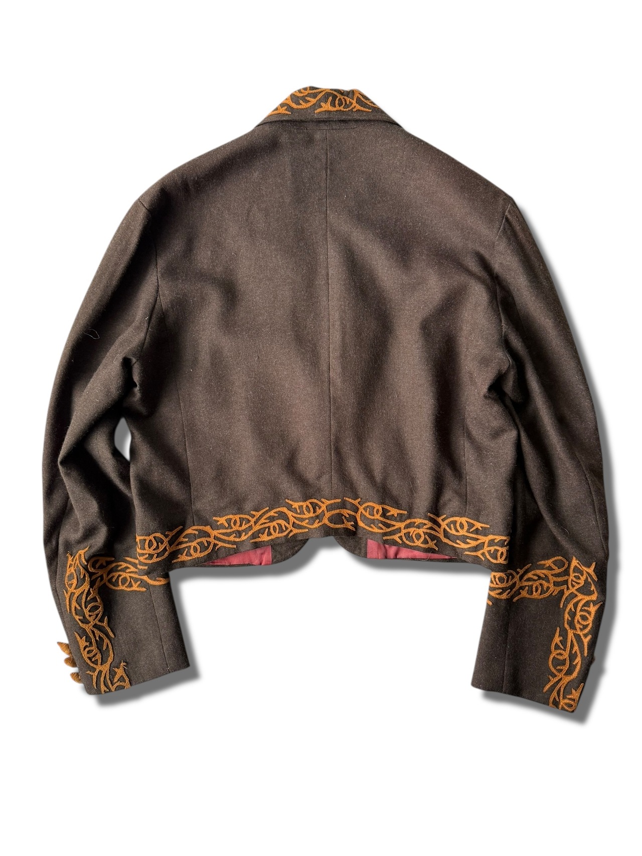 ショート丈で、アザミの葉や花、アステカのモチーフなどの複雑な刺繍が襟や袖口、ポケットにあしらわれているのが特徴的◎