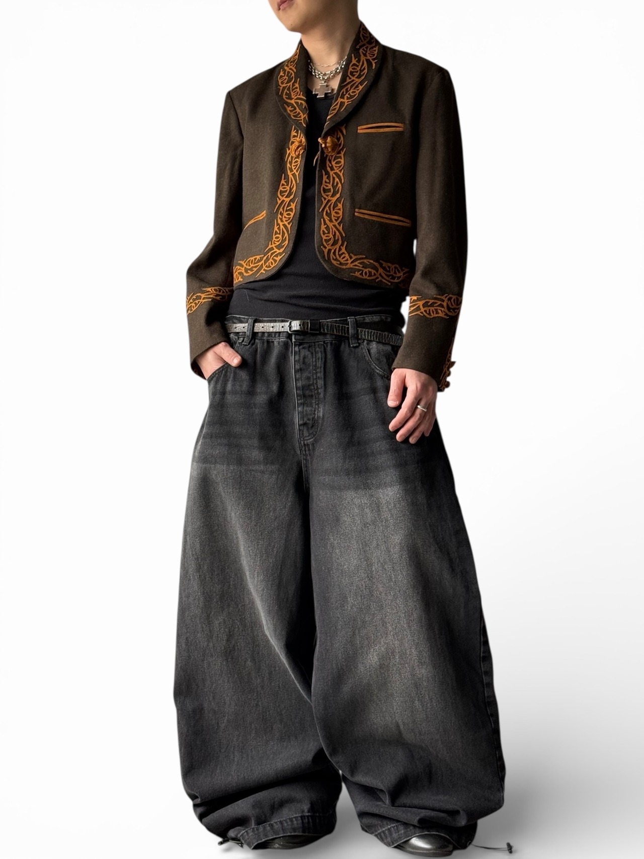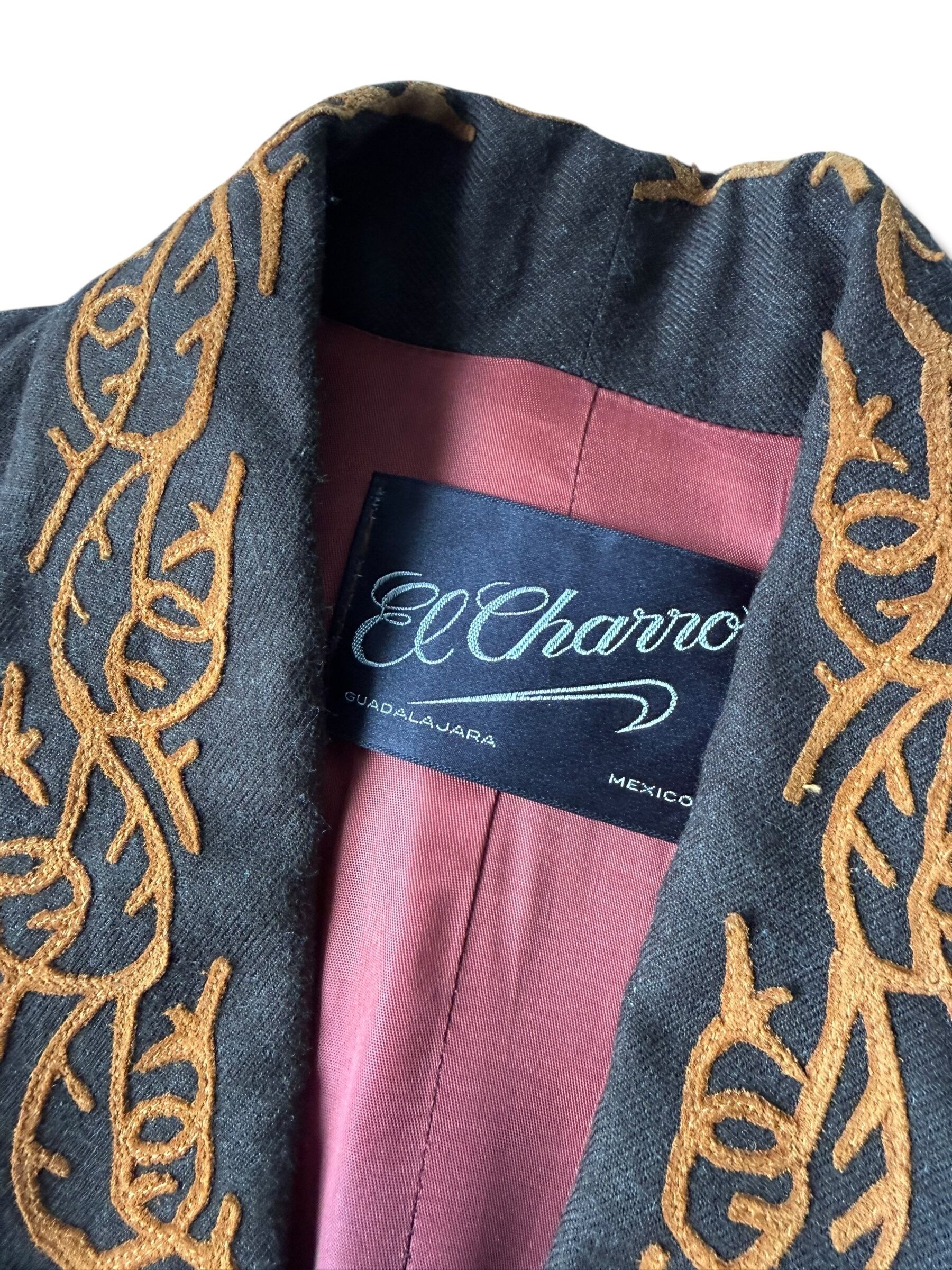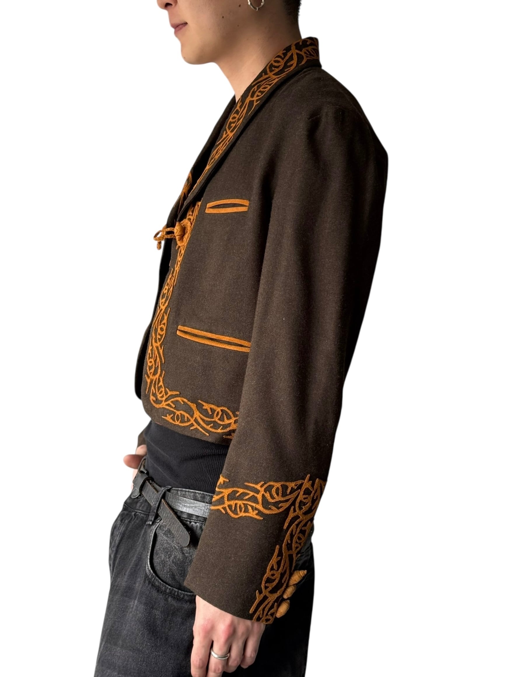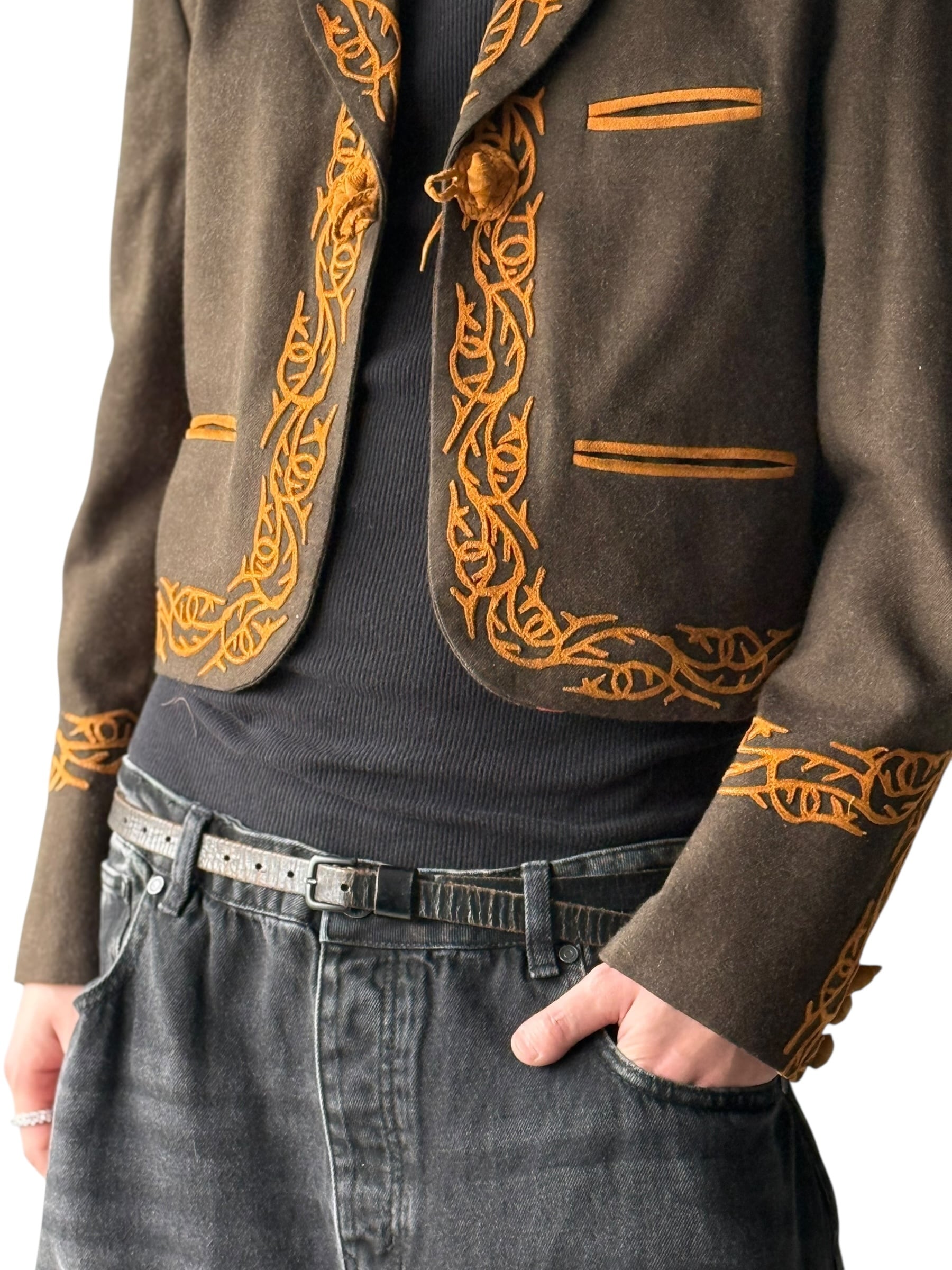 ショート丈で、アザミの葉や花、アステカのモチーフなどの複雑な刺繍が襟や袖口、ポケットにあしらわれているのが特徴的◎