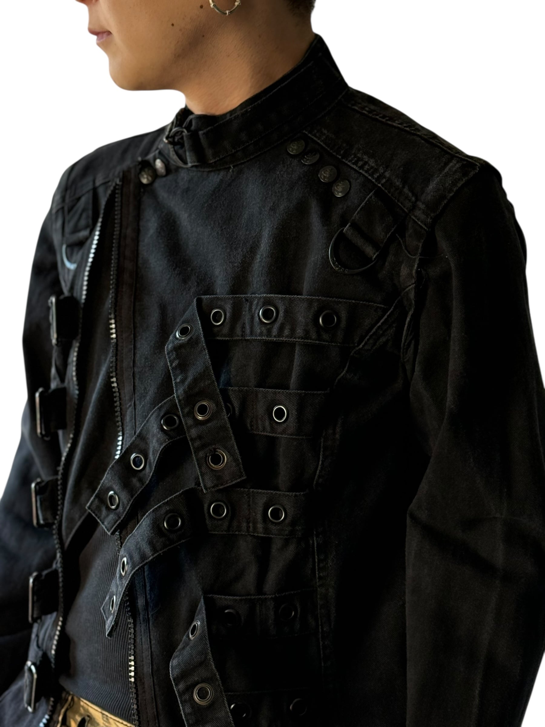 フロントの何十にも連なったベルトデザインがめちゃかっけ⤴︎⤴︎ 袖は取り外せるデタッチャブル仕様⚡️