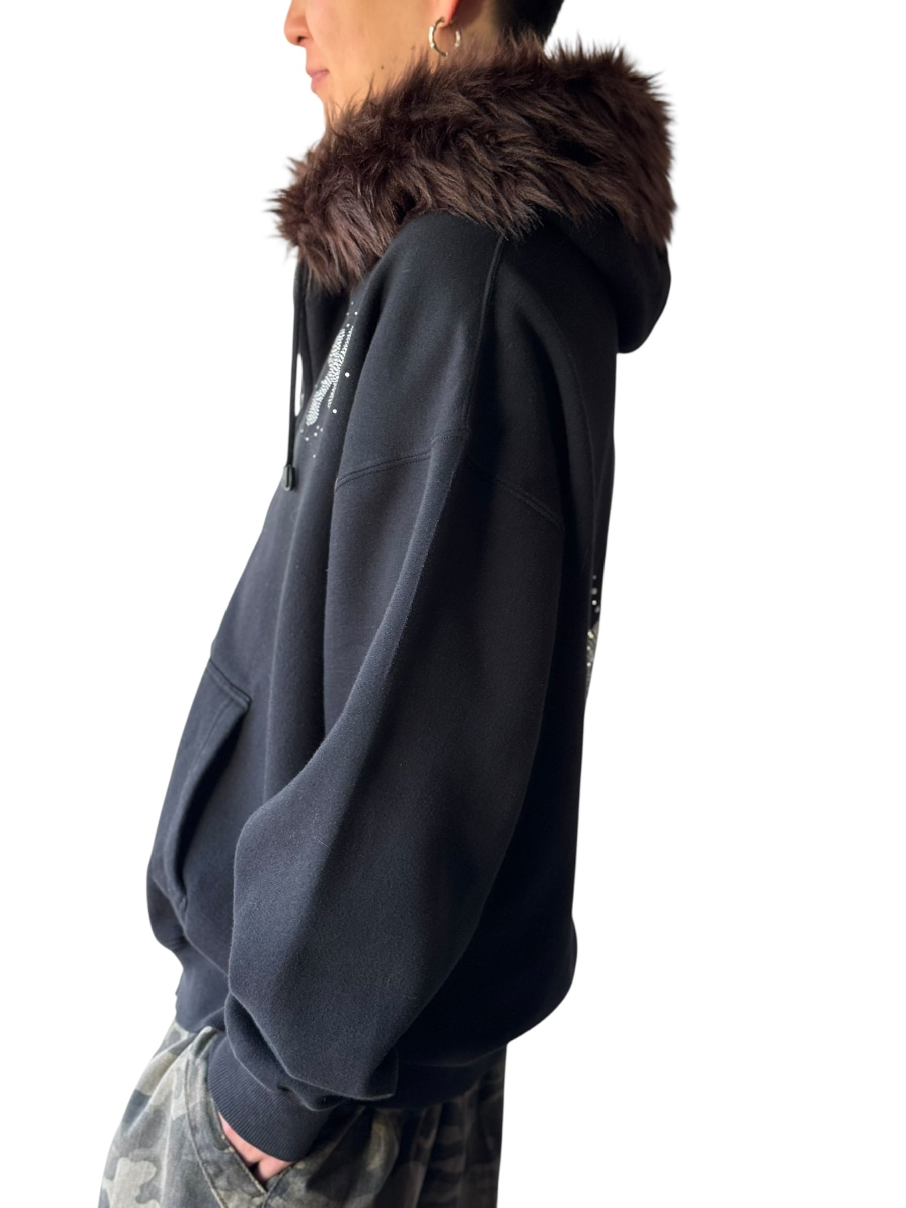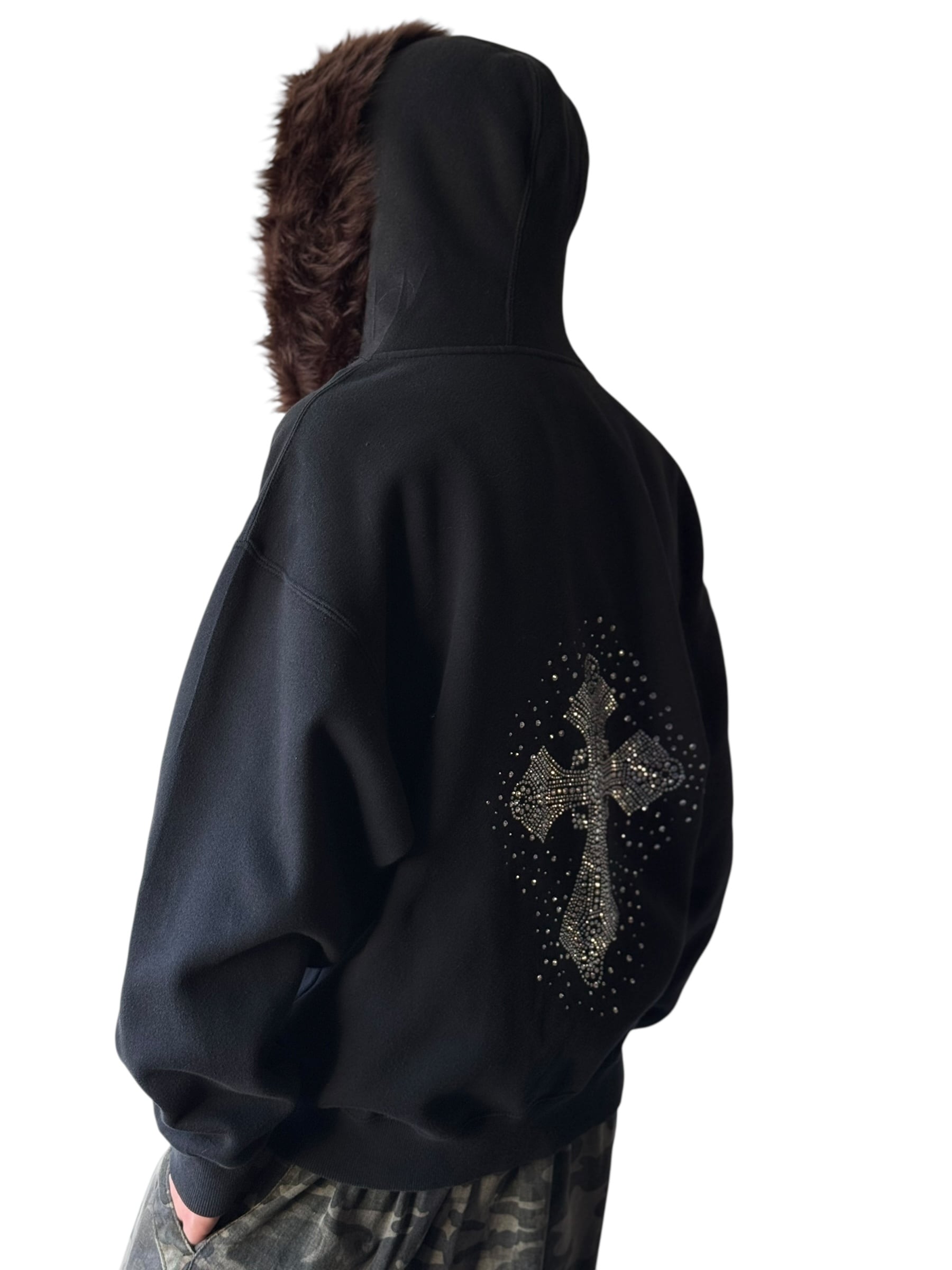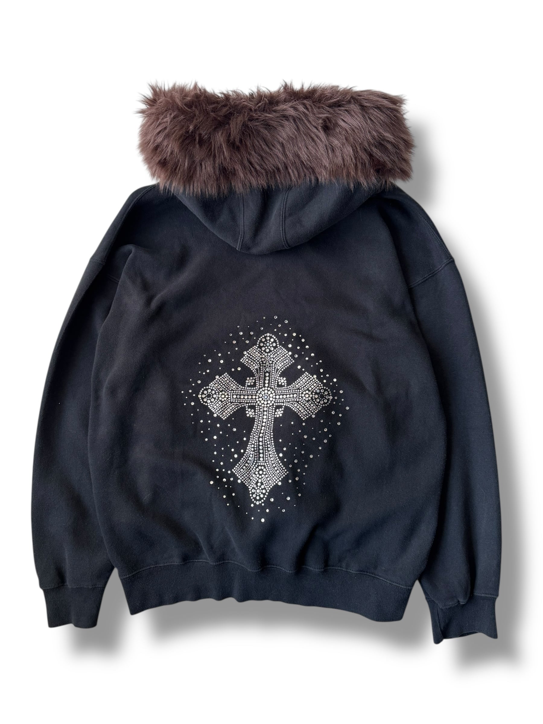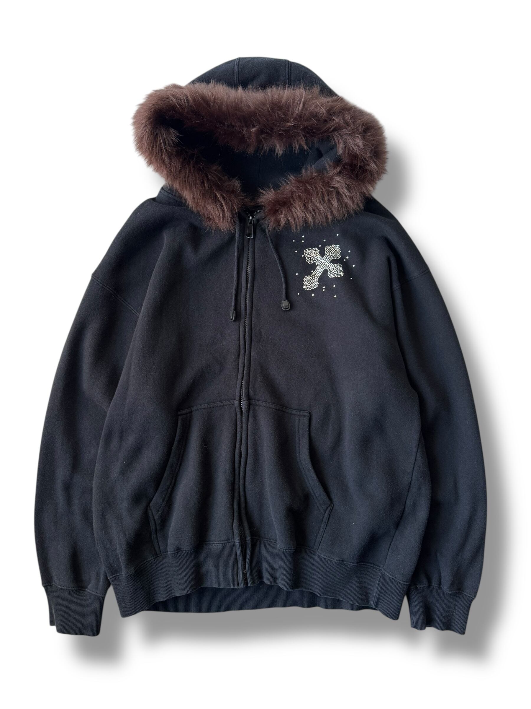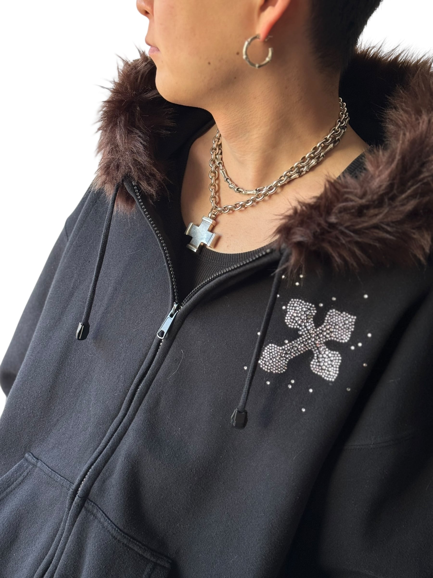 ♾design used♾ Cross motif rhinestone design fur zip hoodie size XL