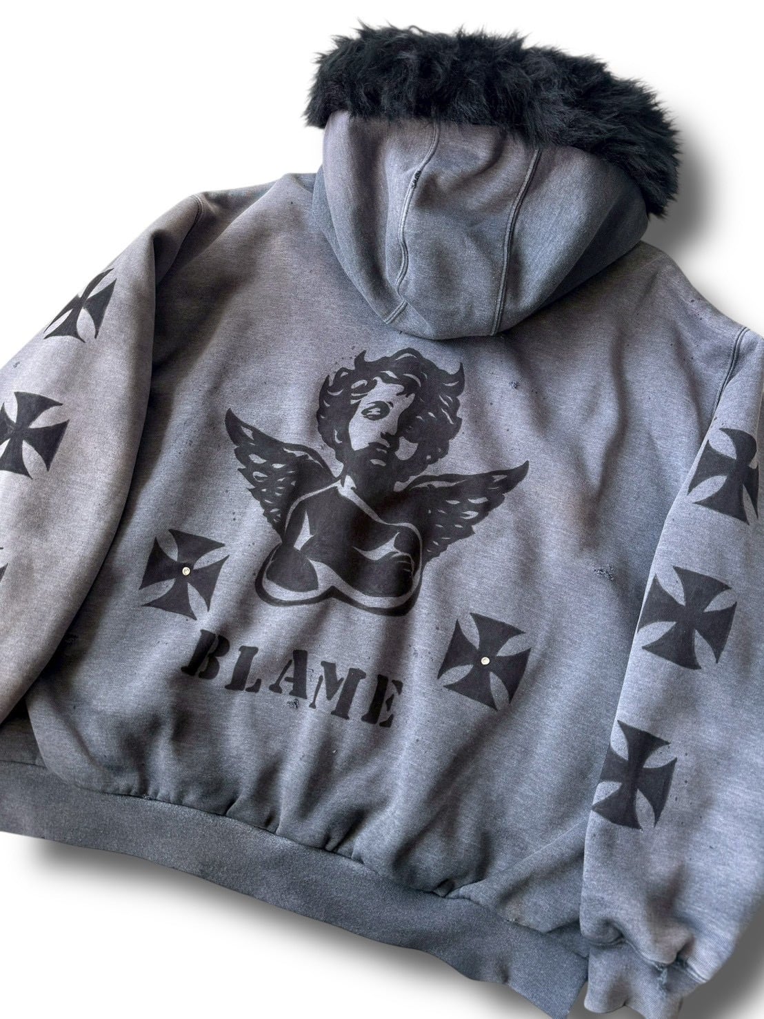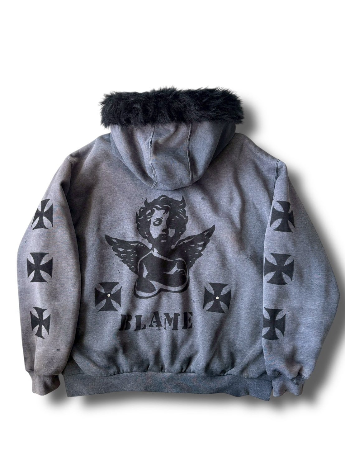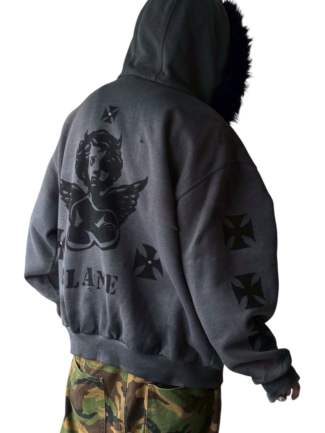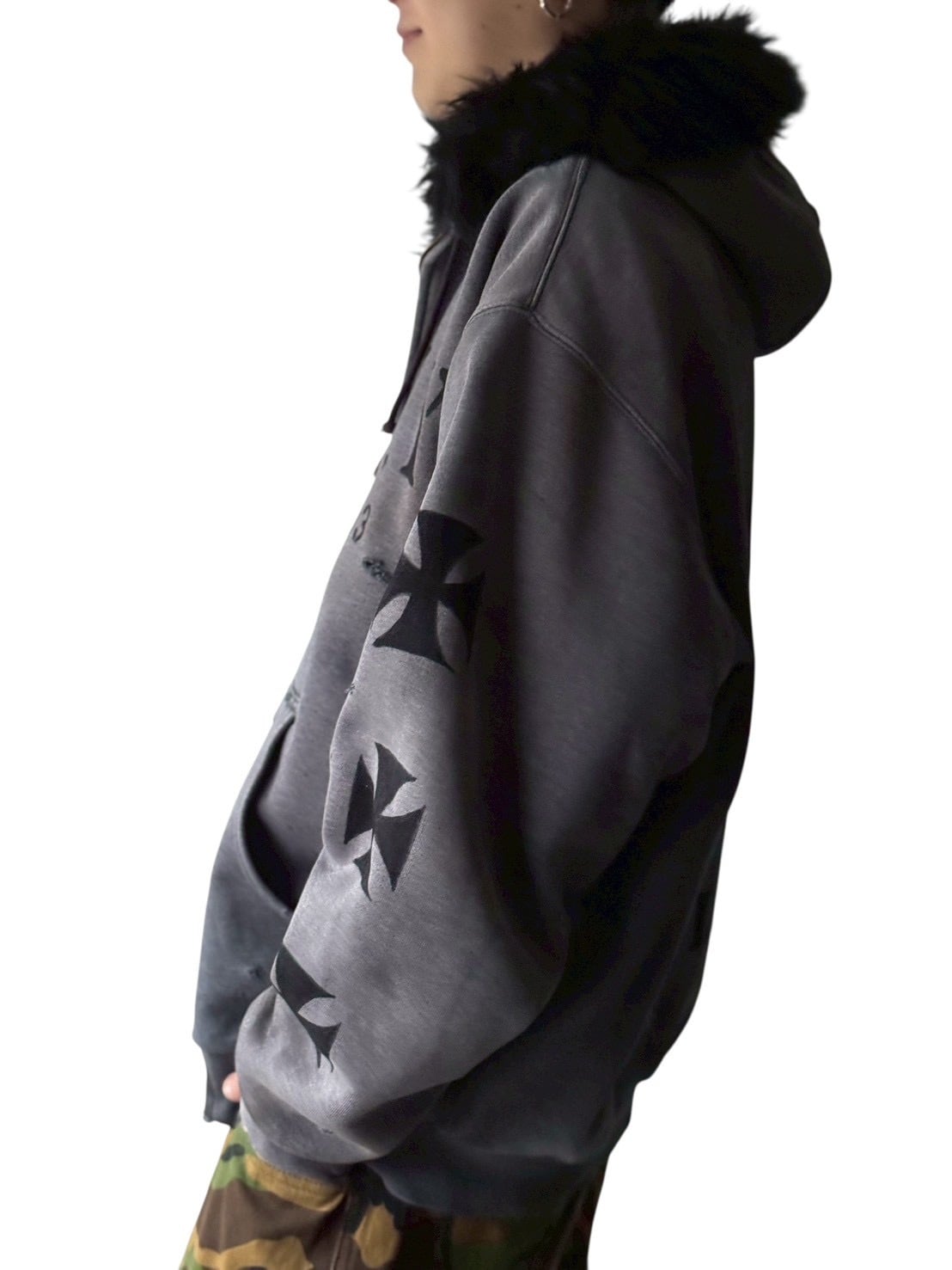 グッドフェードの色味とさり気ないダメージ加工がめちゃめちゃクールな個体に無二なハンドペイントを施したデザインジップアップフーディー‼️