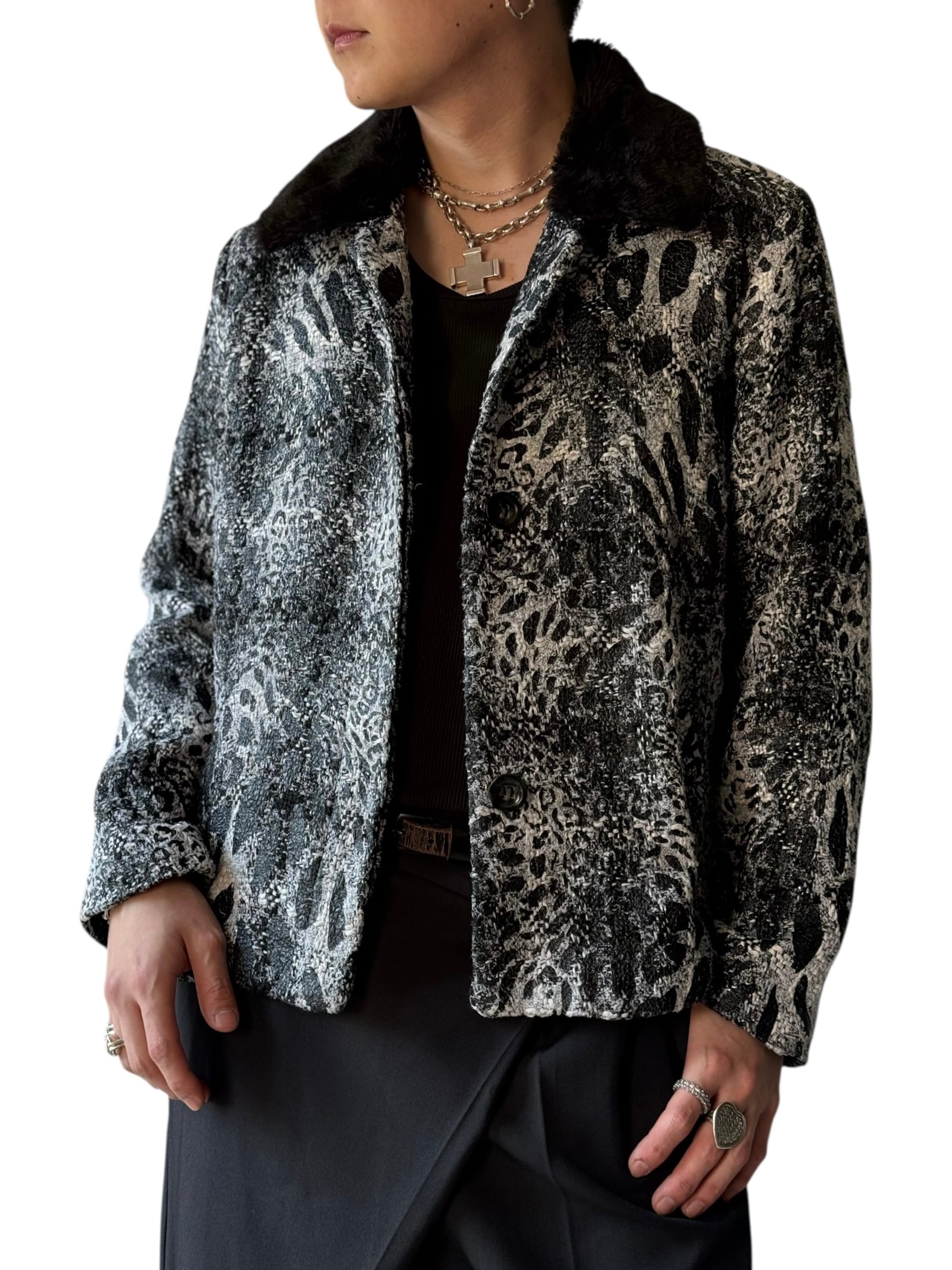 ボディ全体のさりげないアニマル柄模様に襟ファーの切り替えが雰囲気たっぷり☺️❤️