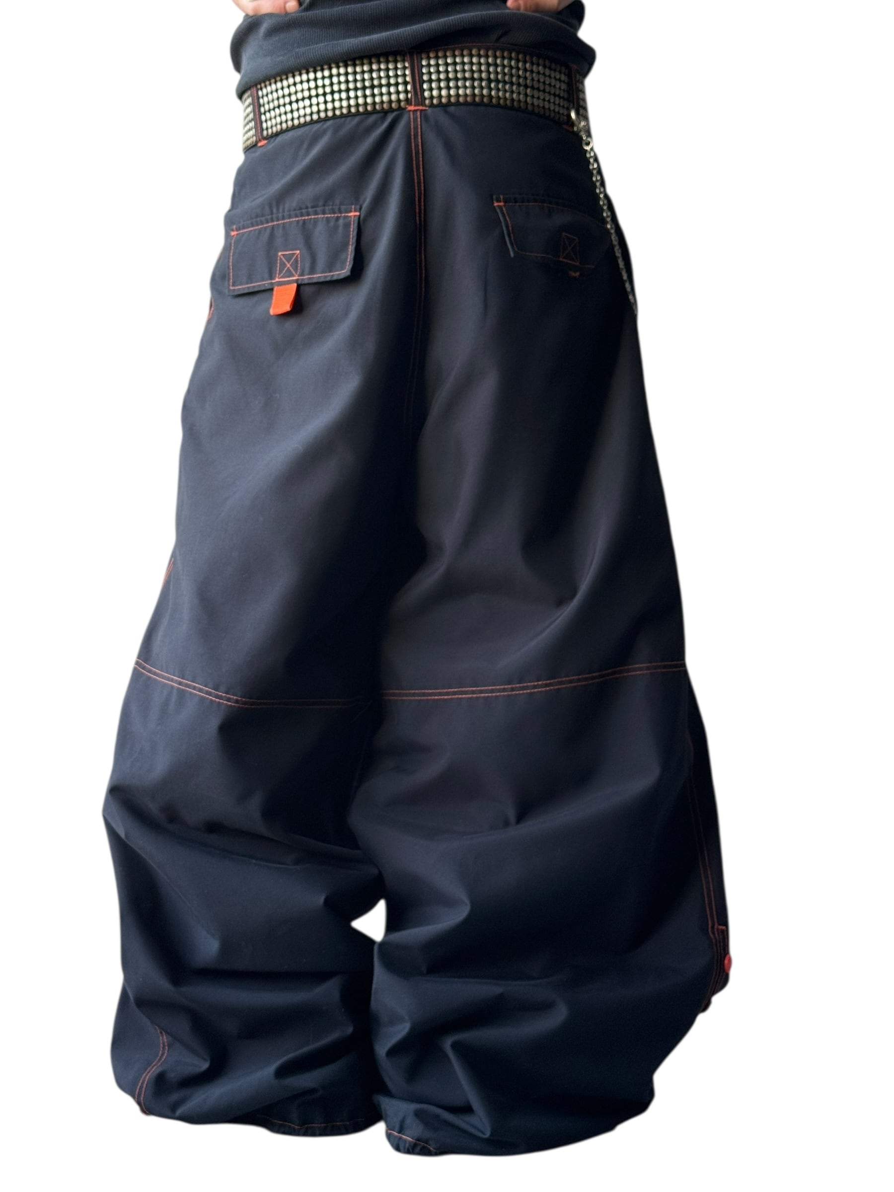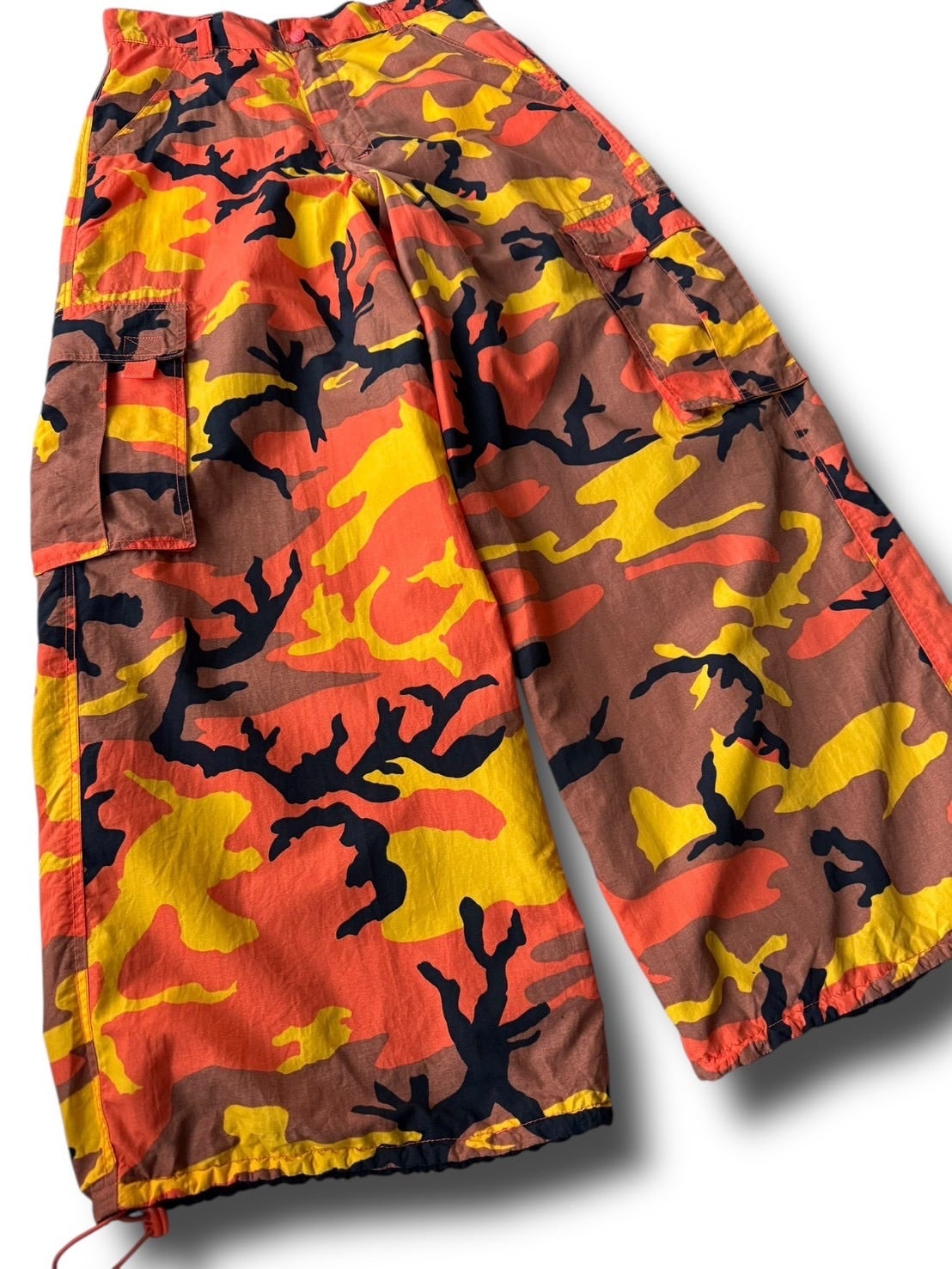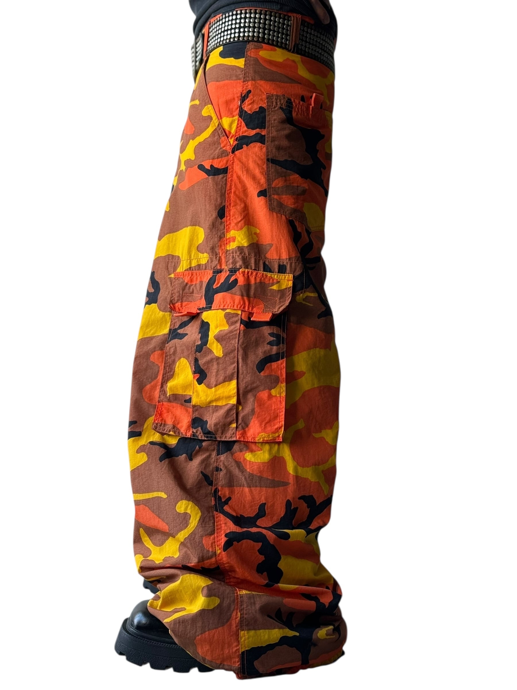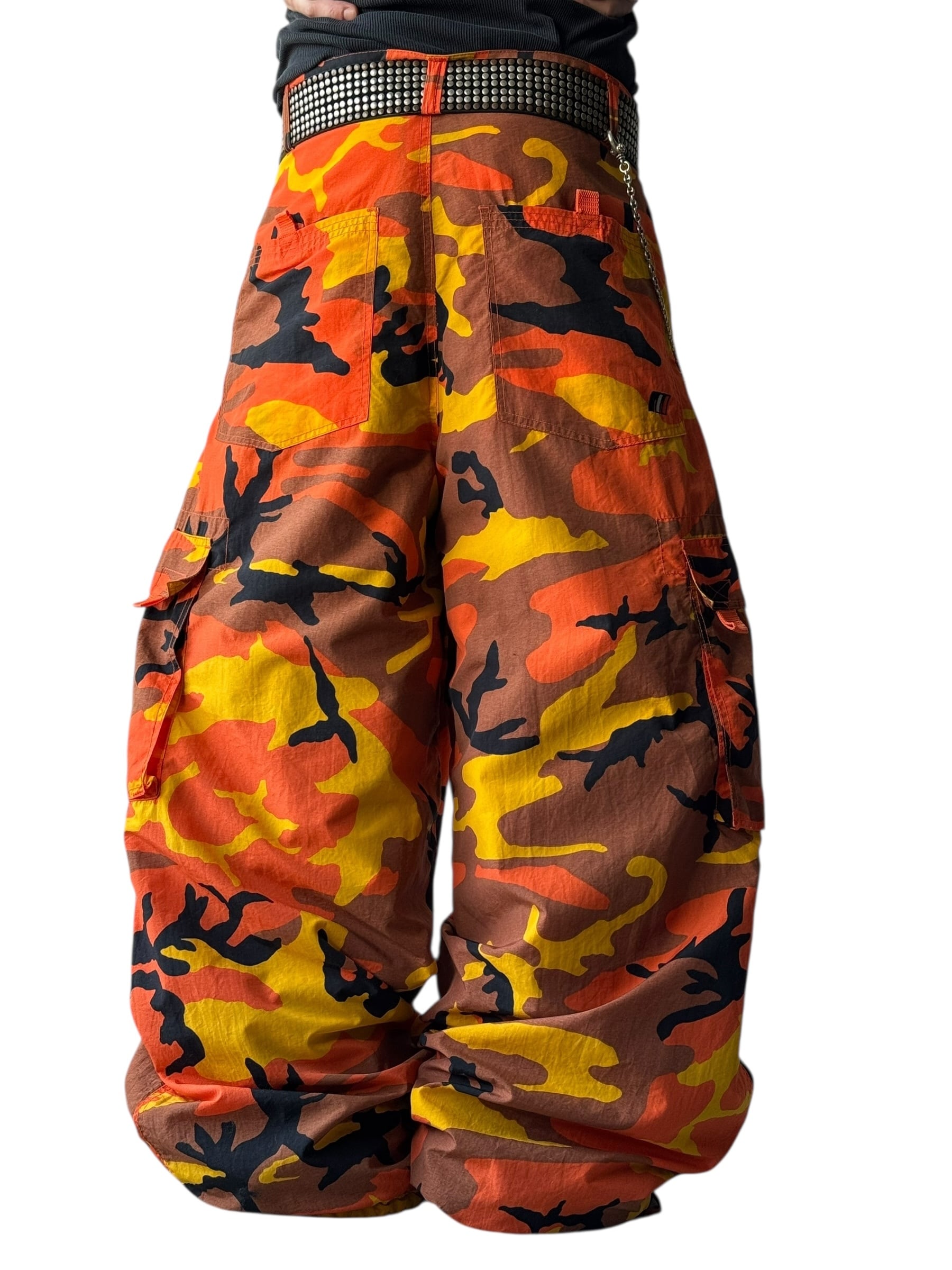 Baggy silhouette reversible orange woodland camo cargo rave pants