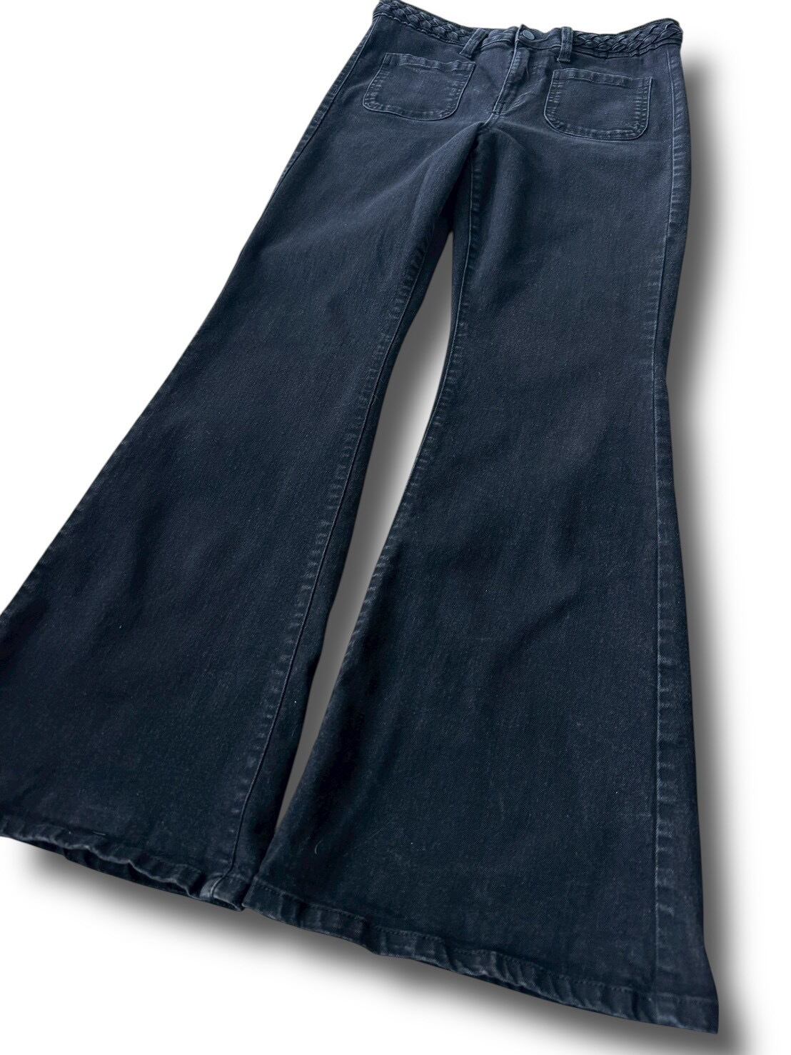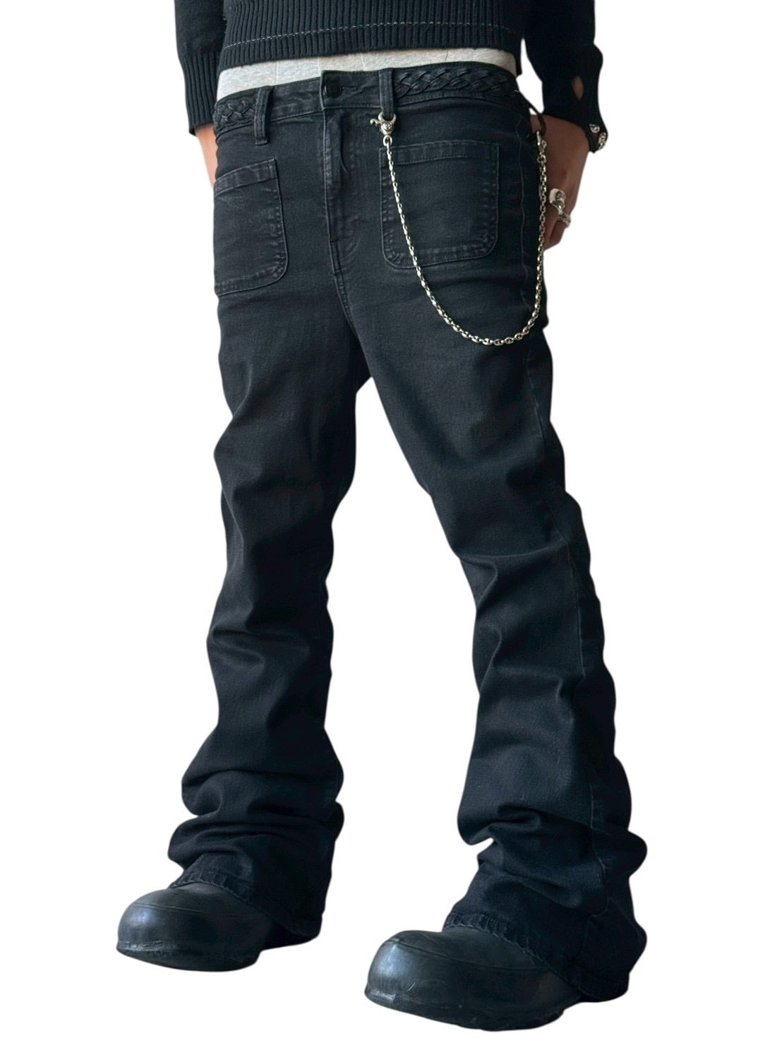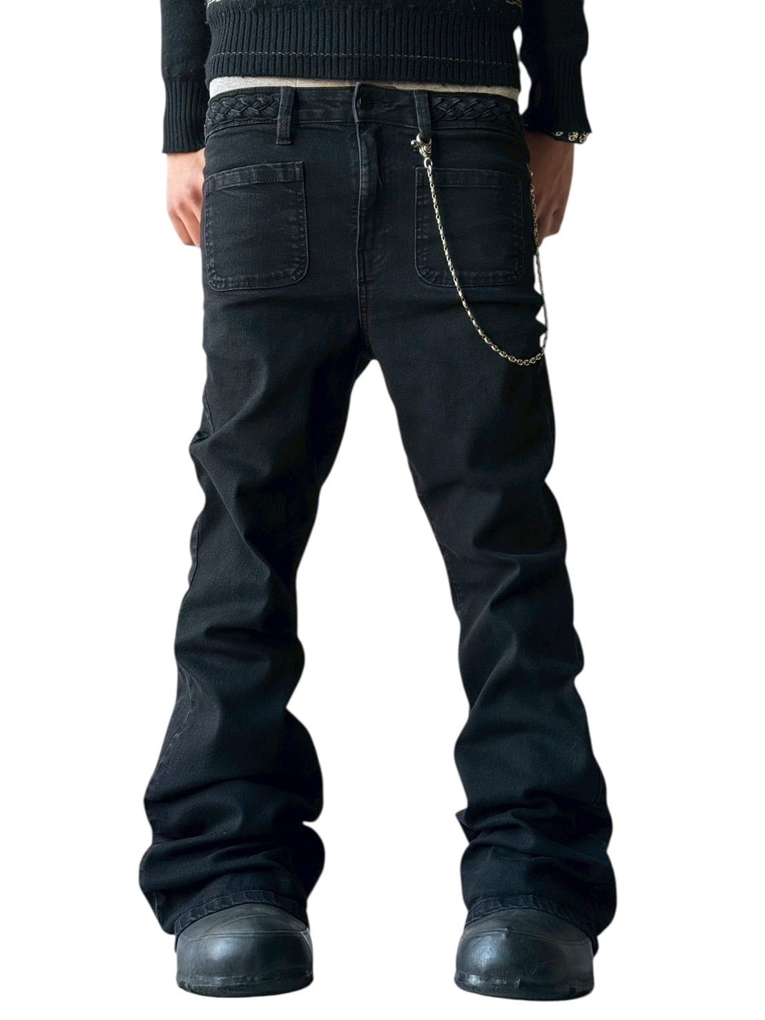 Flared silhouette denim pants with a braided waist design
