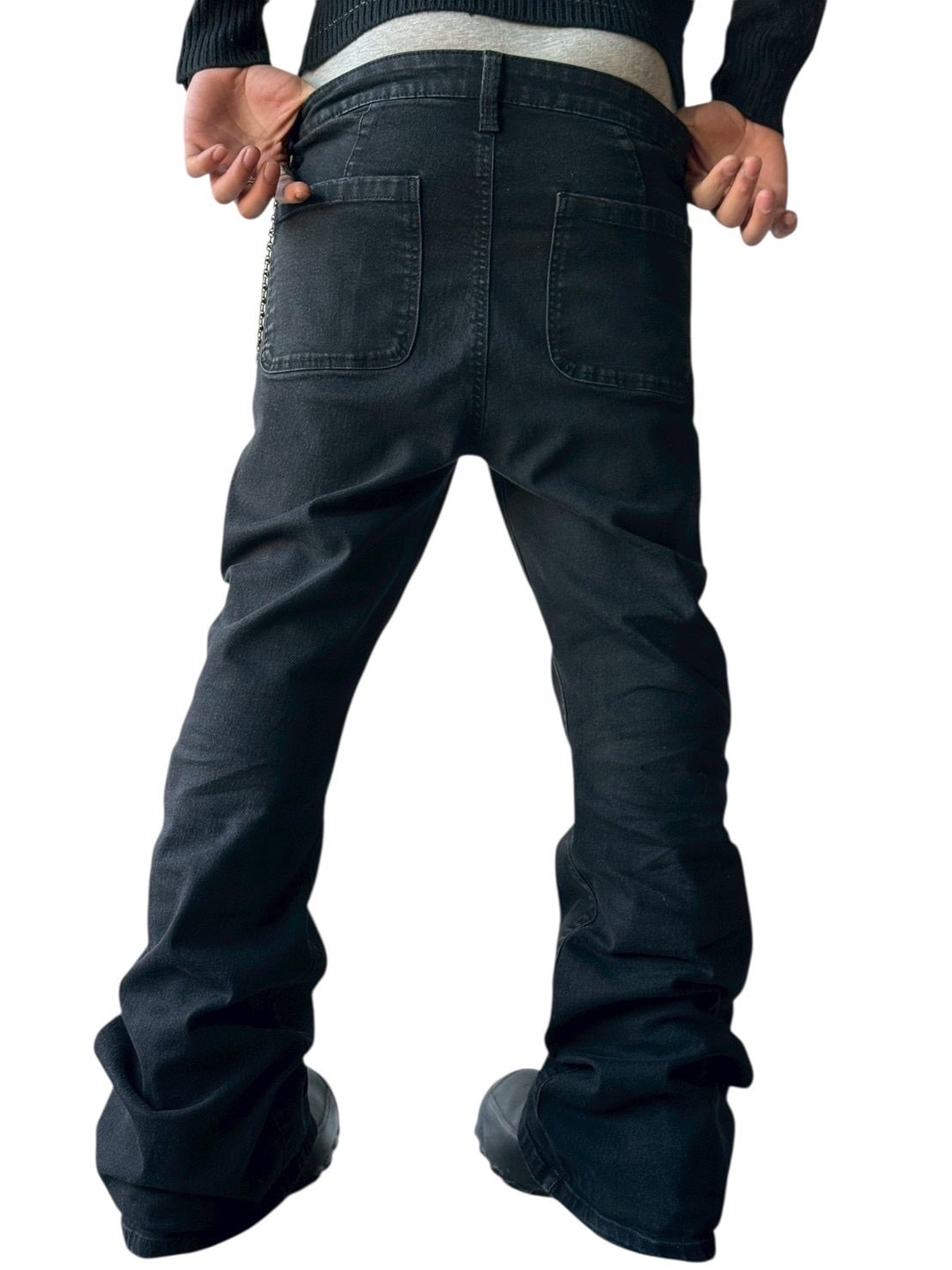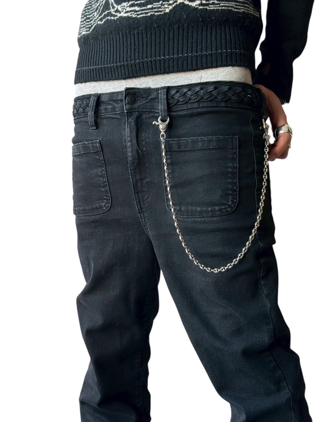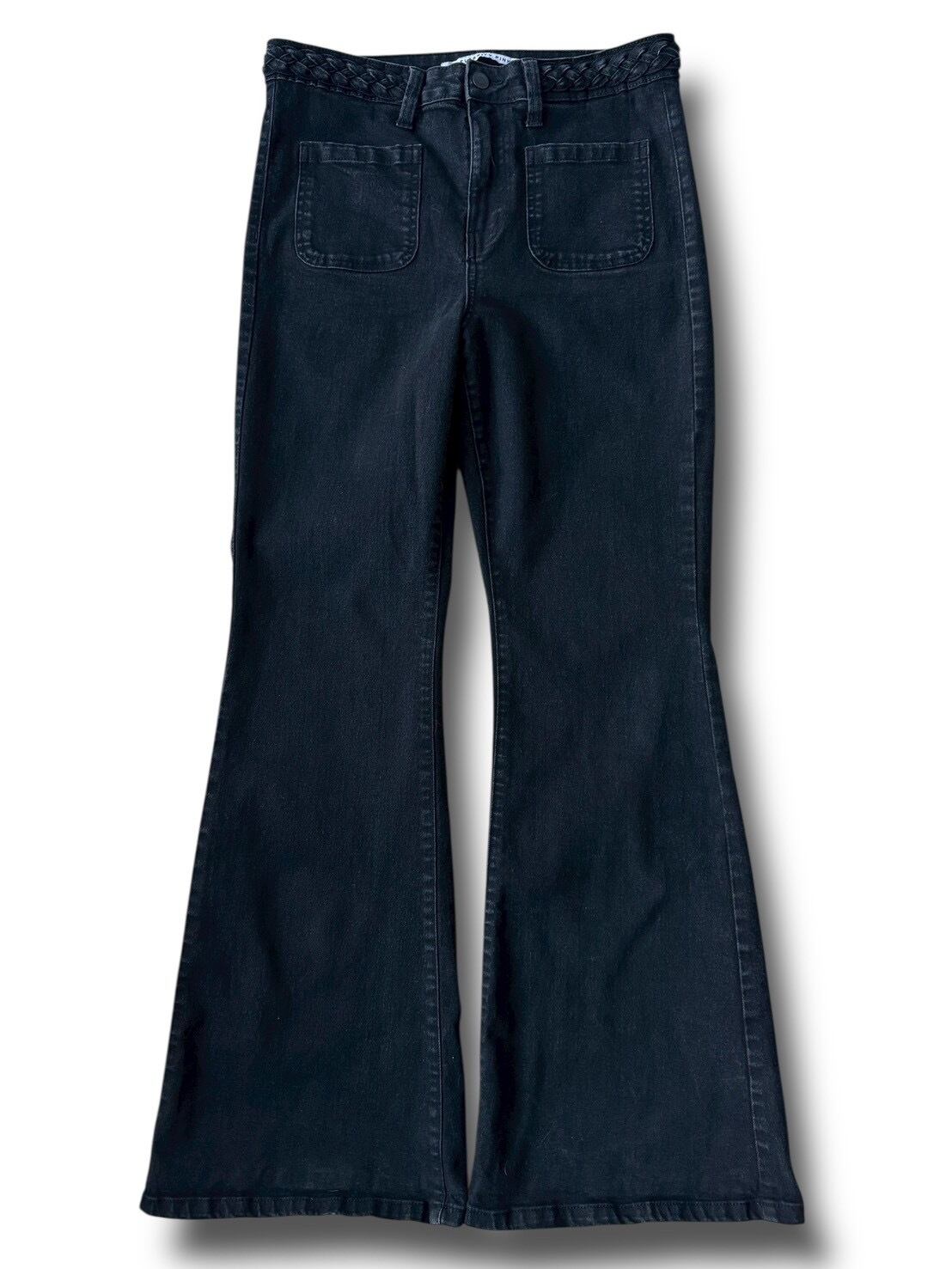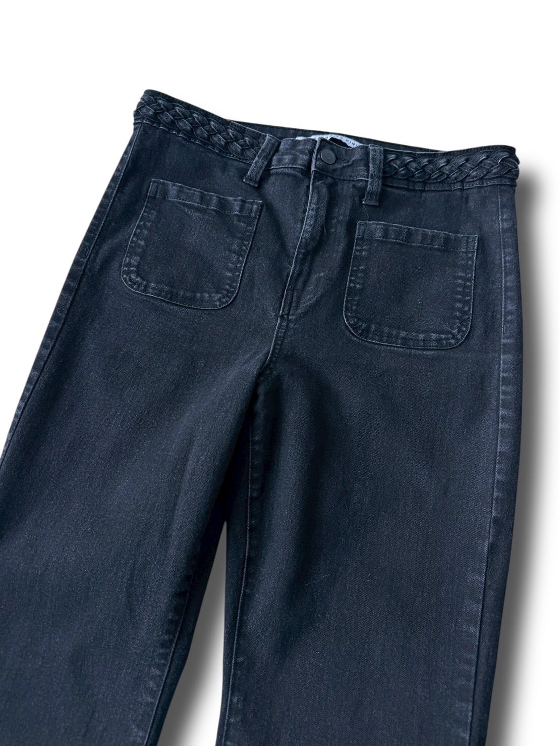 Flared silhouette denim pants with a braided waist design