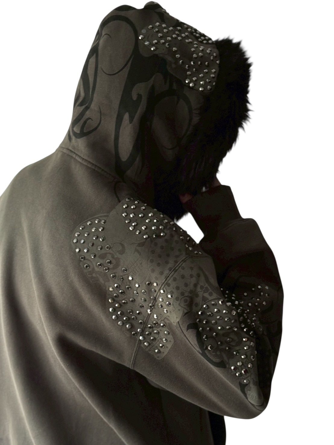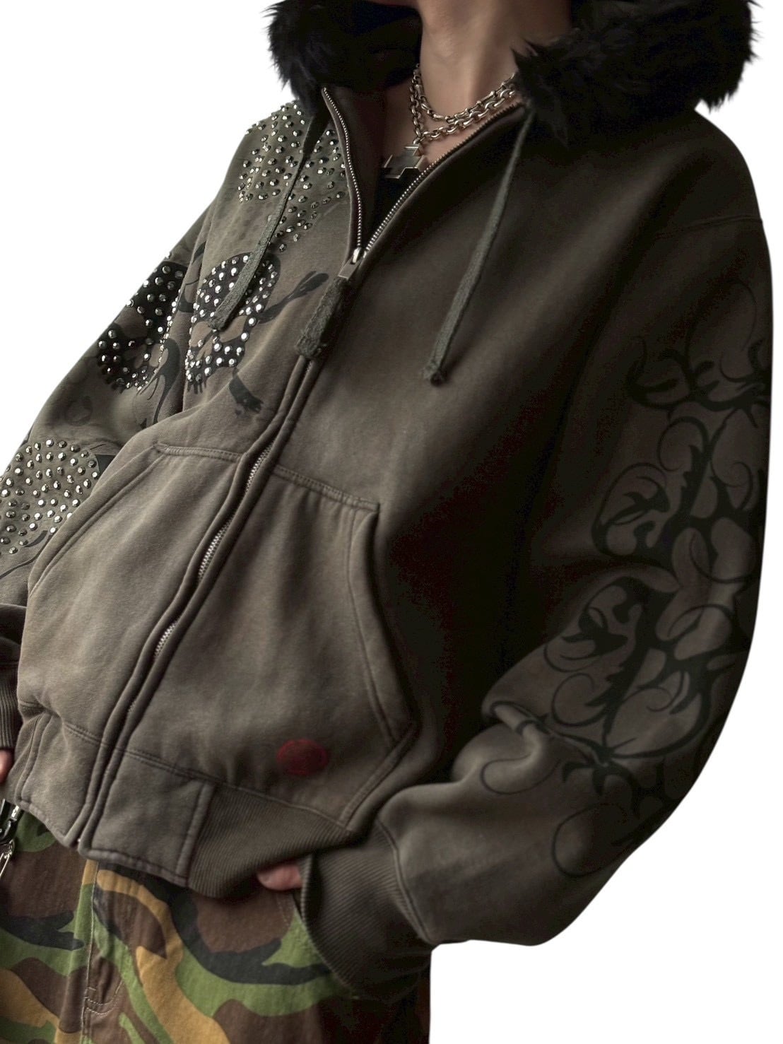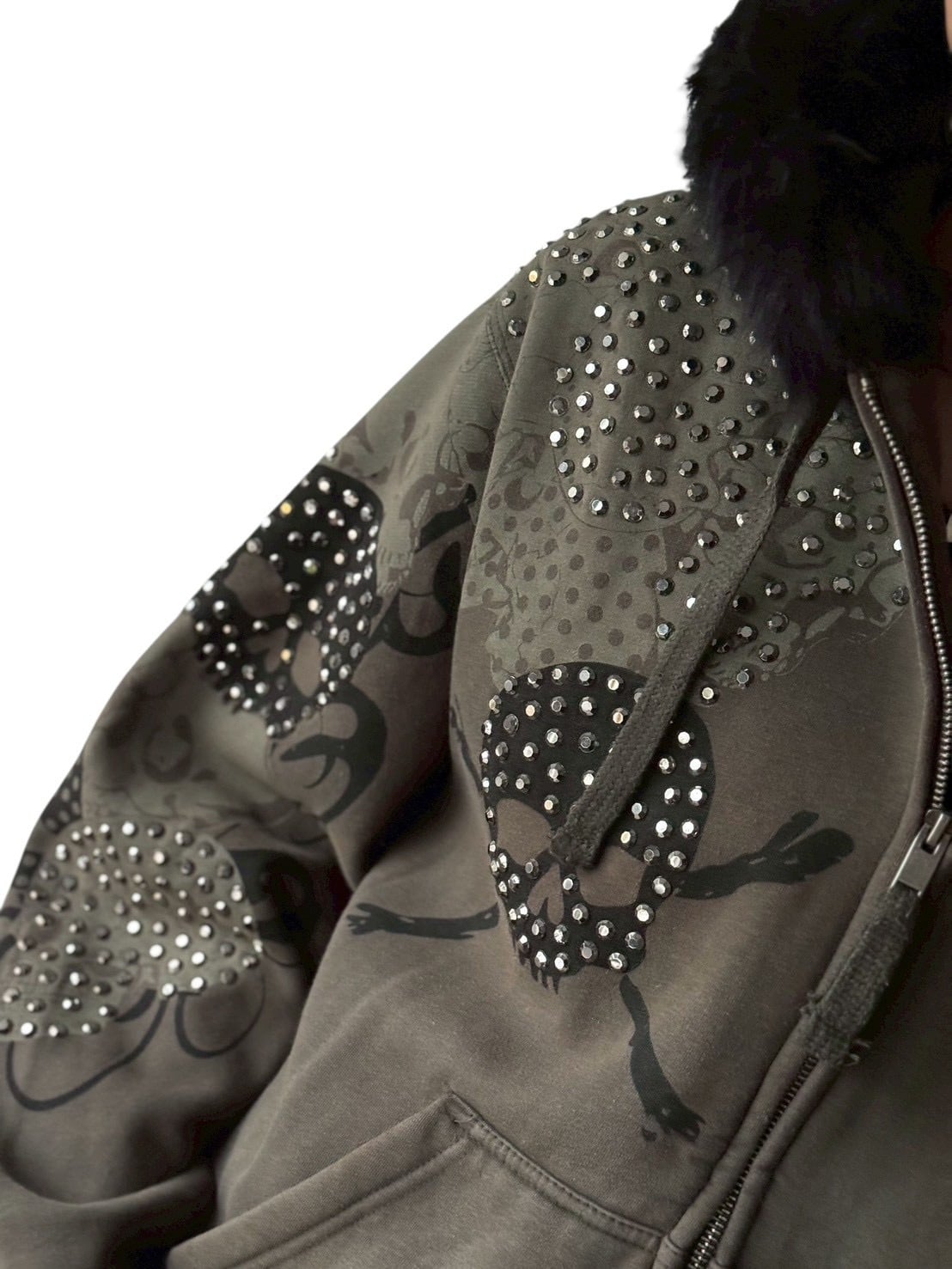 skull motif rhinestone design zip up hoodie