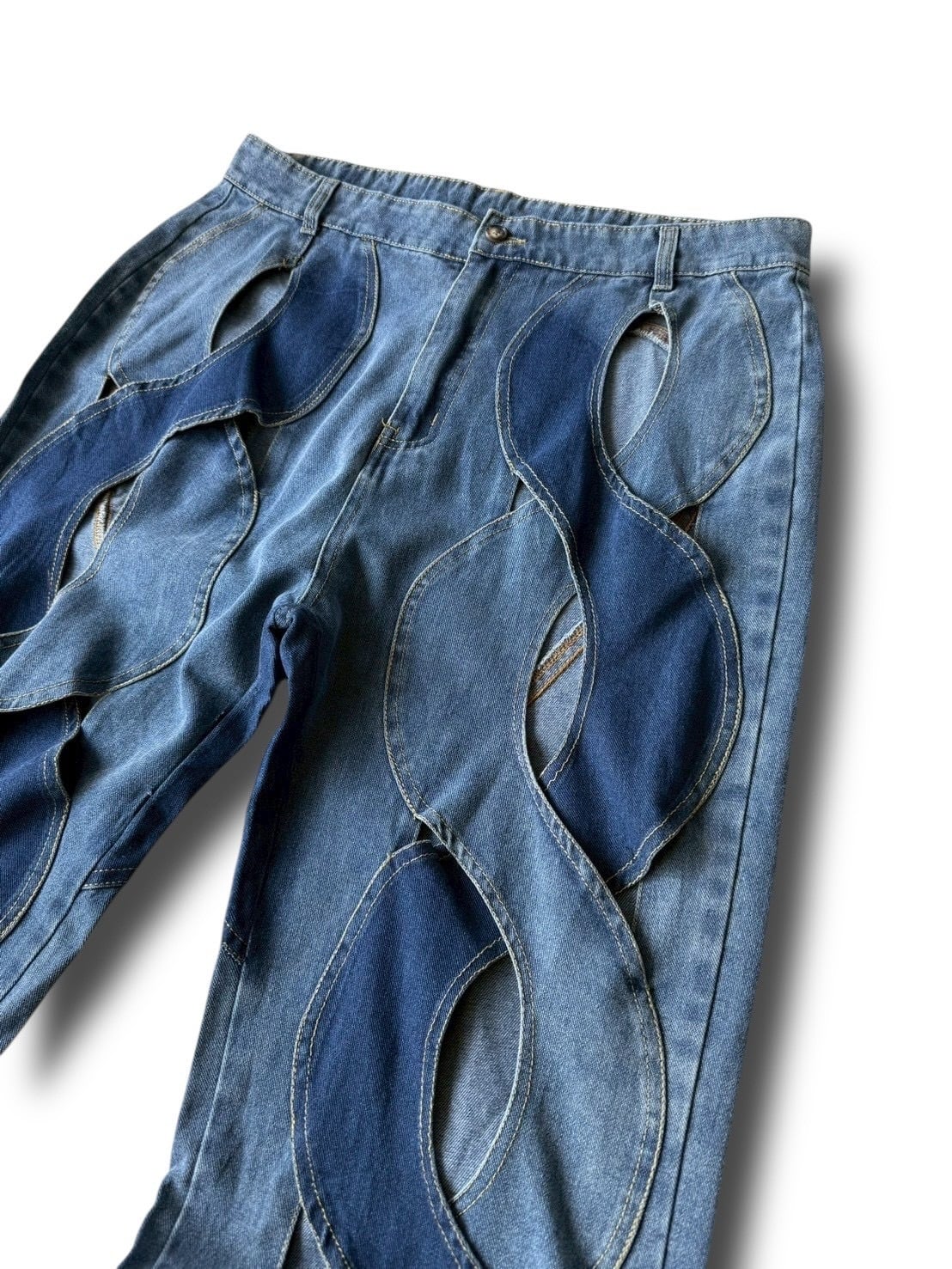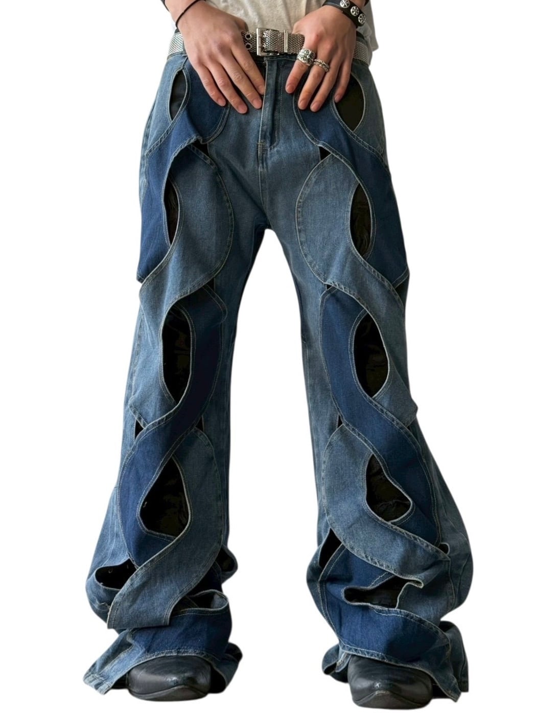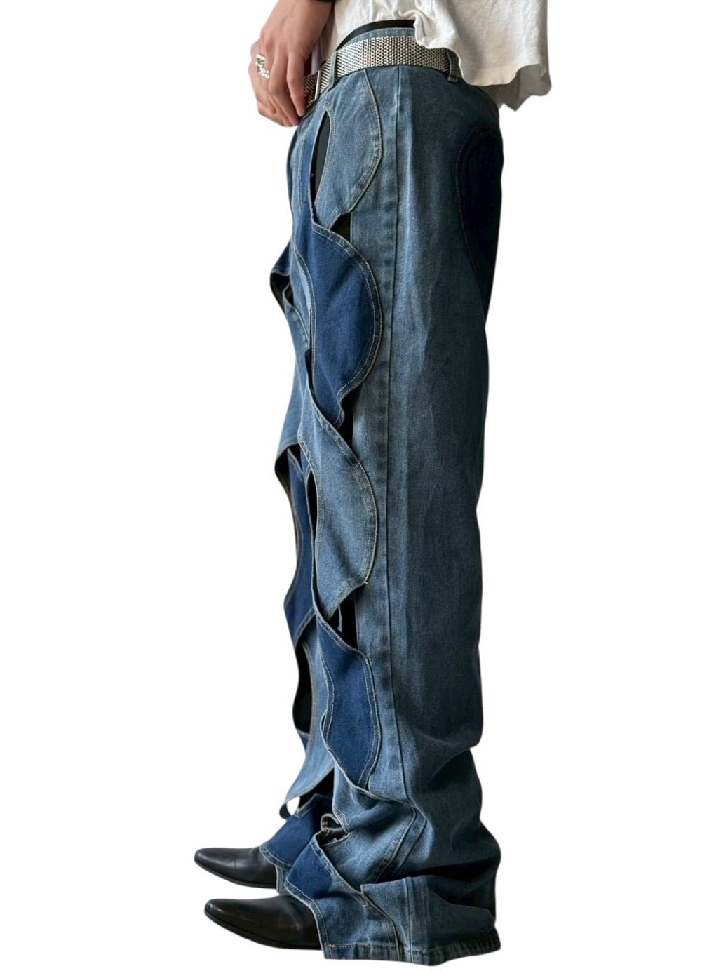 wave cut out design flare denim pants