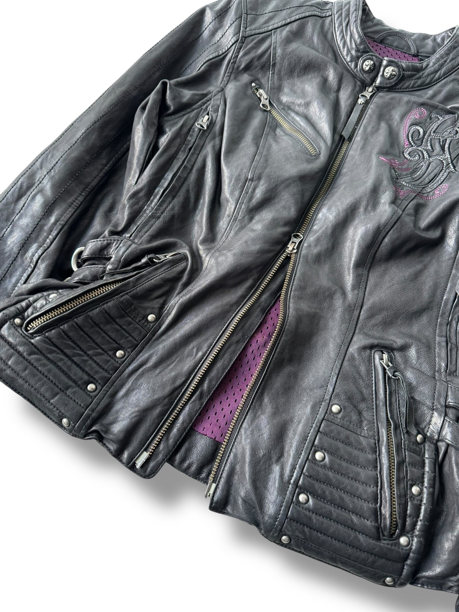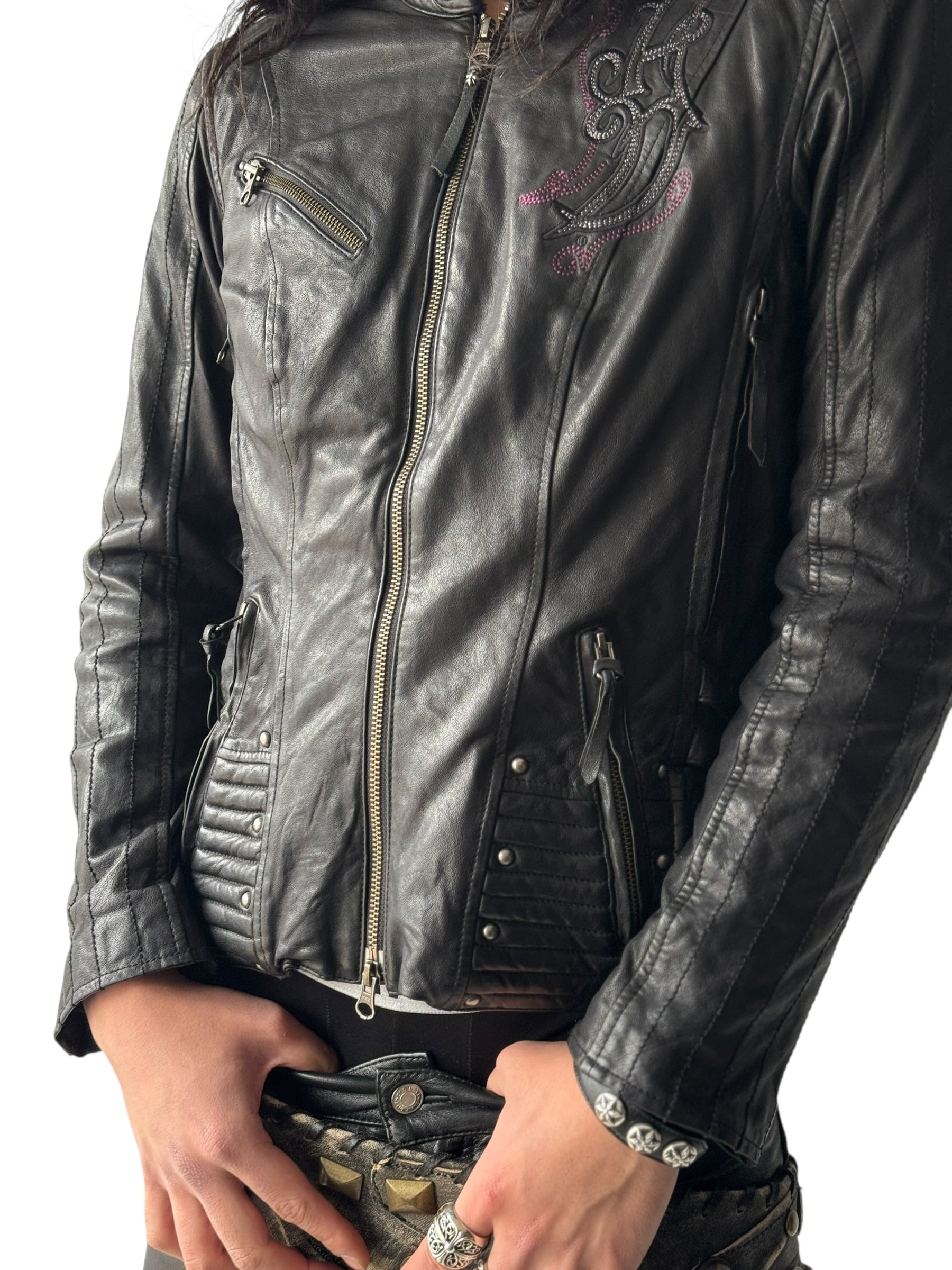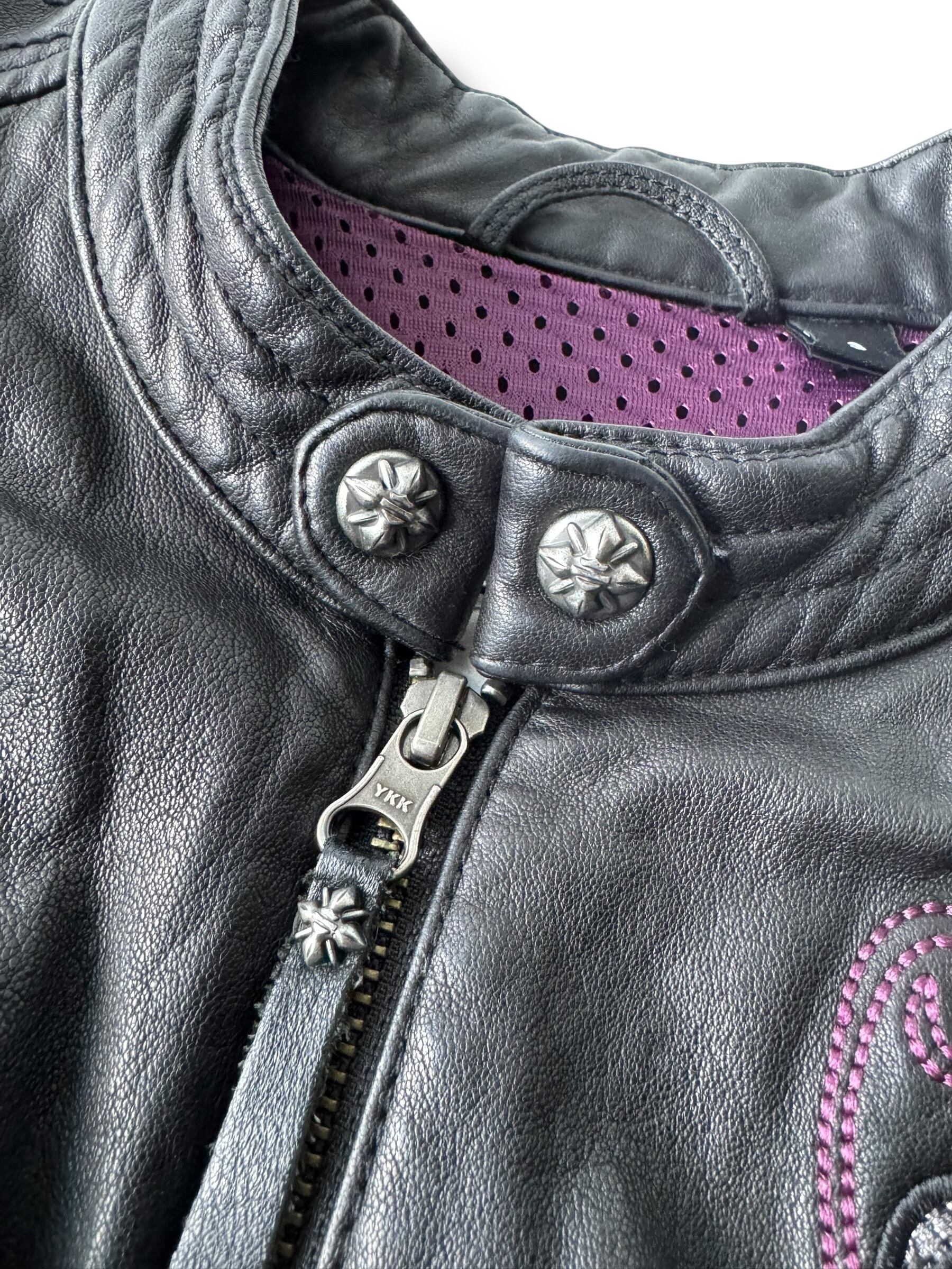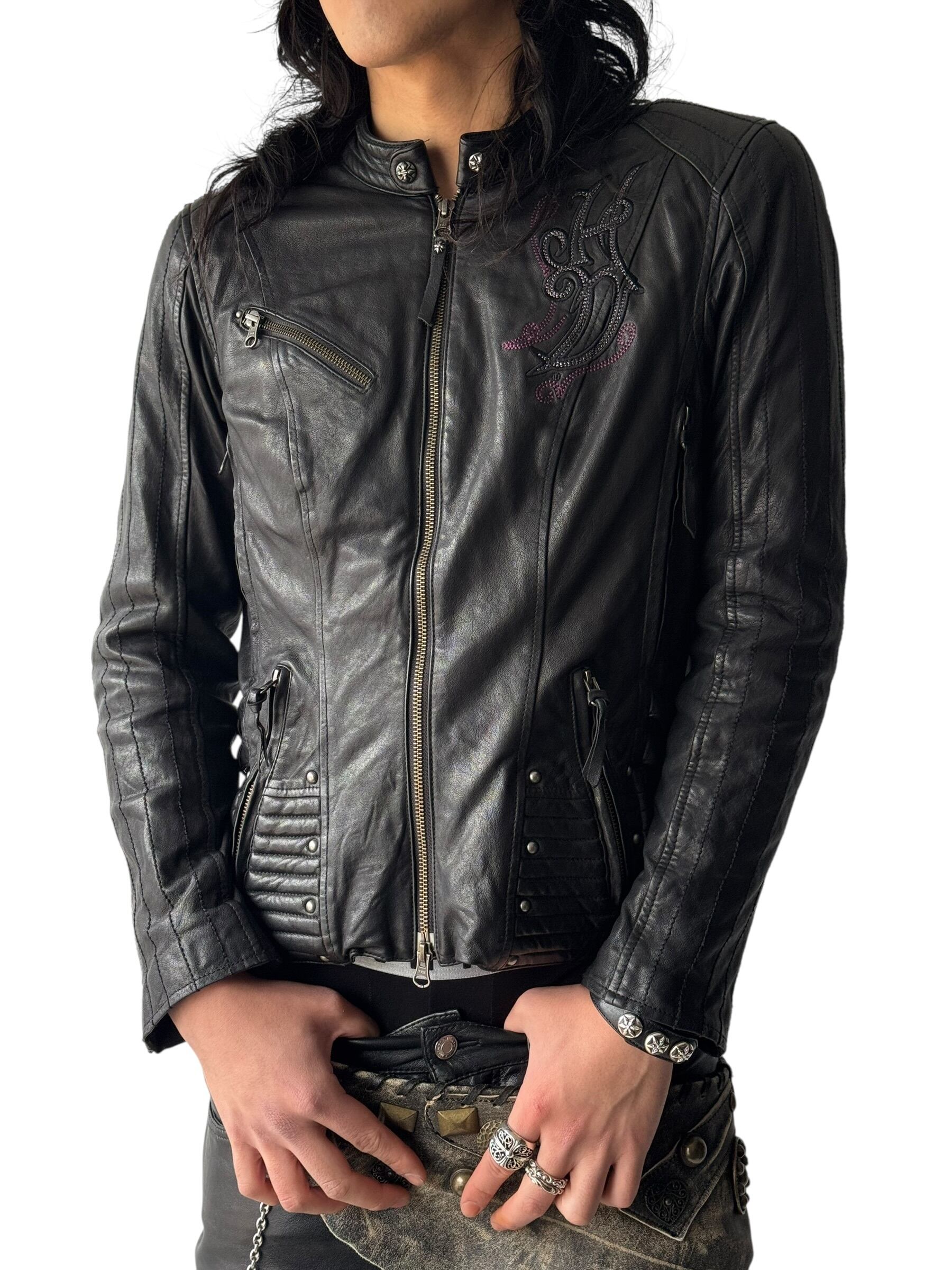 非常に柔らかく着やすいラムレザーが採用されていて、襟元やジップヘッドストラップにシルバーコンチョが使われ、背中はなんとスタッズクロス刺繍デザインとかなりの豪華なデザイン‼️