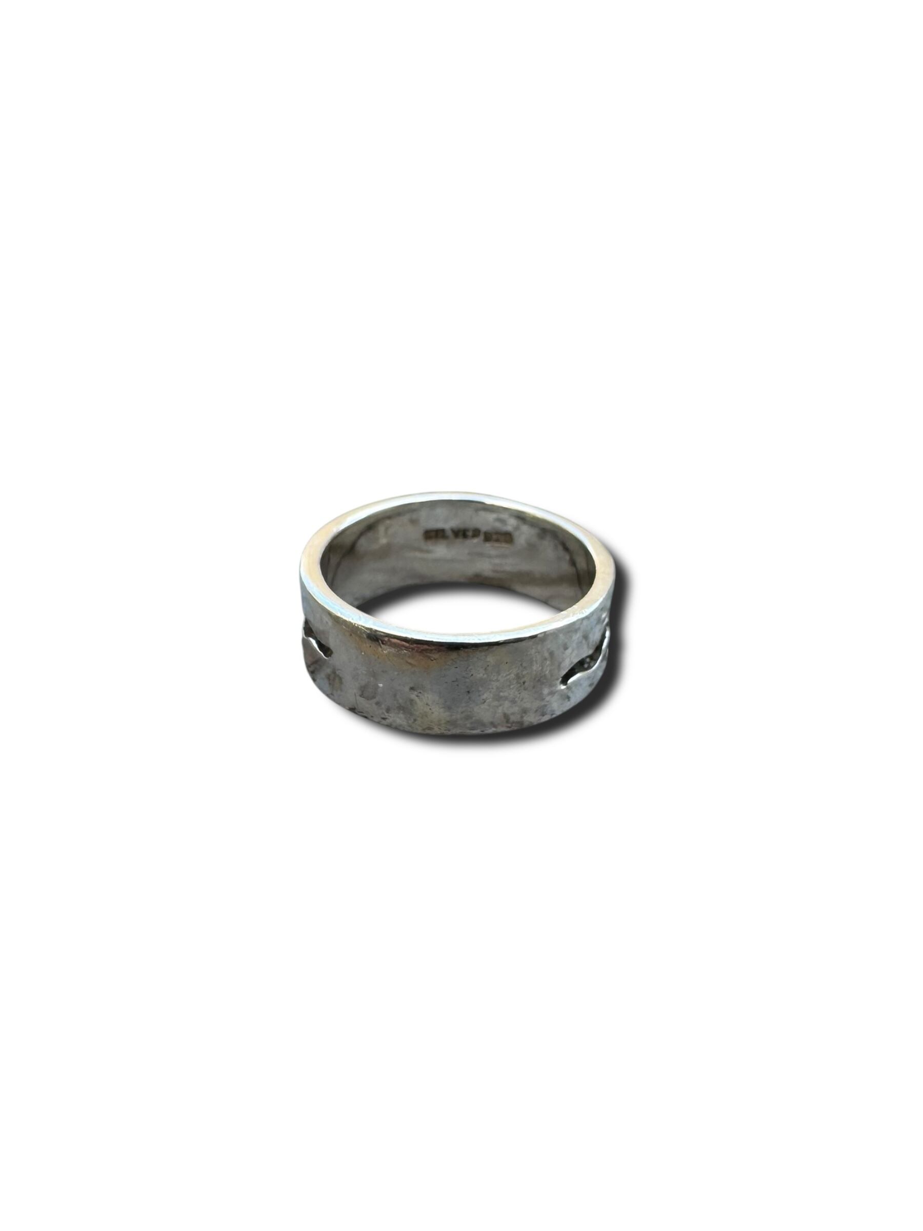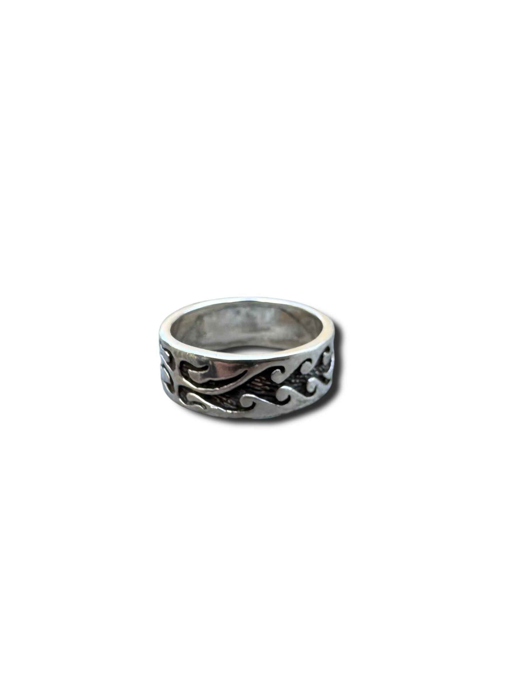 ファイヤーパターンの様な模様が彫り込まれたクールな雰囲気のシルバーリング。