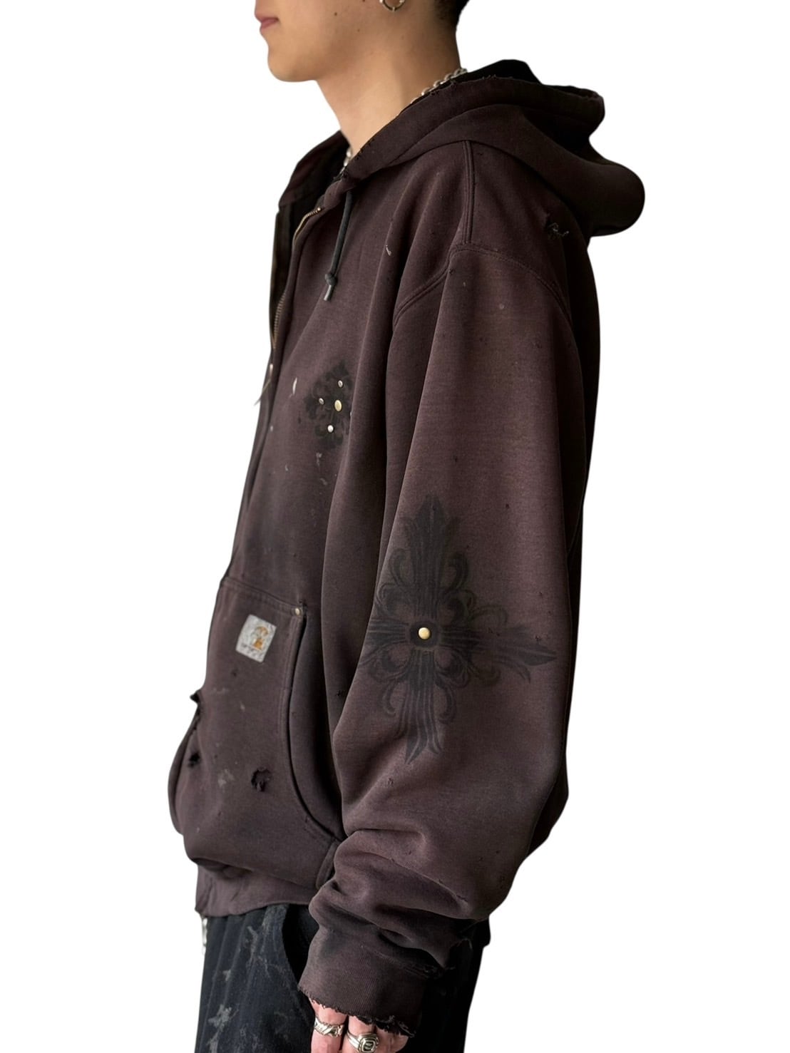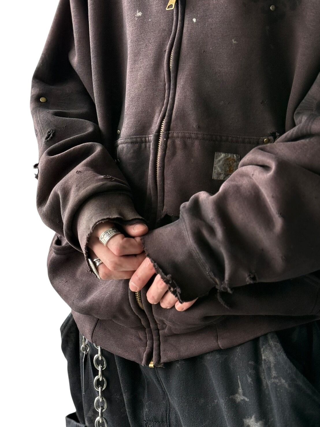 グッドフェードの色味とさり気ないダメージ加工がめちゃめちゃクールな個体に無二なハンドペイントを施したデザインジップアップフーディー‼️