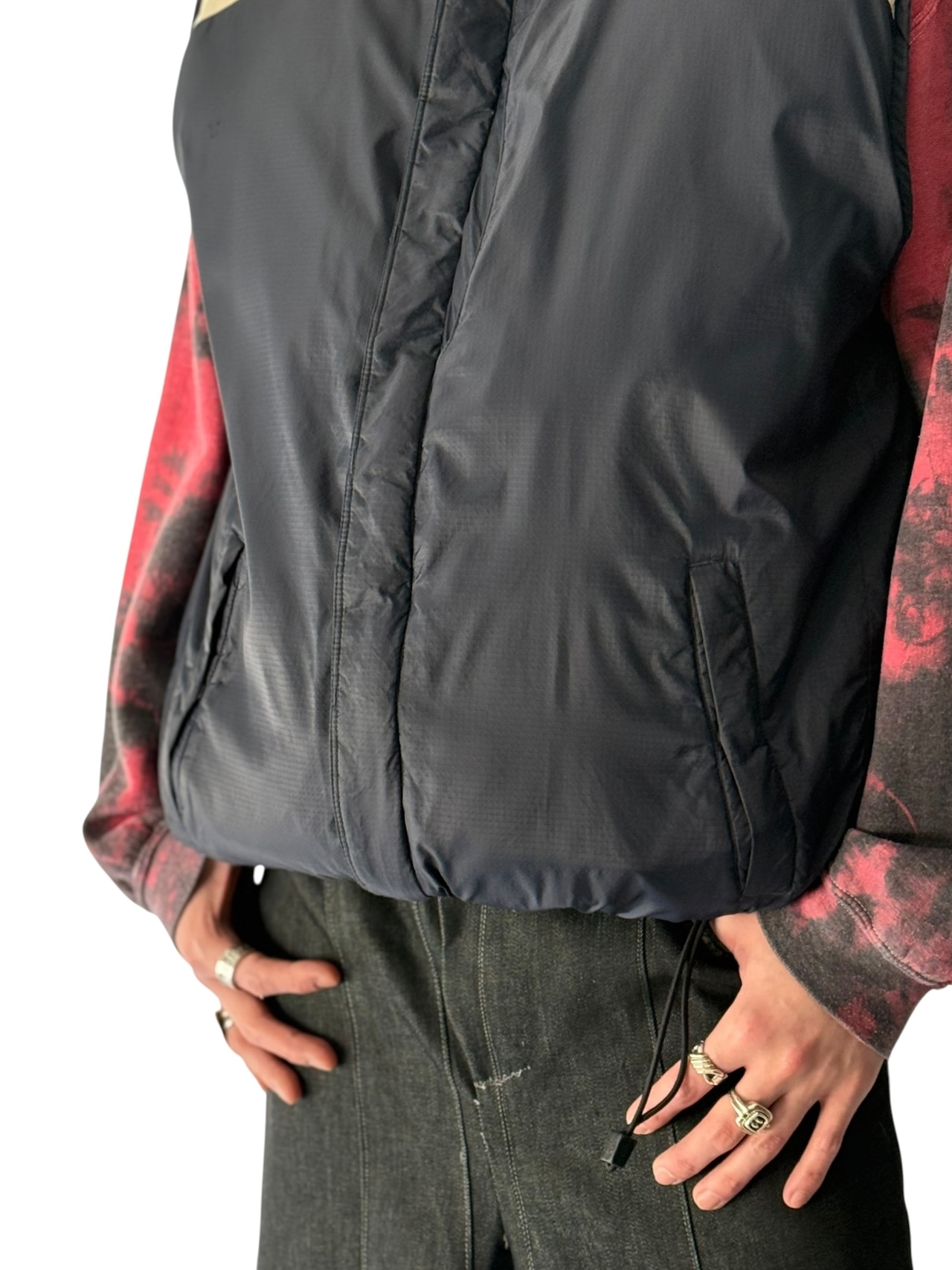 両裾ドローコードで絞れるため、シルエットも最高。。凝ったデザインのダウンベストはなかなか無いです✨