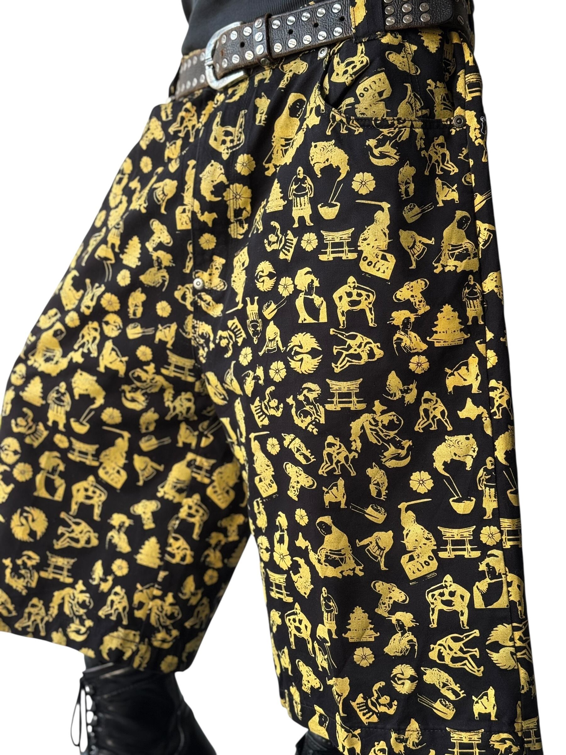 存在感抜群のブラックボディに、イエローカラーの和モチーフ風の総柄プリントを全面に落とし込んだインパクトショーツ‼️