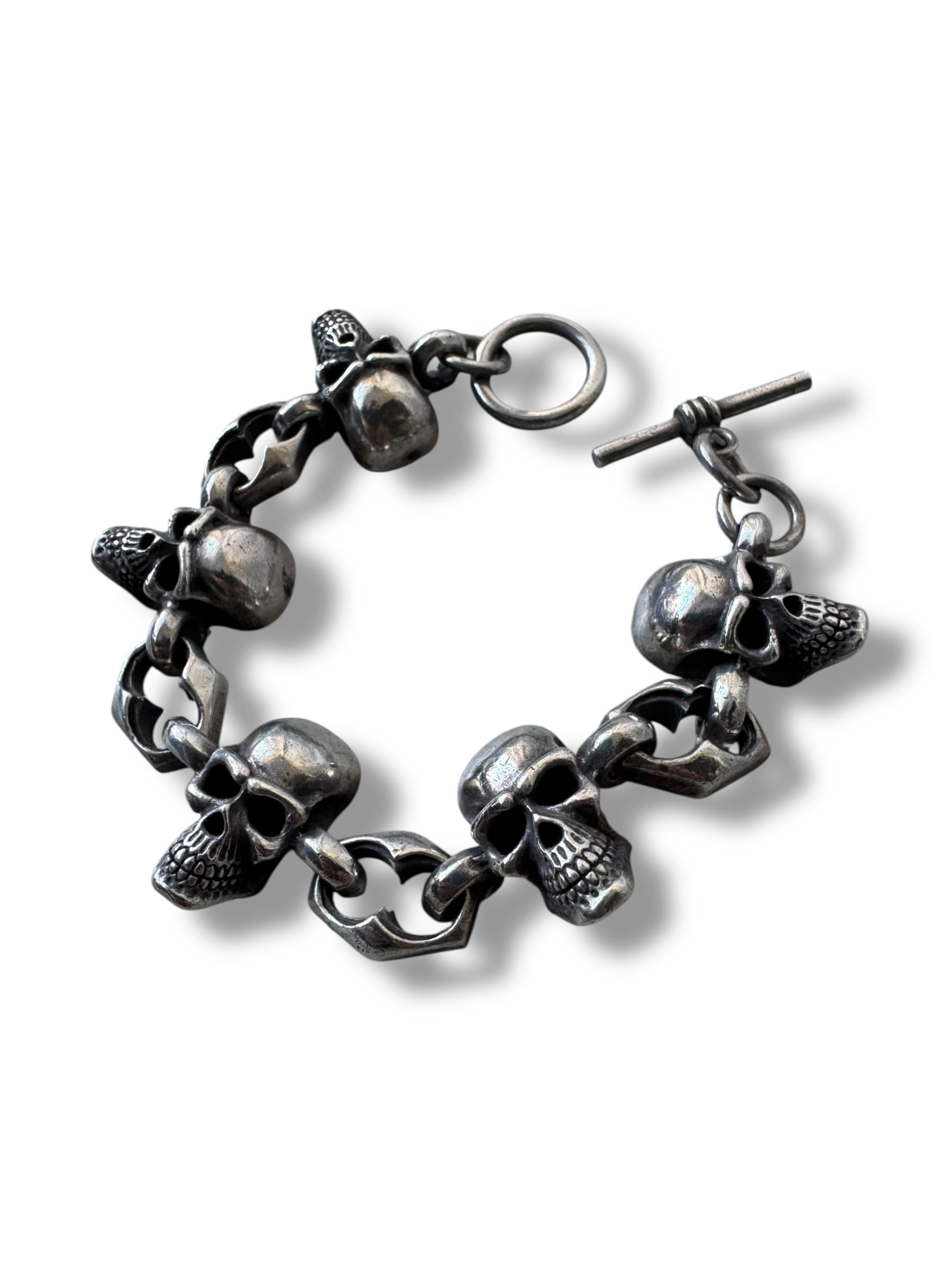 無骨な髑髏が連なるワイドリンクデザインが圧倒的存在感を放つシルバーブレスレット‼️‼️