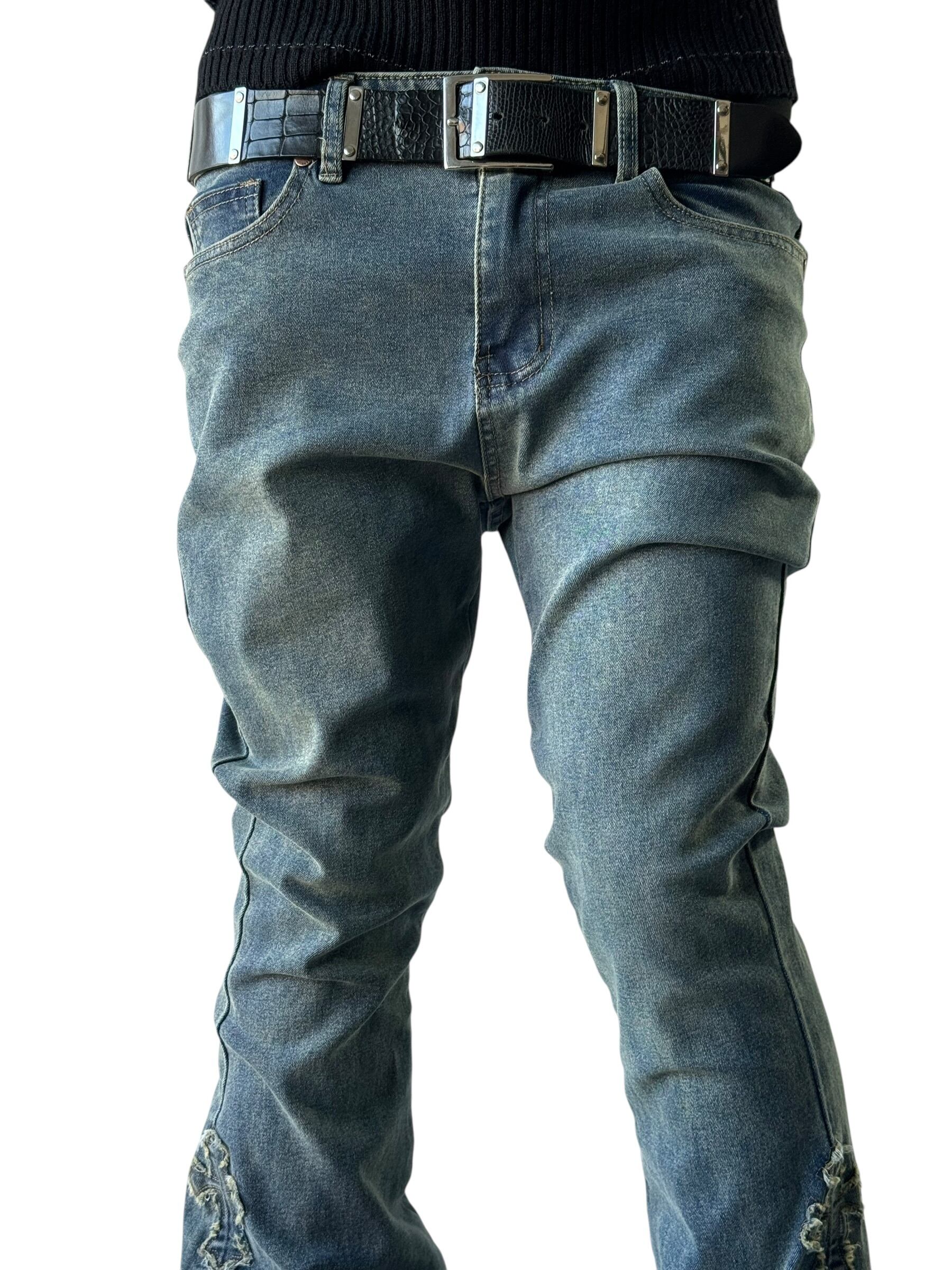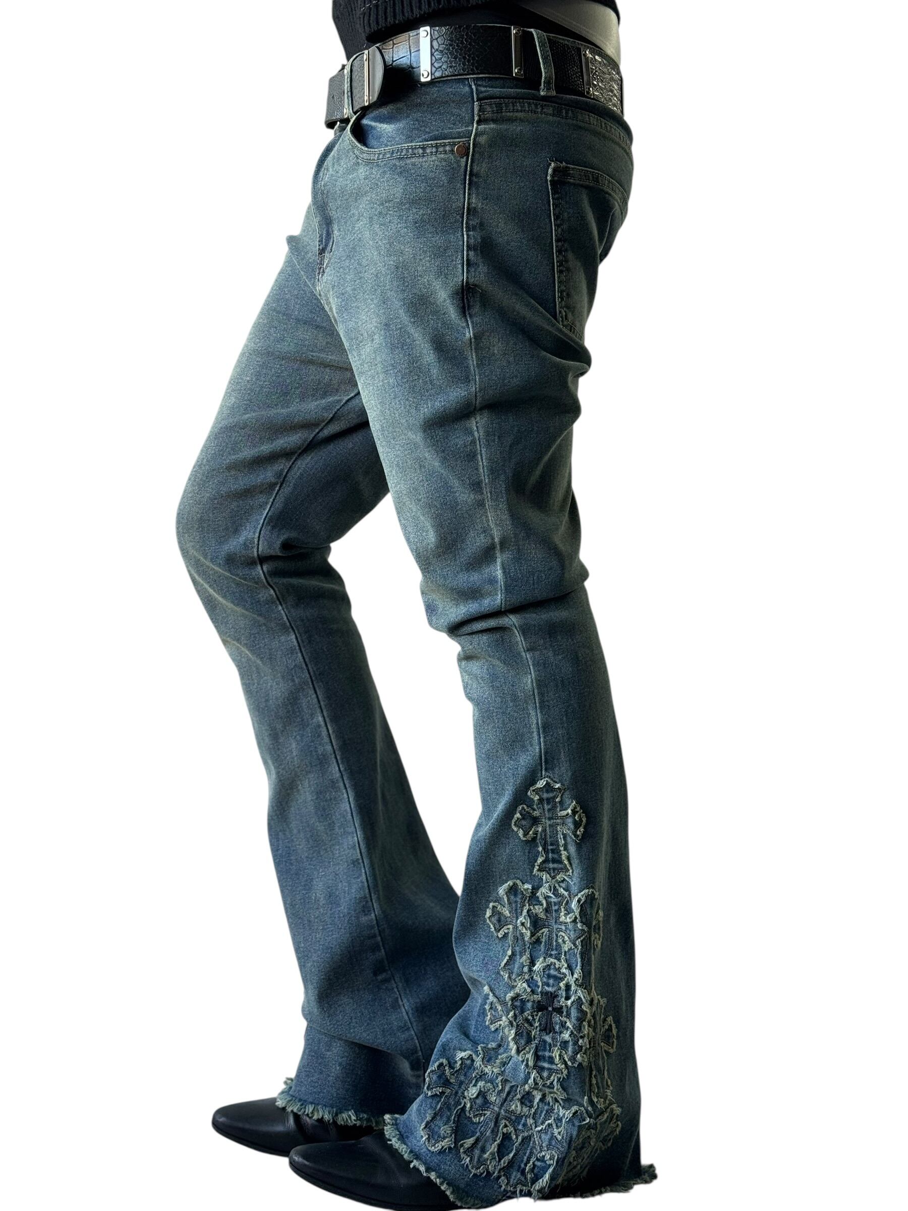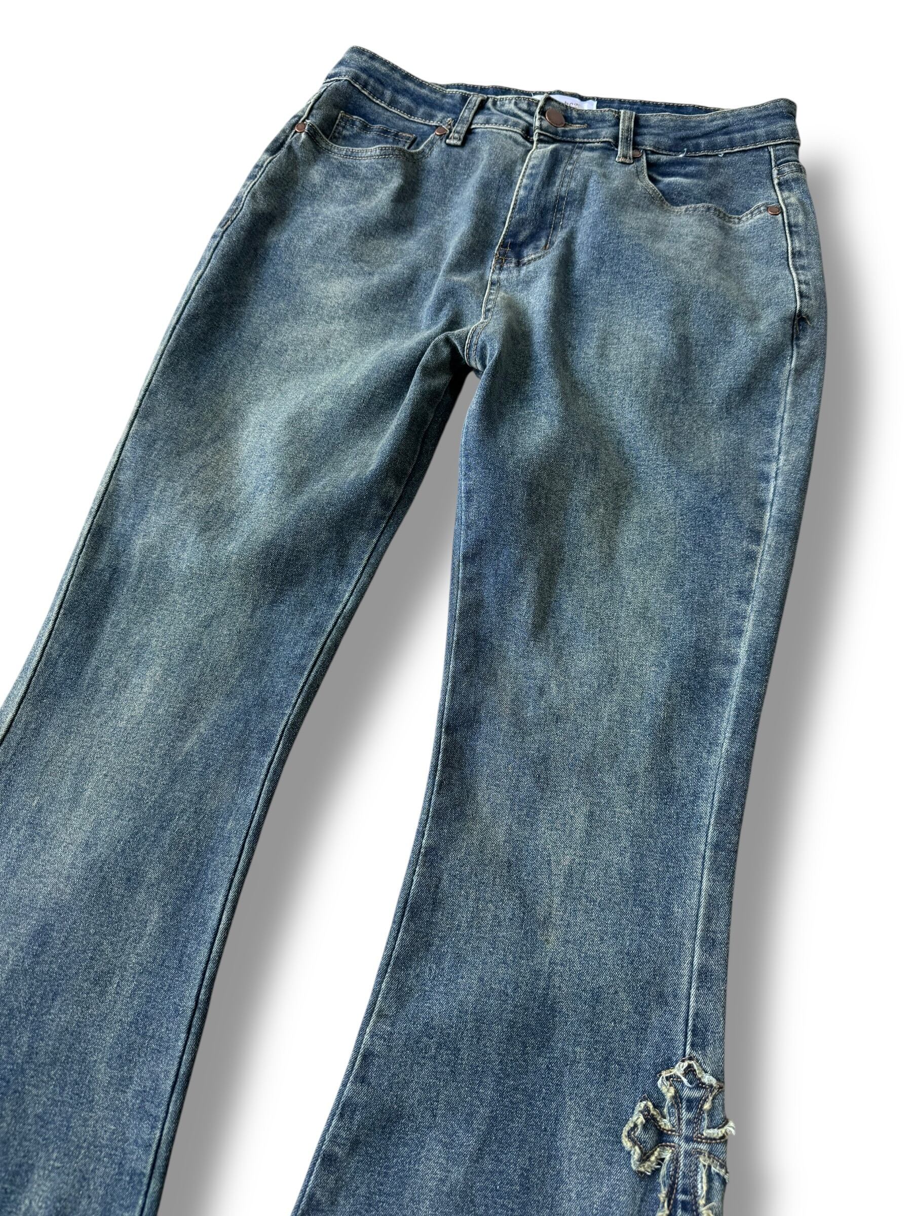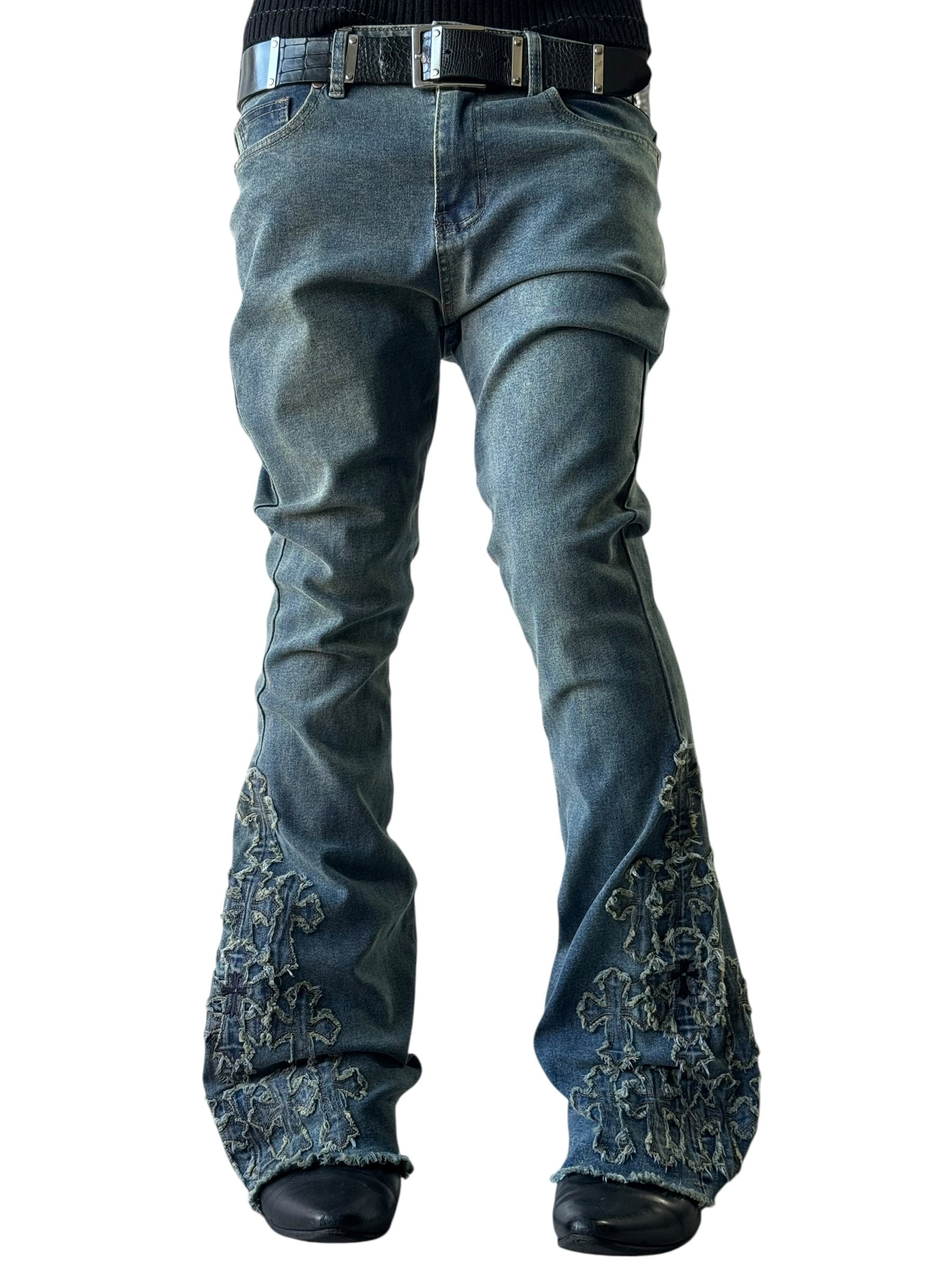 ♾️Bamboo♾️ Many cross patch design flared silhouette denim pants