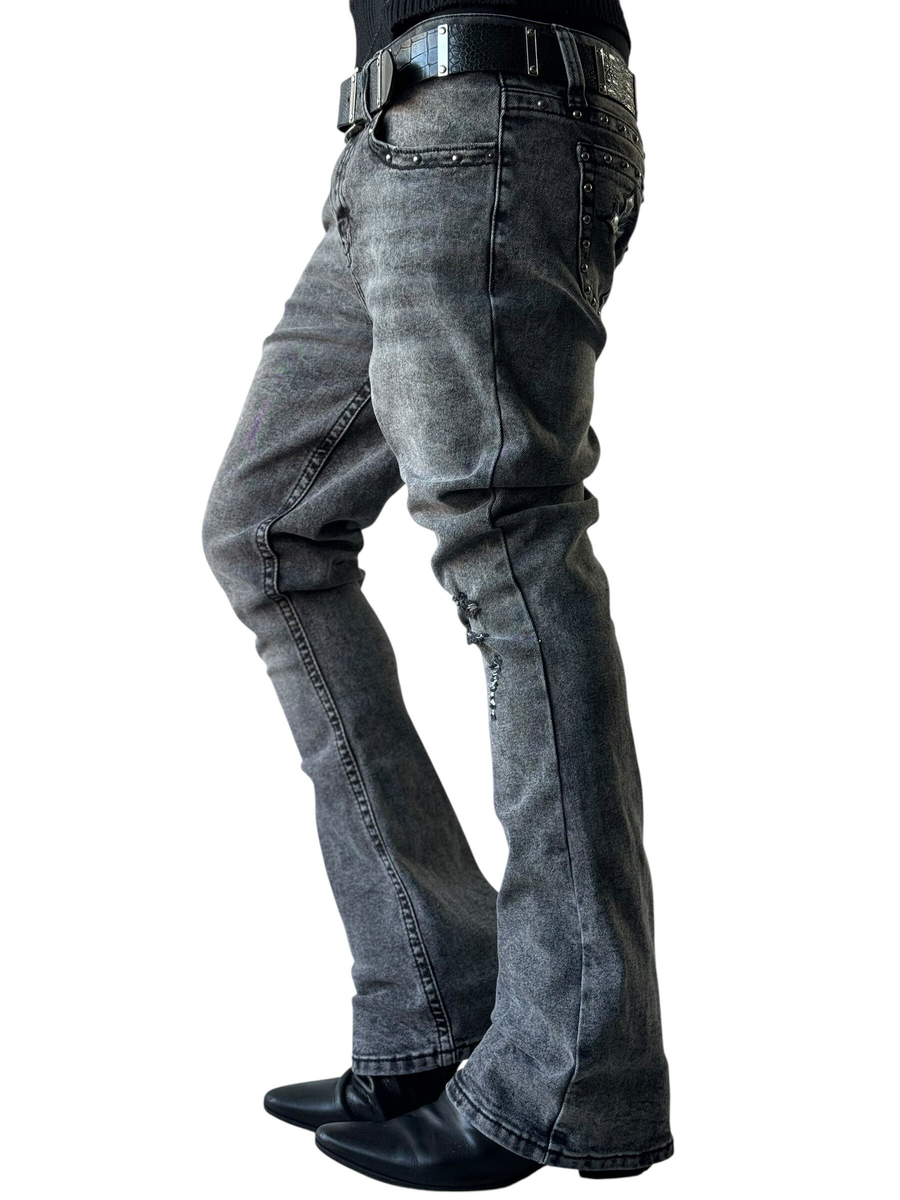 Back cross embroidered stud design flared silhouette denim pants