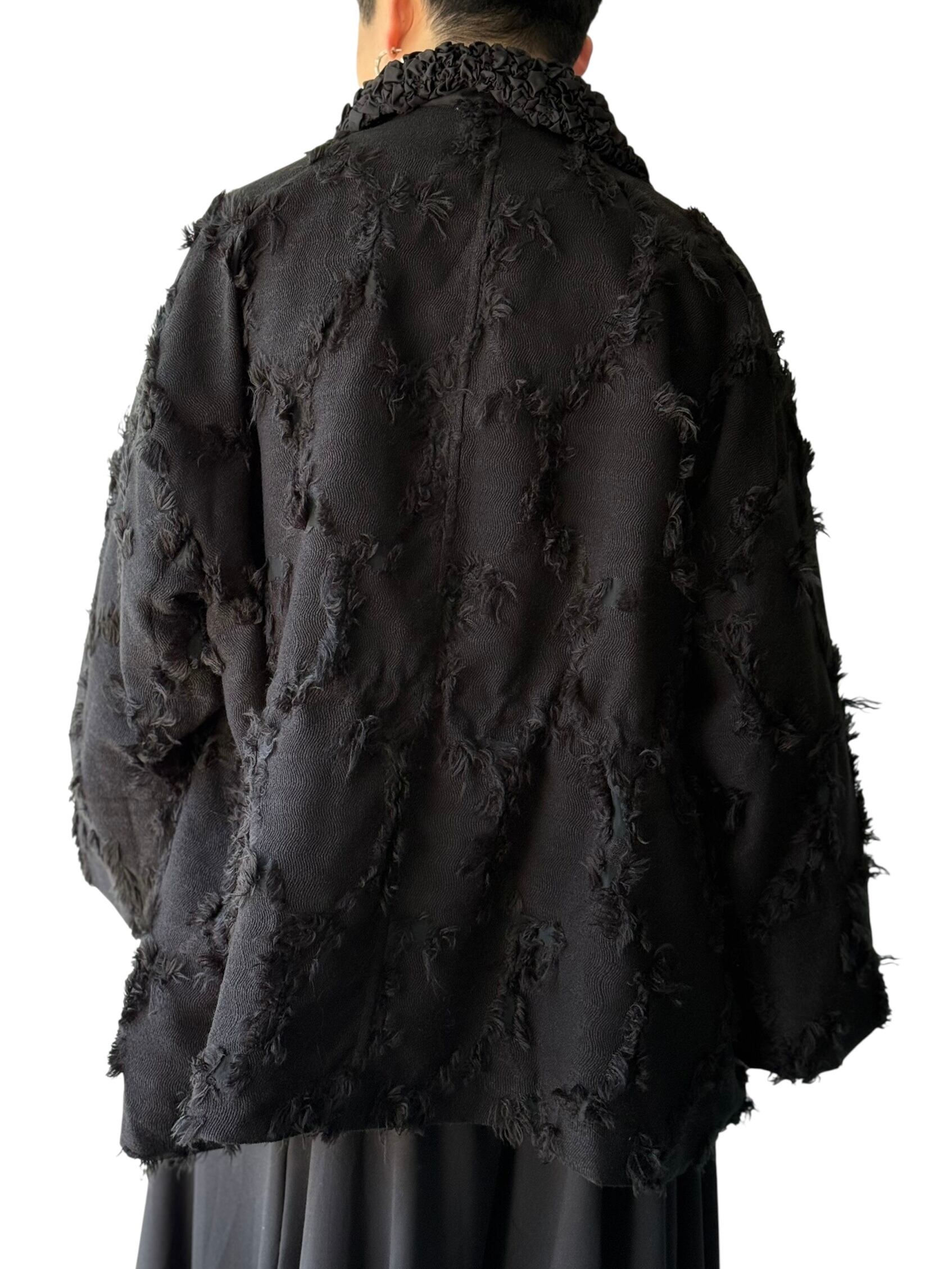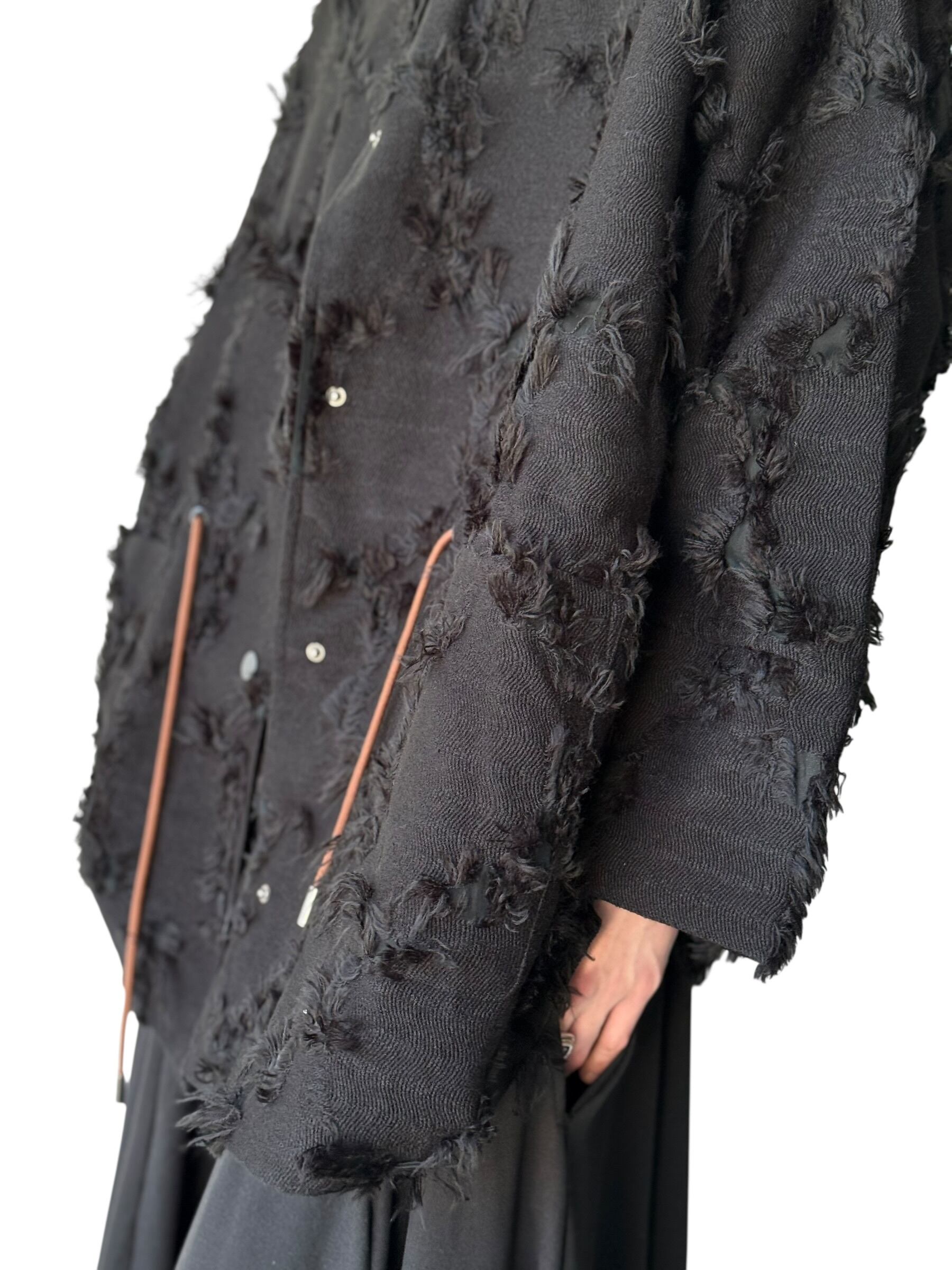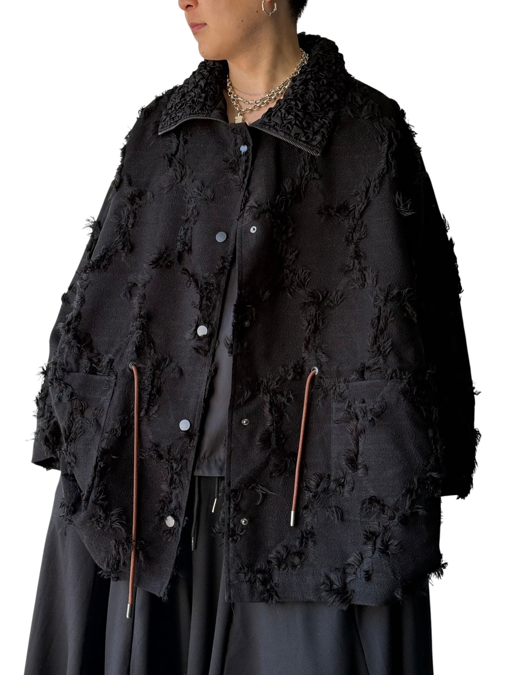 【WYNNE】Jacquard shaggy hair sheer design collarless wide jacket