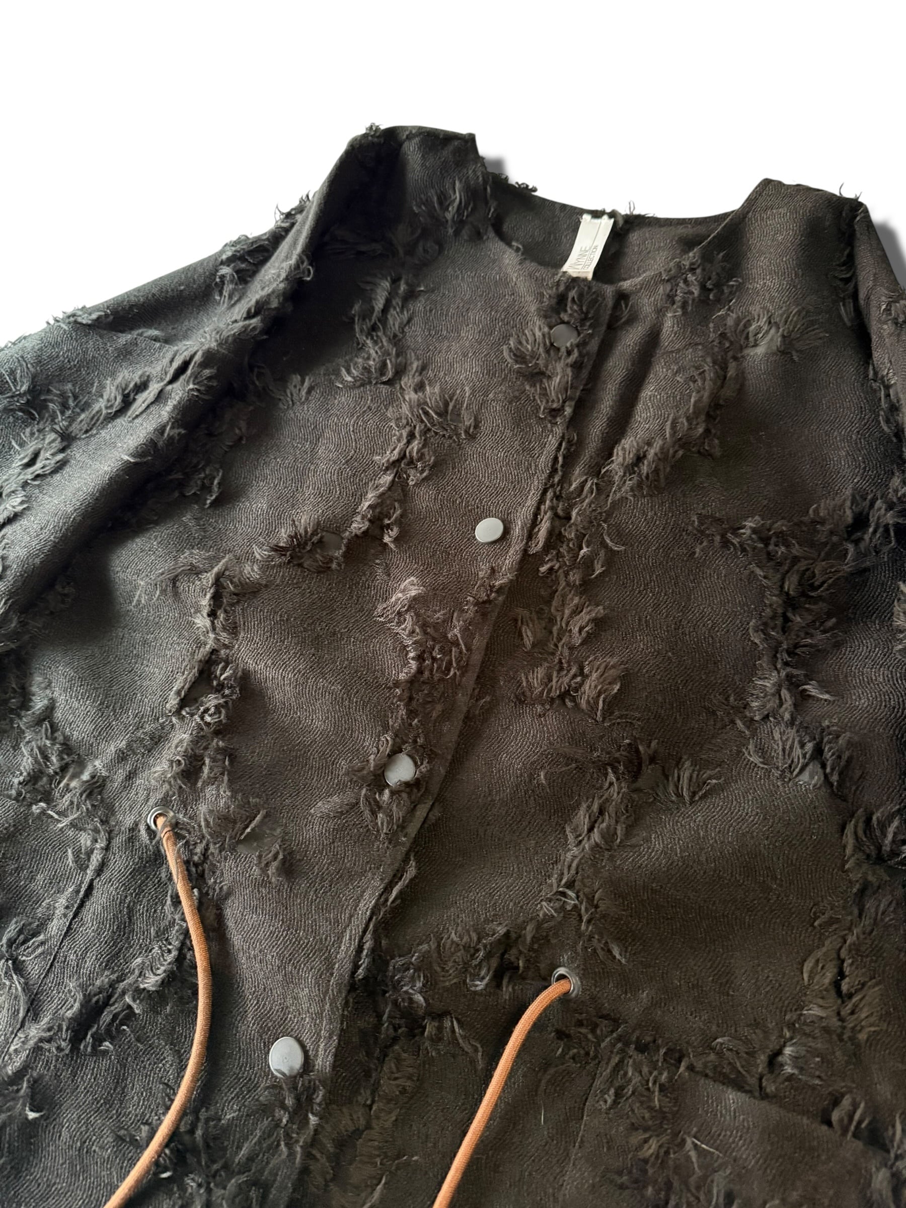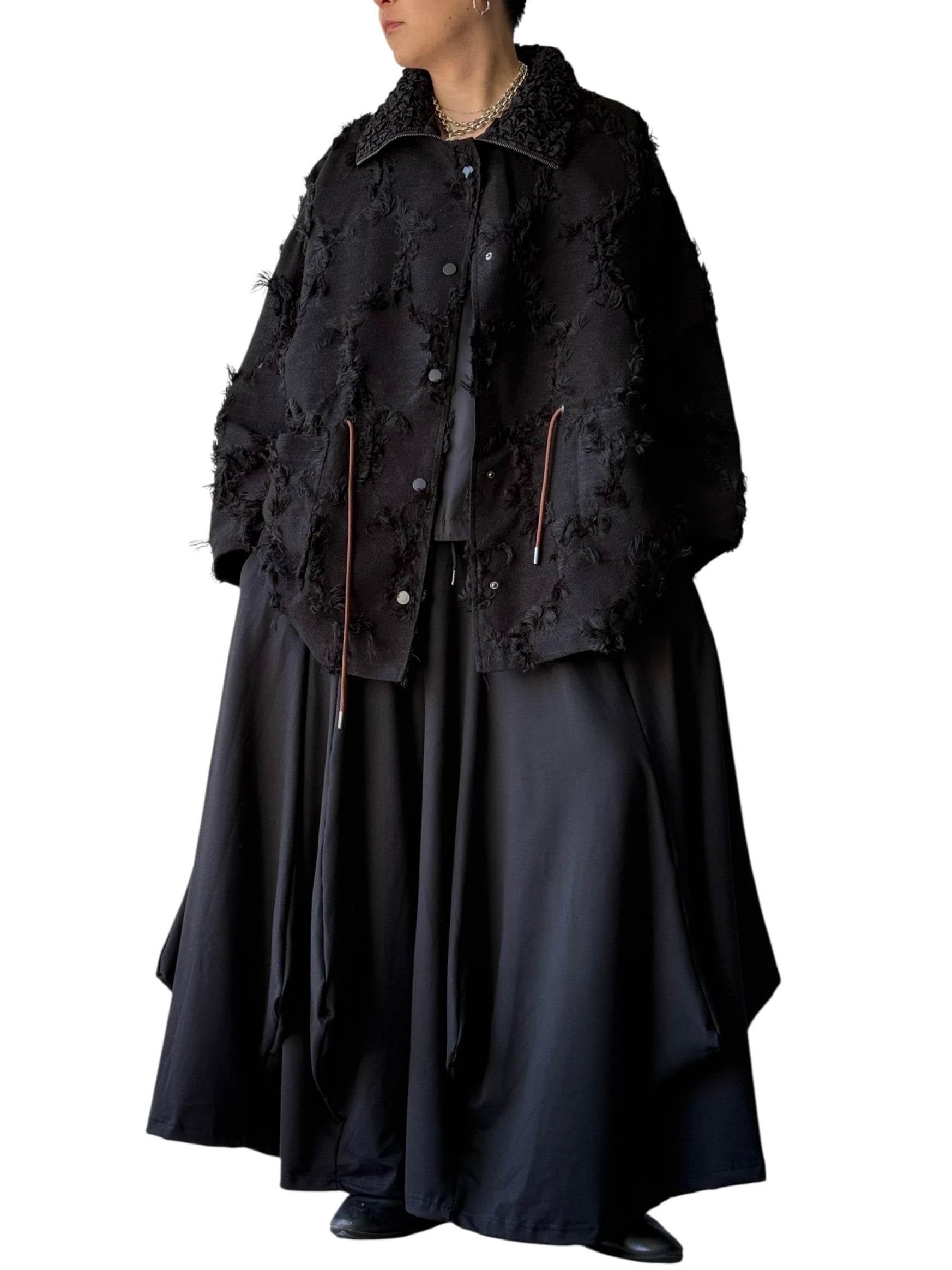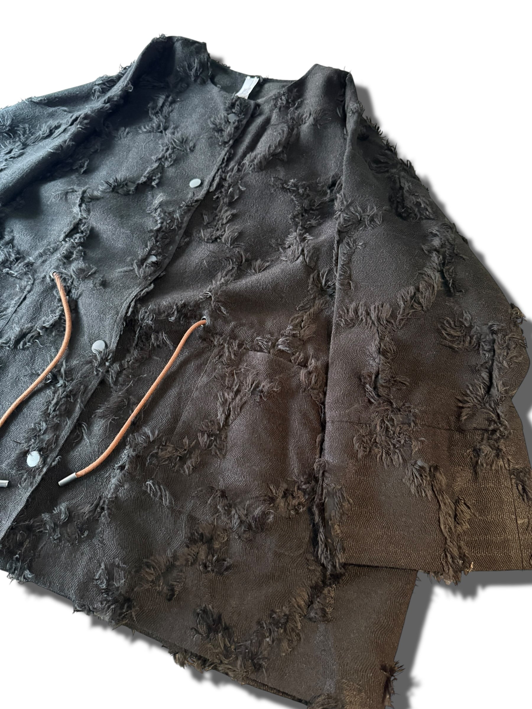 【WYNNE】Jacquard shaggy hair sheer design collarless wide jacket