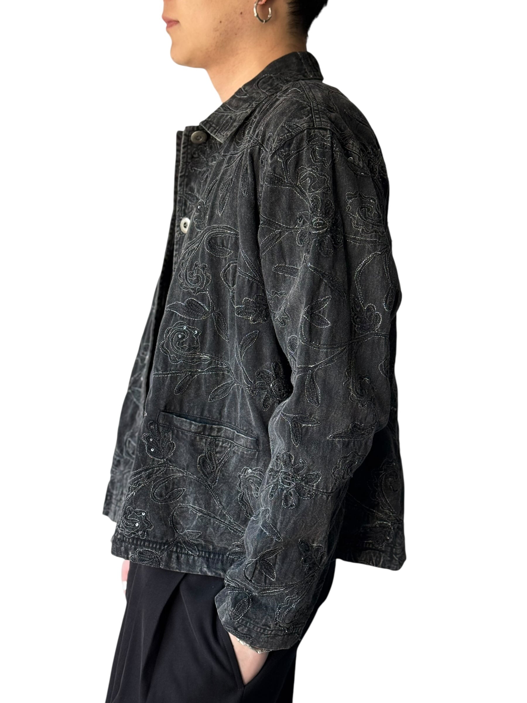 Floral embroidered black denim short jacket