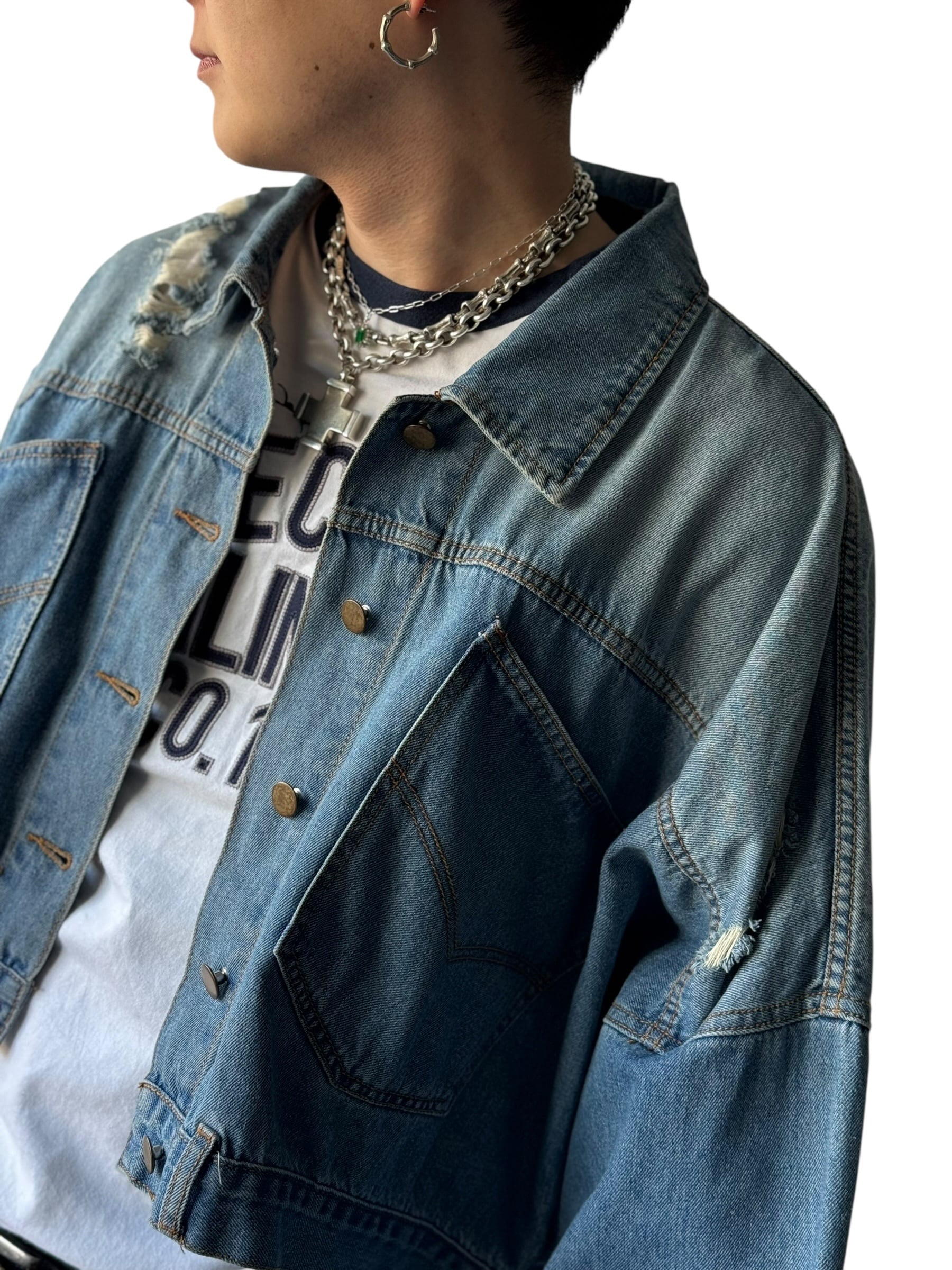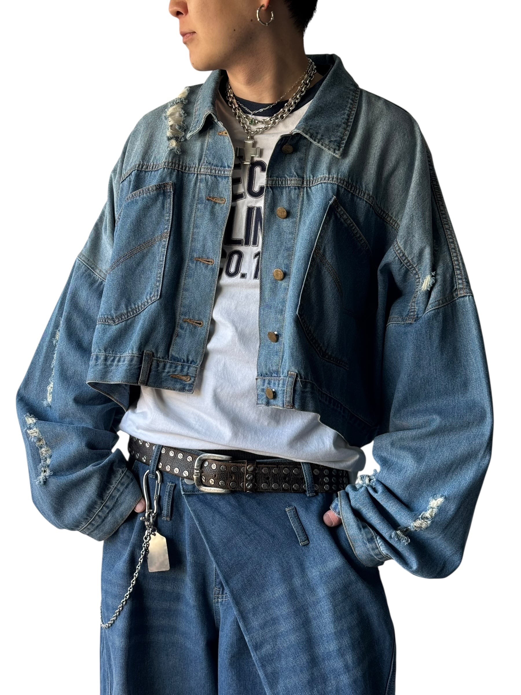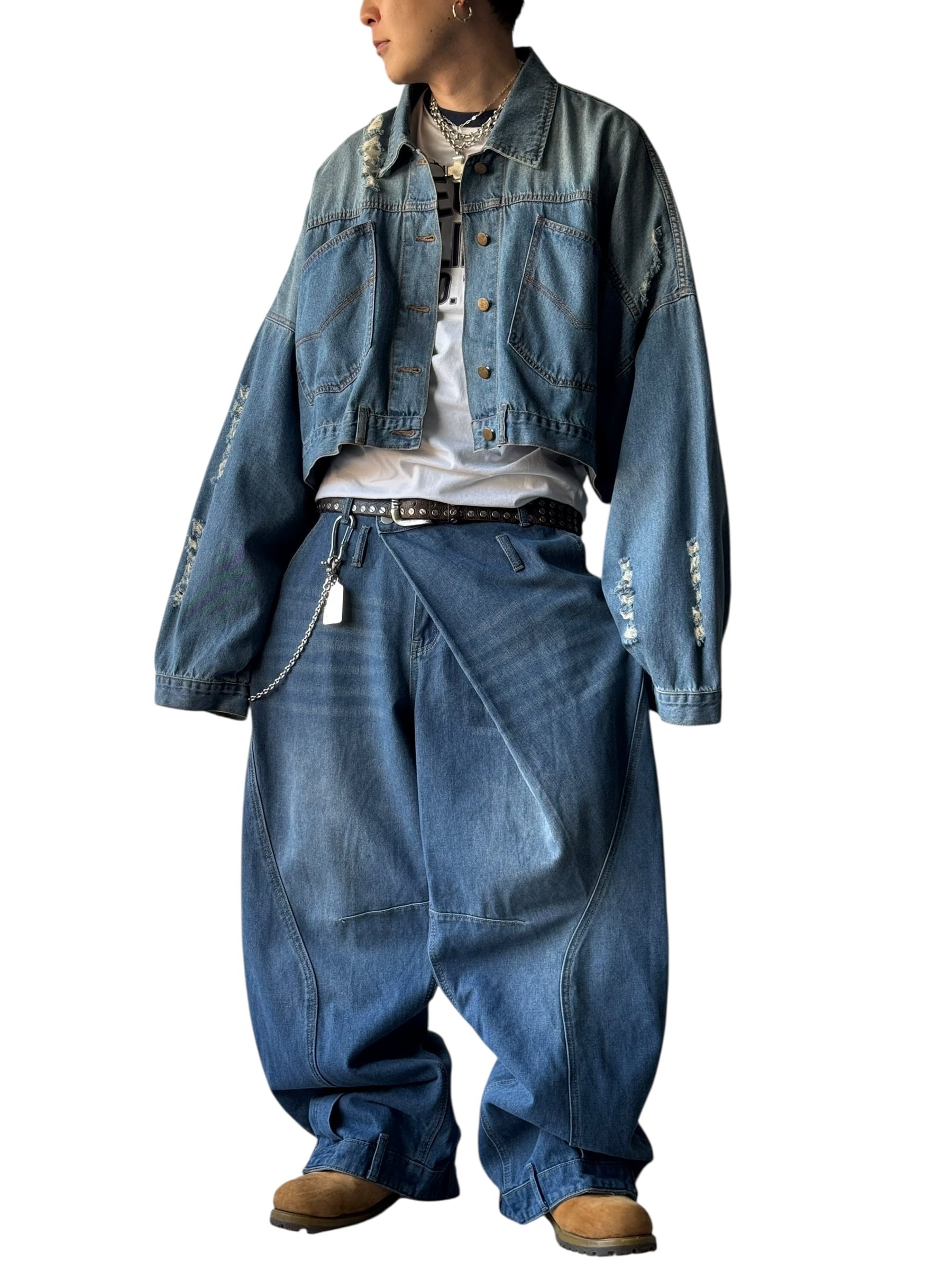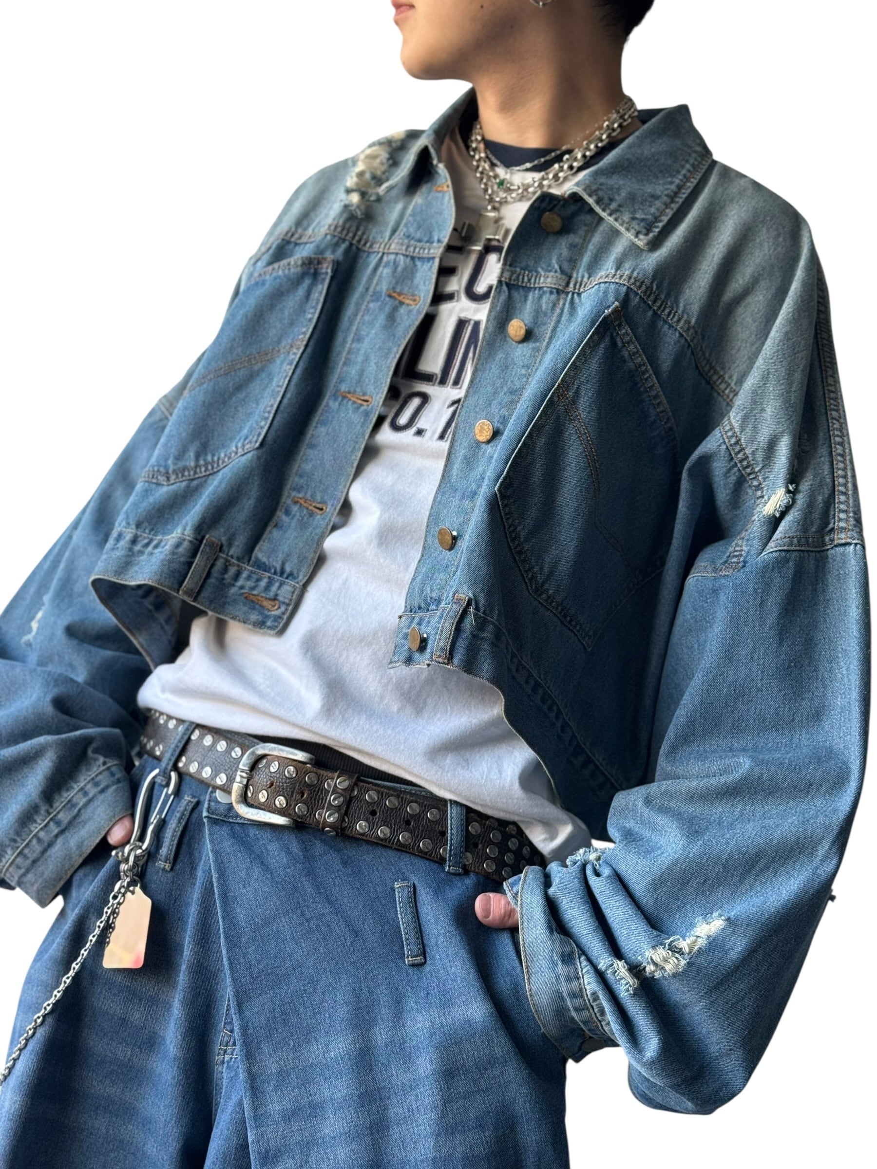 通常にくらべ短く切り落とされたハイパークロップド丈がかなり特徴的なシルエットとなっており全体的に施されたグランジテイストがクールなダメージ加工だったりフロントの大振りなポケットがアクセントになったセンス抜群のデザイン‼️
