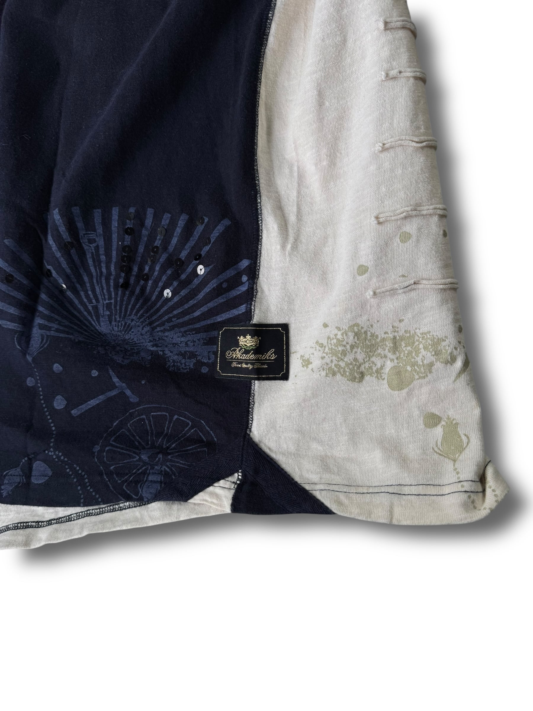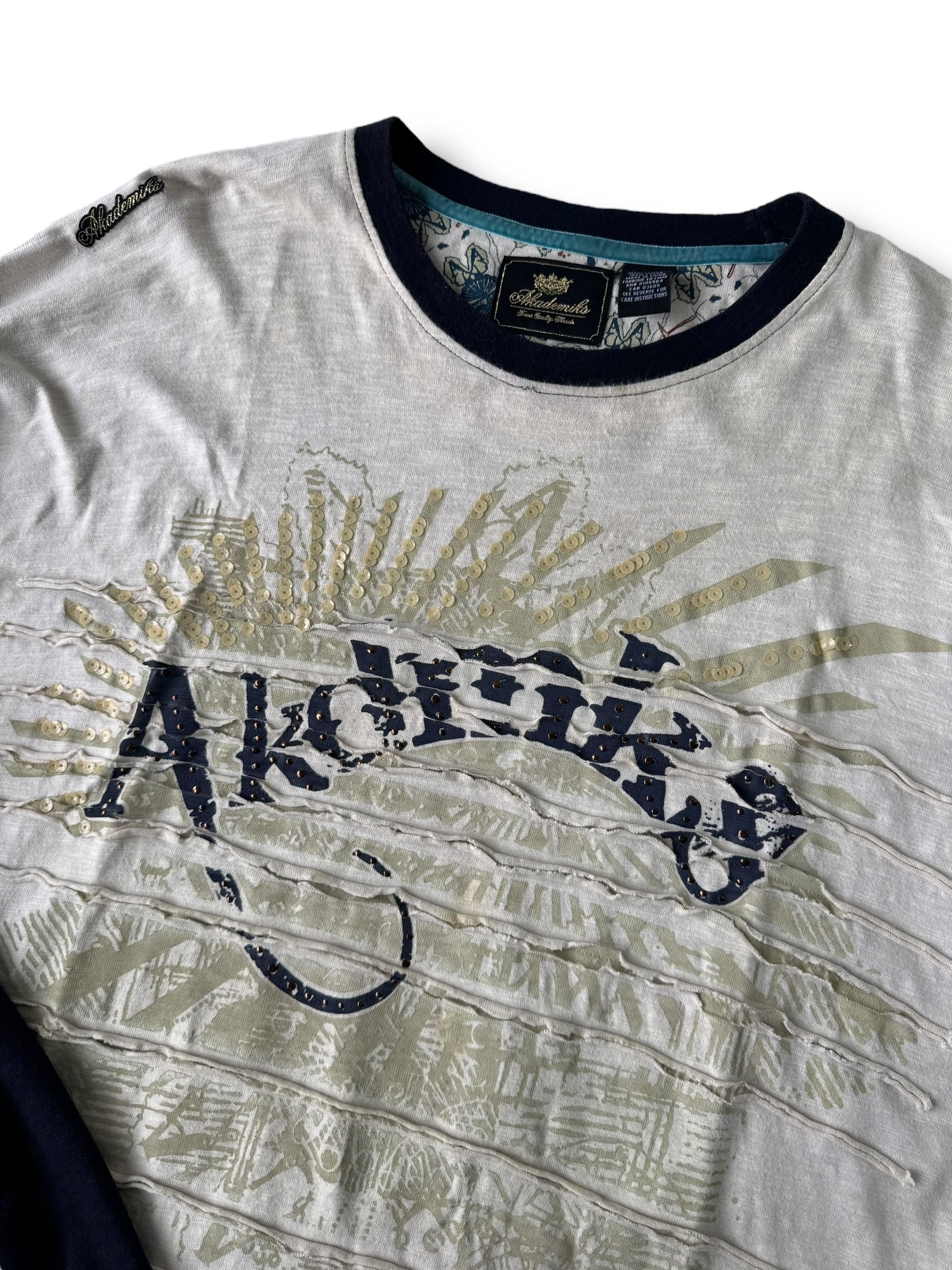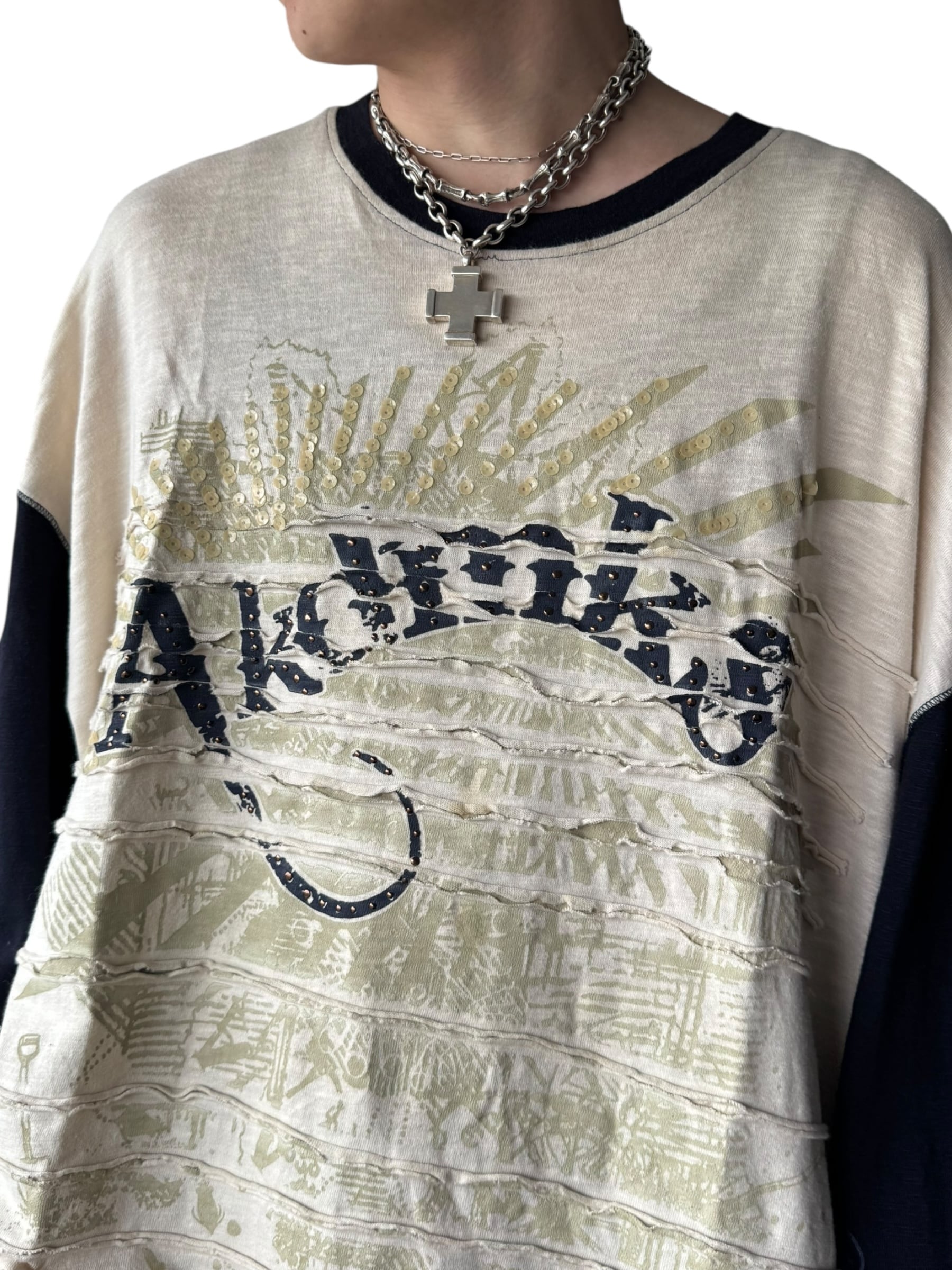 フロントにはエンジンのデザインの上からブランドロゴがプリントされており、さらにスパンコールが縫い付けられ、ツギハギ状のデザインになっているめためたにクールなデザイン✨️✨️