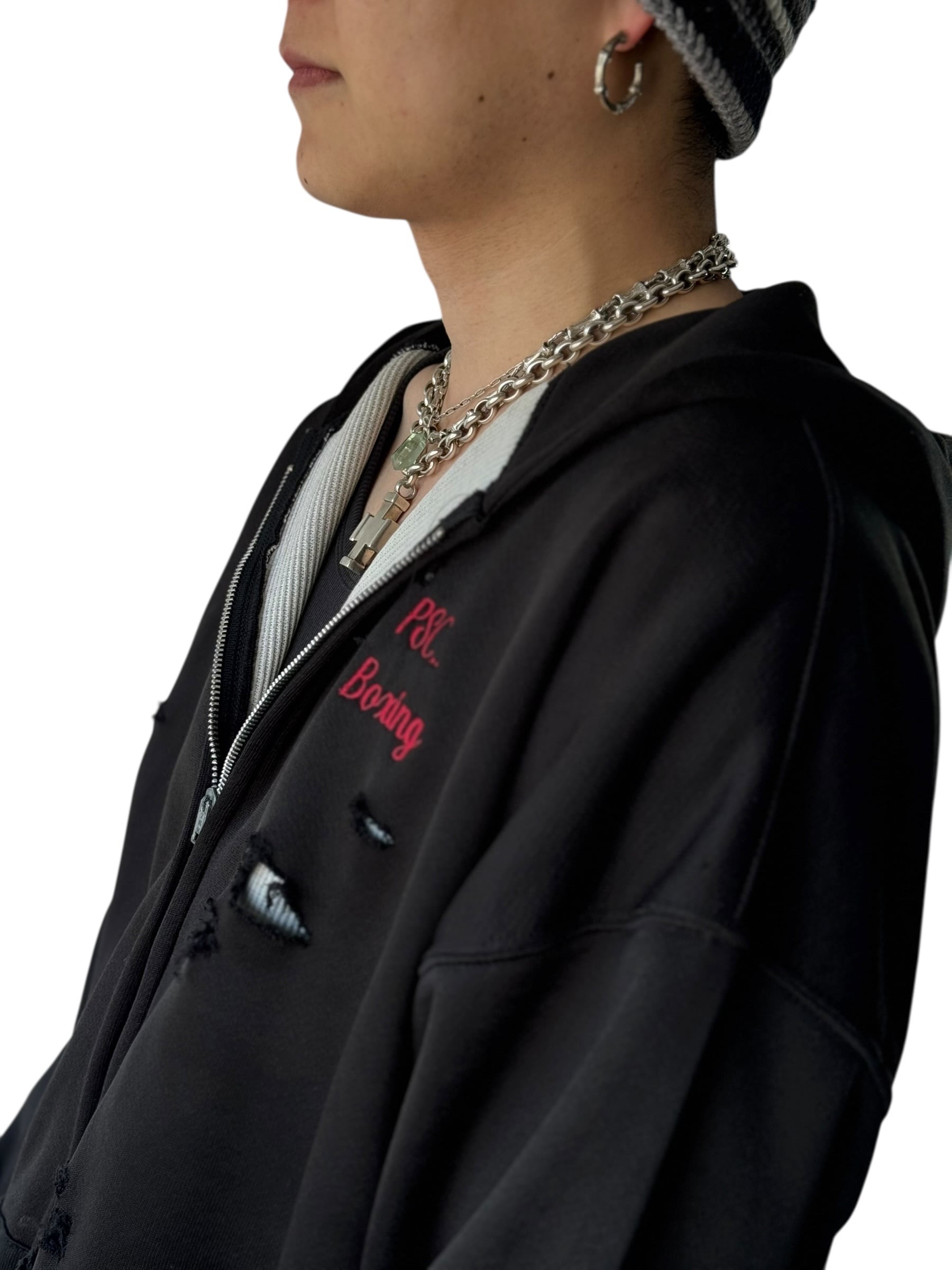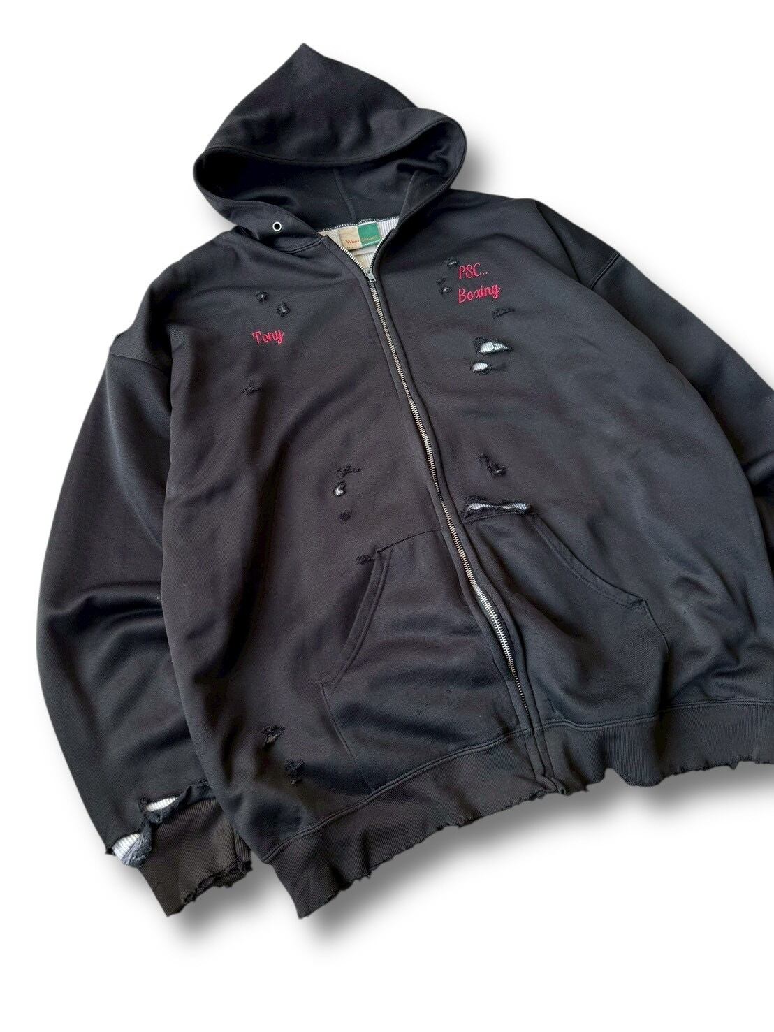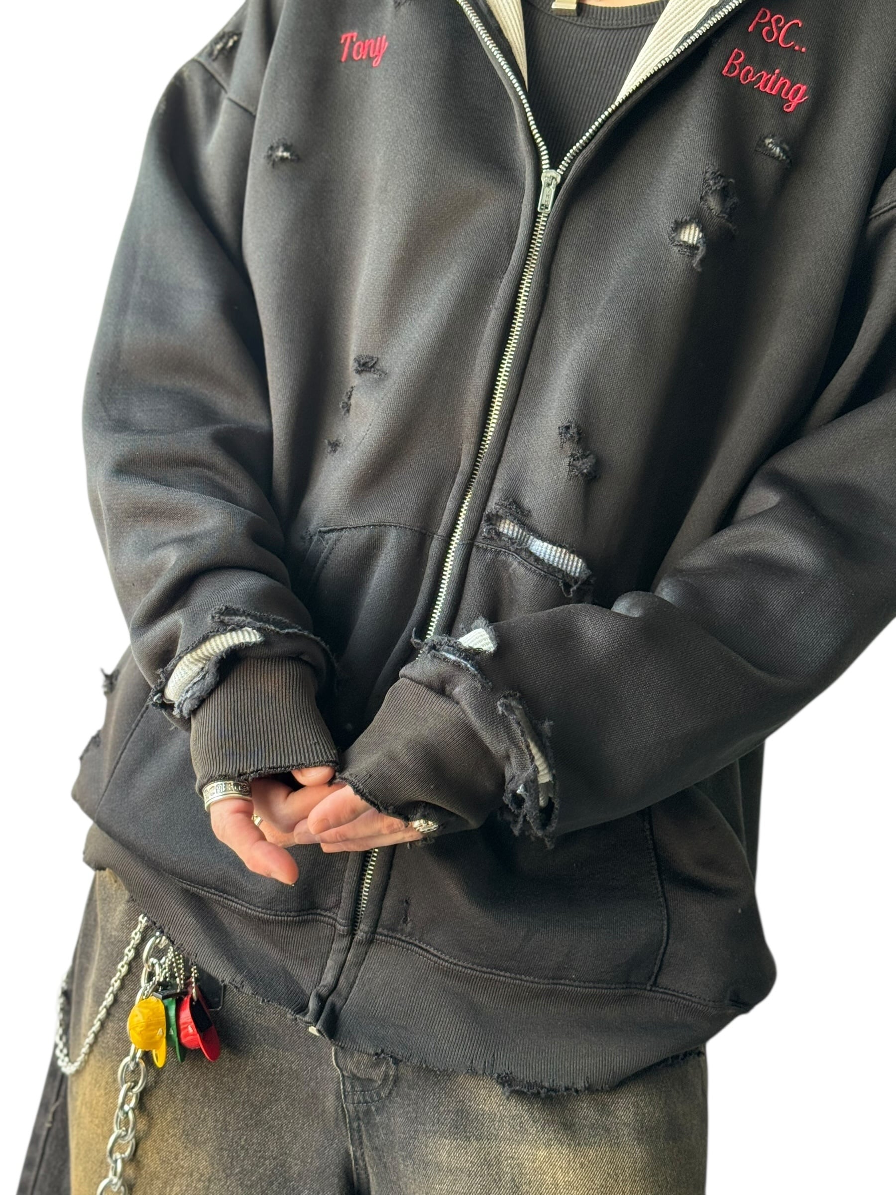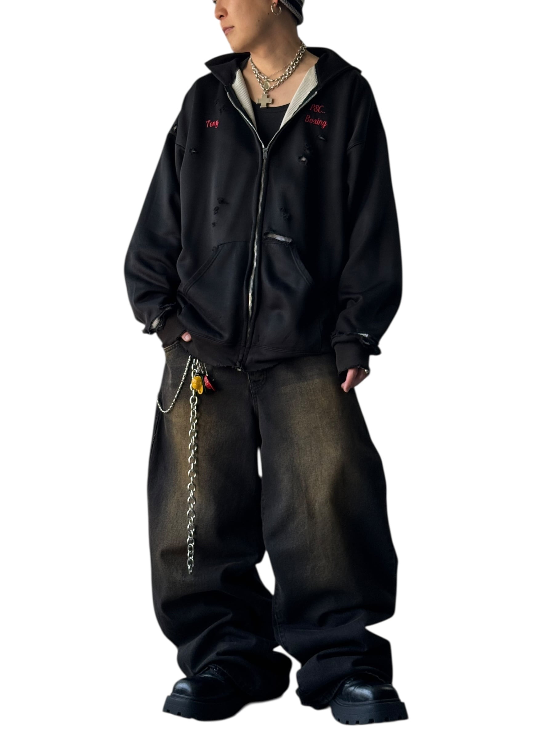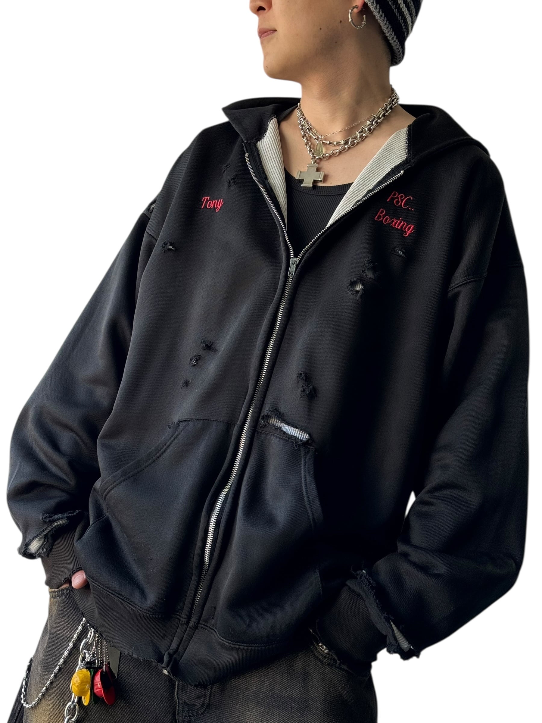 ブラックボディに映える胸元の刺繍に加えて全体に施されたダメージ加工がいいアクセントになっており裏地からサーマルが覗く使用がデザイン性あって最高に雰囲気いい感じ‼️