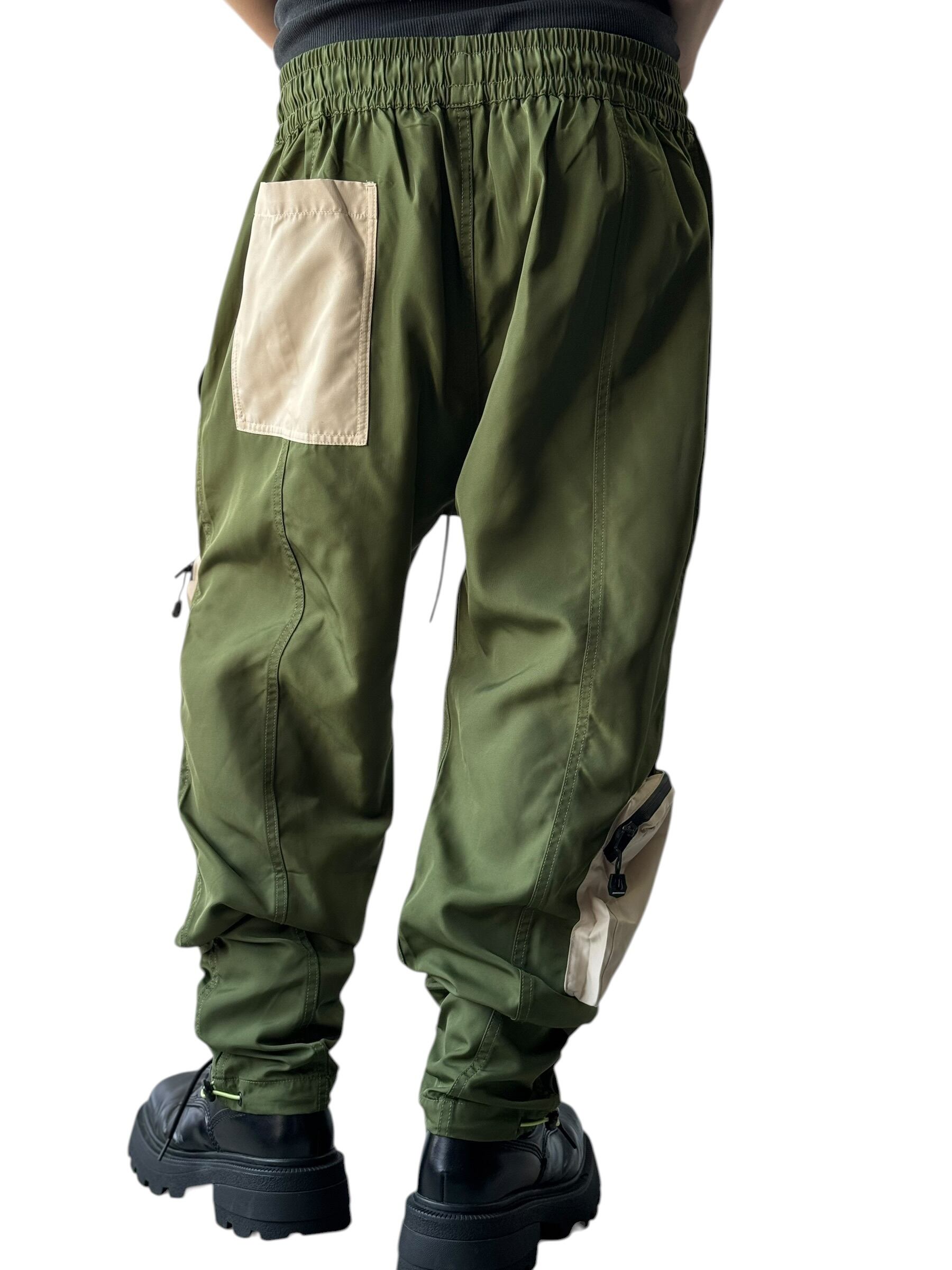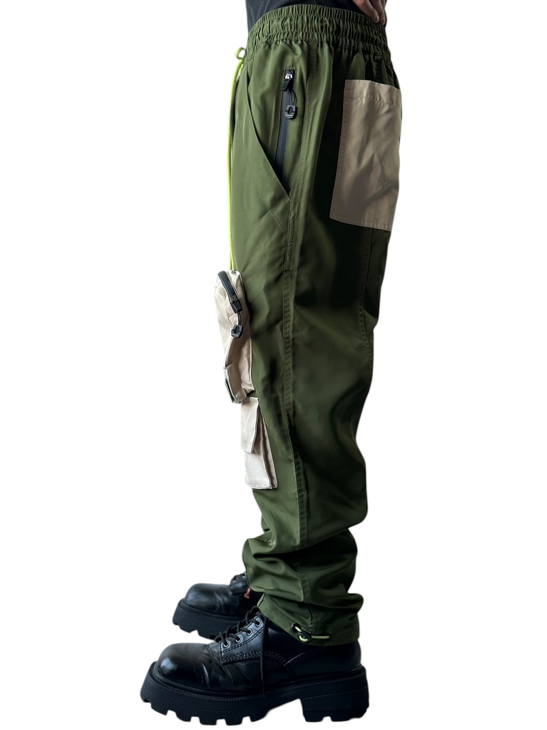 シブめなお抹茶カラーをボディにベージュの立体ポケット、ウエストのネオン味あるグリーンが最高にいいコントラストとなっており目を引く配色がコーデのポイントに✨️✨️