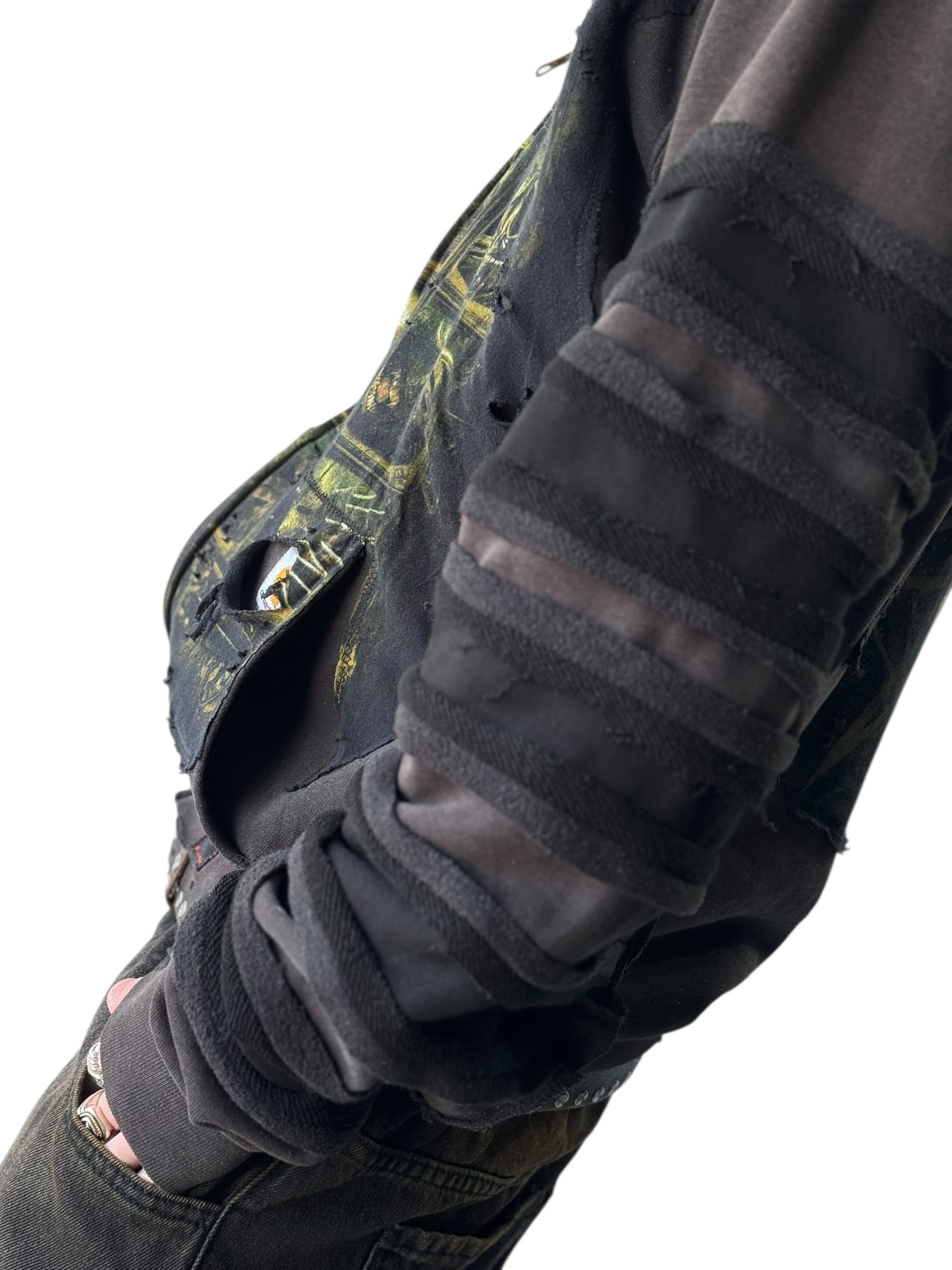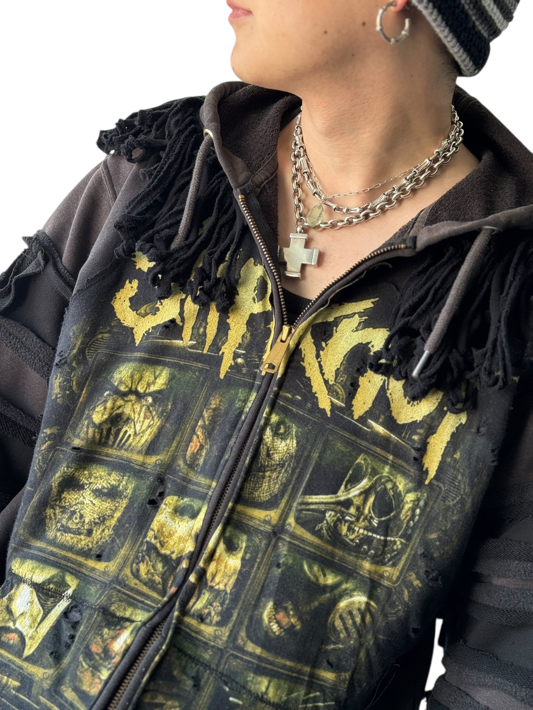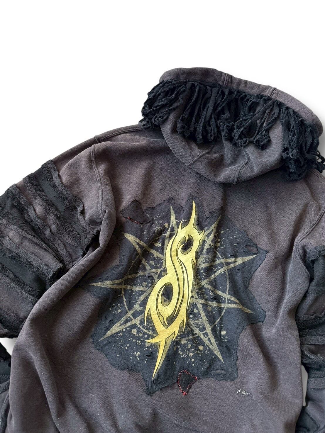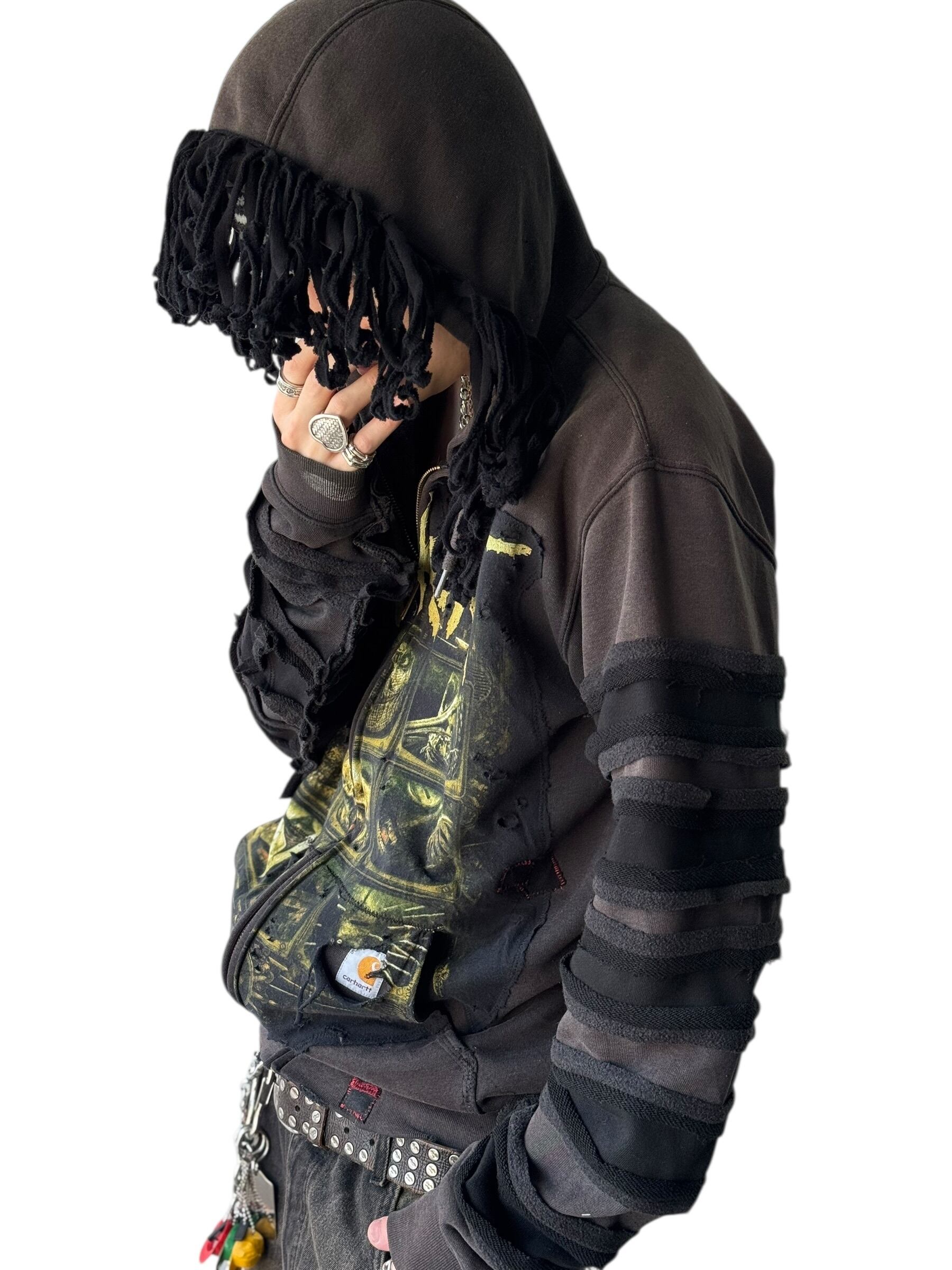 グッドフェードな色味とさり気ないダメージ加工がめちゃめちゃクールな個体に、SlipKnoT バチ映えピースをカスタムしたデザインジップアップフリンジデザインフーディーの入荷‼️