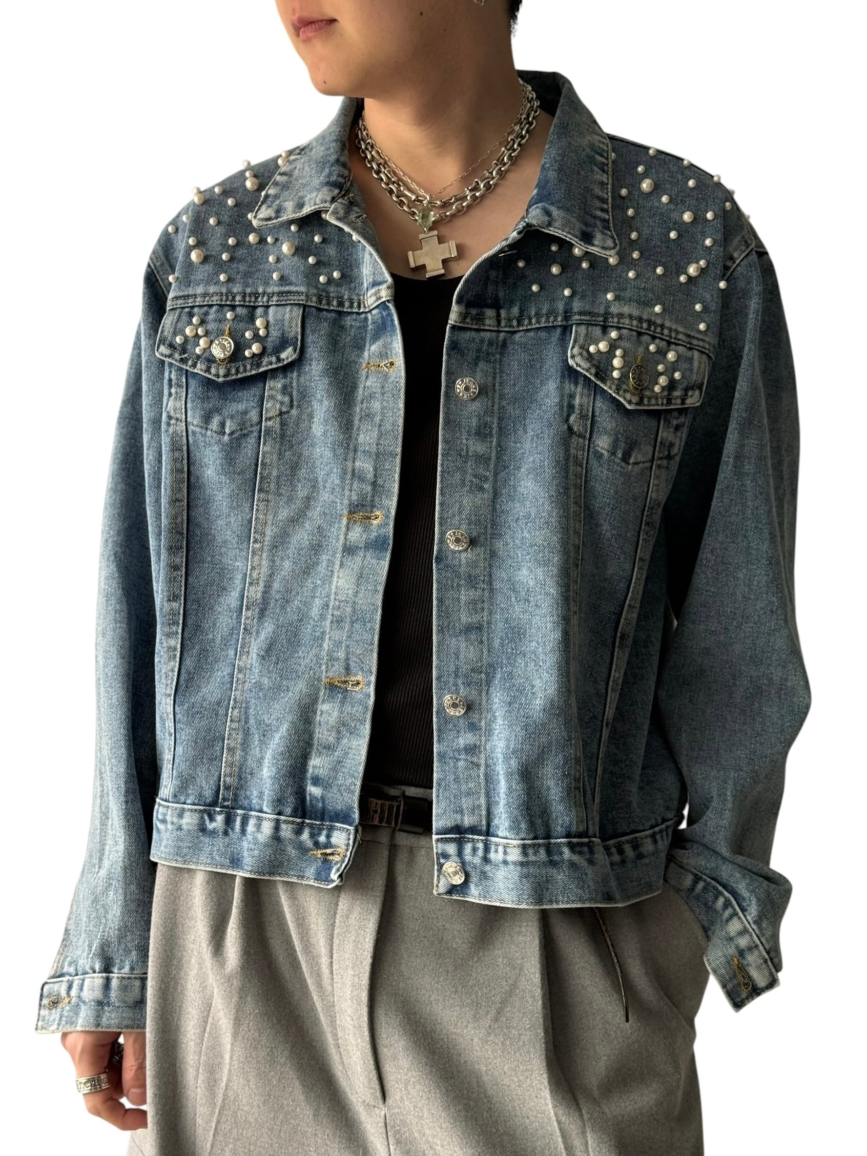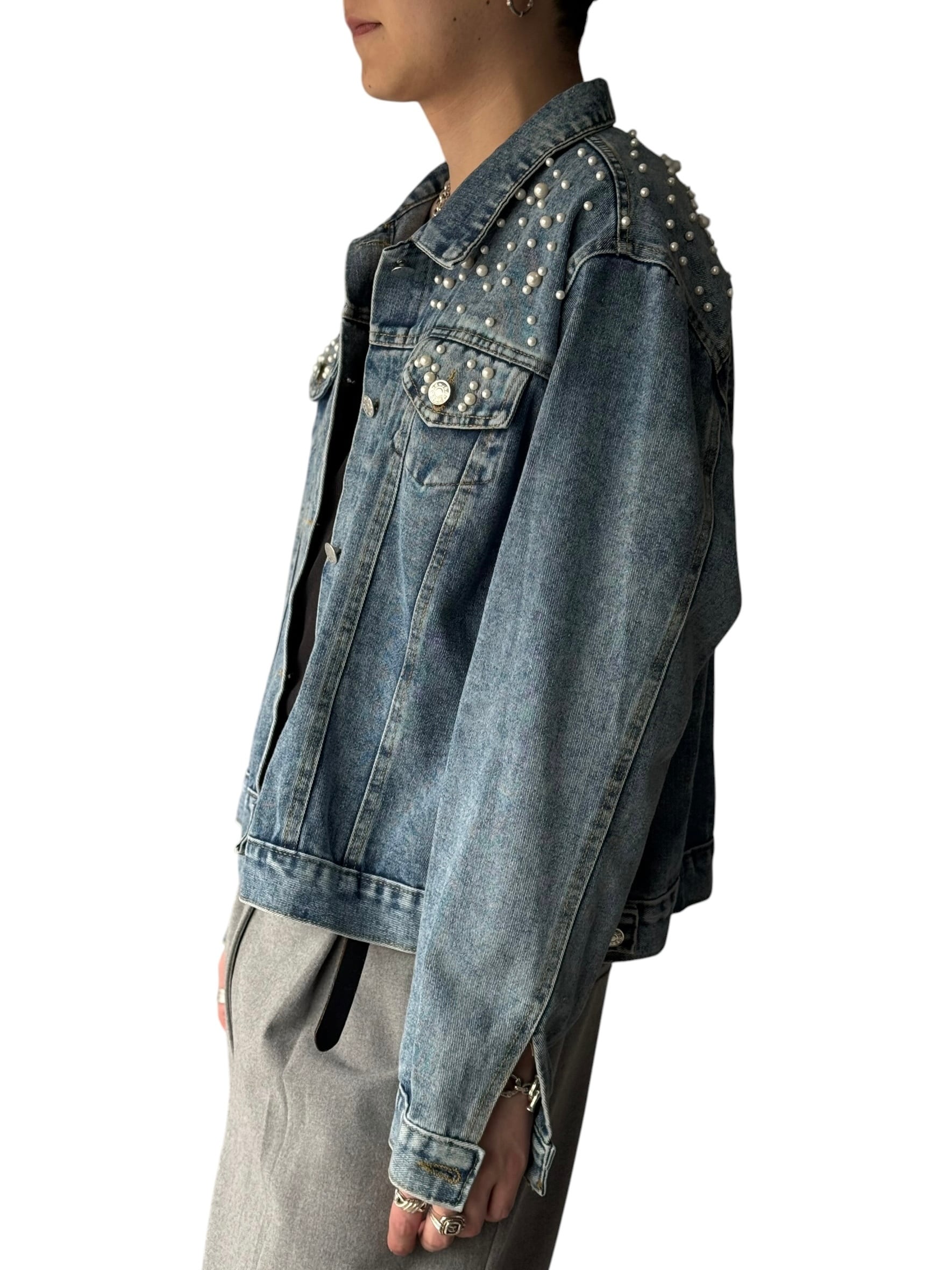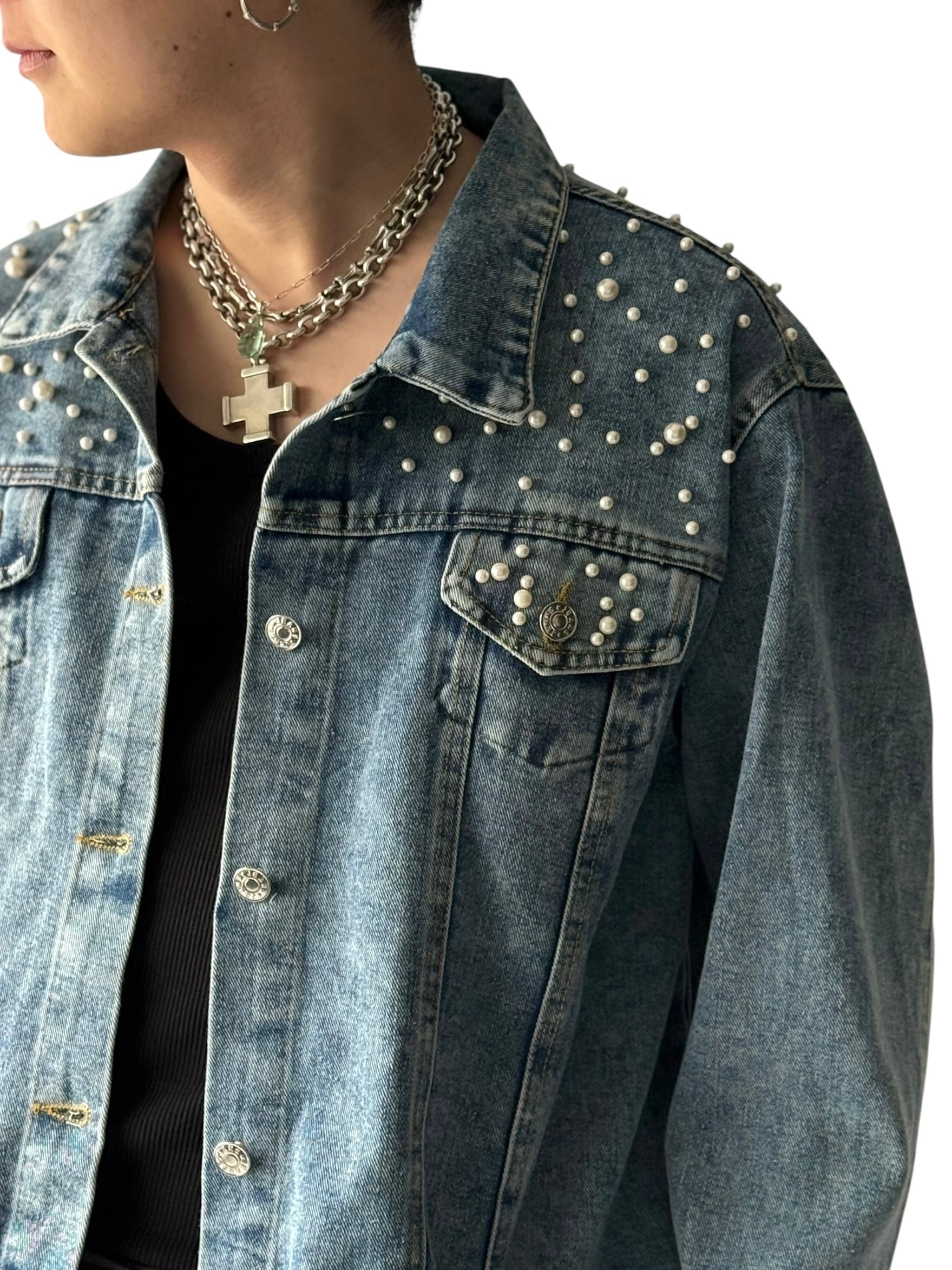 癖のないスタンダードなデニムジャケットのフォルムにパールを大胆に散りばめ、特別感のある仕上がり⭕️