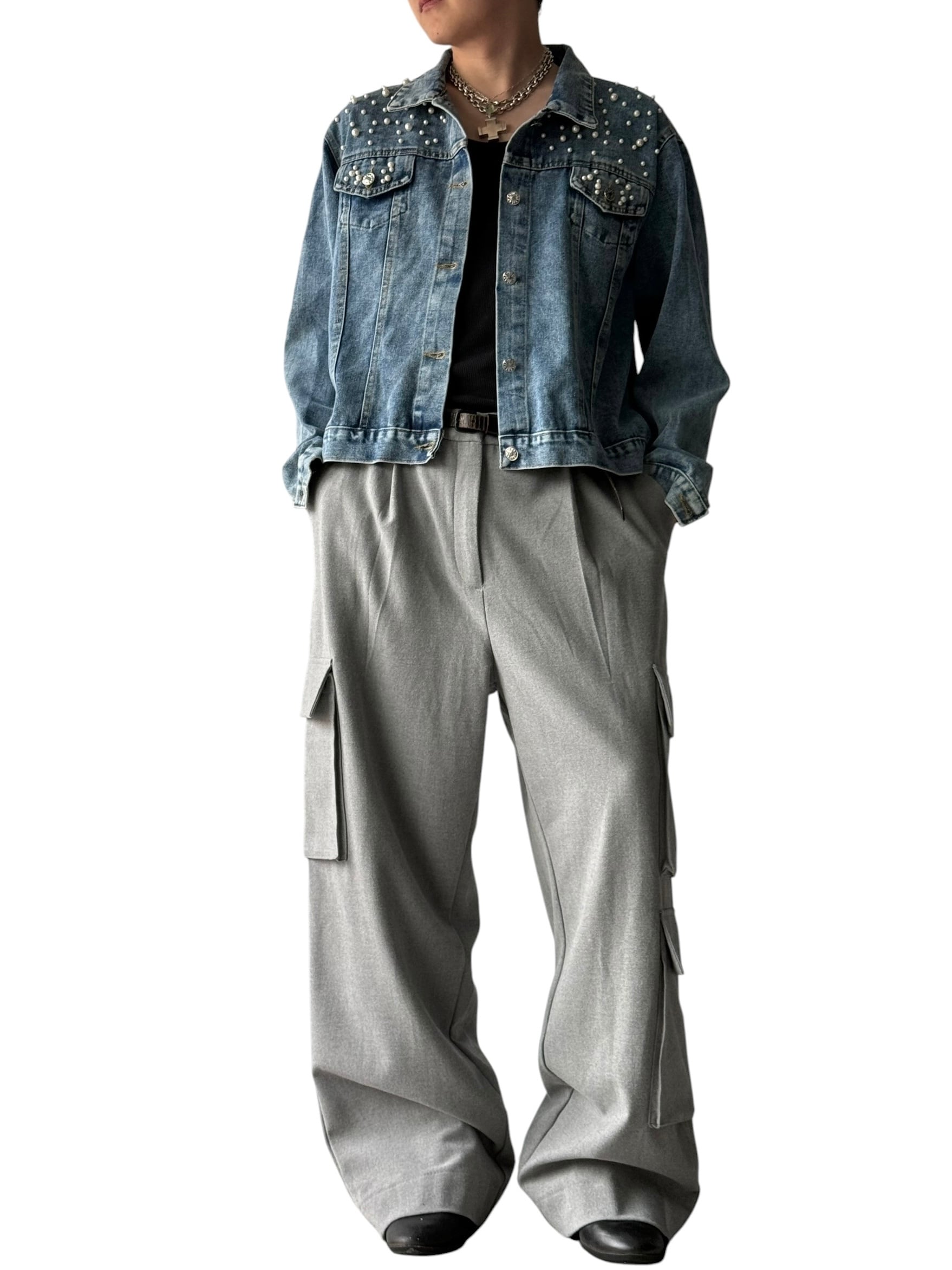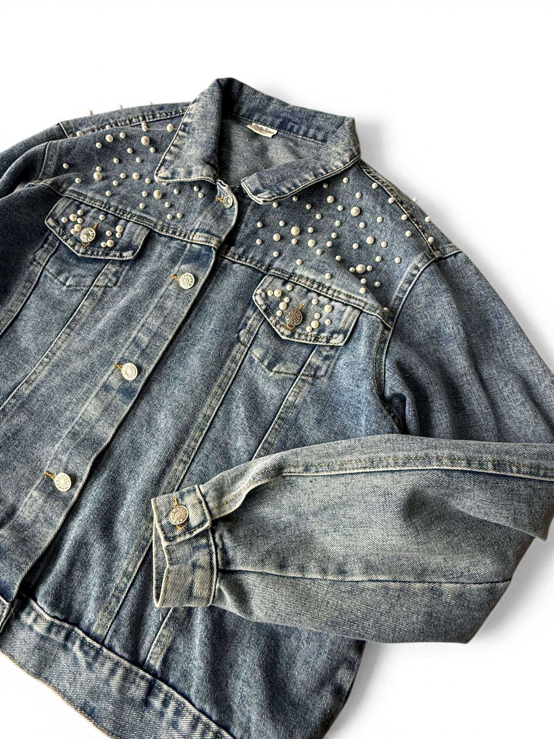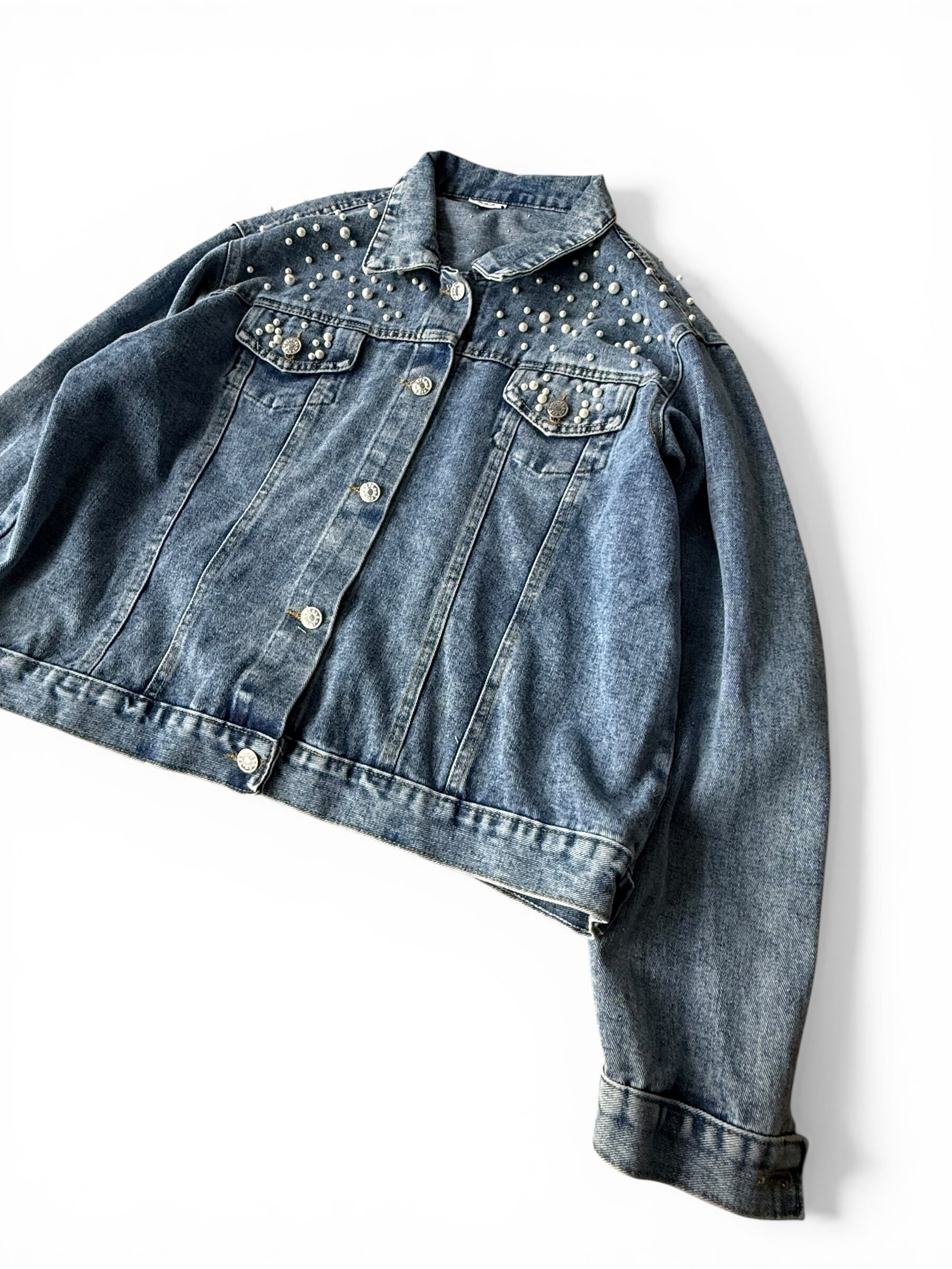 癖のないスタンダードなデニムジャケットのフォルムにパールを大胆に散りばめ、特別感のある仕上がり⭕️